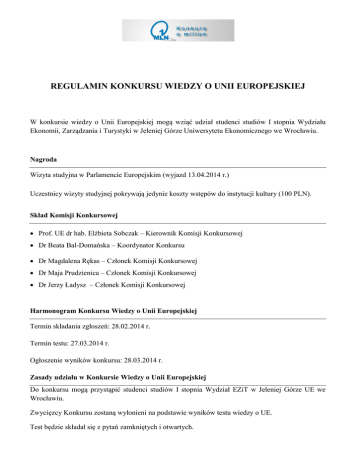 REGULAMIN KONKURSU WIEDZY O UNII EUROPEJSKIEJ W konkursie wiedzy o Unii Europejskiej mogą wziąć udział studenci studiów I stopnia Wydziału Ekonomii, Zarządzania i Turystyki w Jeleniej Górze Uniwersytetu Ekonomicznego we Wrocławiu. Nagroda Wizyta studyjna w Parlamencie Europejskim (wyjazd 13.04.2014 r.) Uczestnicy wizyty studyjnej pokrywają jedynie koszty wstępów do instytucji kultury (100 PLN). Skład Komisji Konkursowej Prof. UE dr hab. Elżbieta Sobczak – Kierownik Komisji Konkursowej Dr Beata Bal-Domańska – Koordynator Konkursu Dr Magdalena Rękas – Członek Komisji Konkursowej Dr Maja Prudzienica – Członek Komisji Konkursowej Dr Jerzy Ładysz – Członek Komisji Konkursowej Harmonogram Konkursu Wiedzy o Unii Europejskiej Termin składania zgłoszeń: 28.02.2014 r. Termin testu: 27.03.2014 r. Ogłoszenie wyników konkursu: 28.03.2014 r. Zasady udziału w Konkursie Wiedzy o Unii Europejskiej Do konkursu mogą przystąpić studenci studiów I stopnia Wydział EZiT w Jeleniej Górze UE we Wrocławiu. Zwycięzcy Konkursu zostaną wyłonieni na podstawie wyników testu wiedzy o UE. Test będzie składał się z pytań zamkniętych i otwartych. 2 Test odbędzie się w dniu 27.03. 2014 r. w auli budynku A Wydział EZiT w Jeleniej Górze UE we Wrocławiu o godz. 15.00. Prosimy o stawienie się 10 min. przed rozpoczęciem testu. Zagadnienia konkursowe i polecana literatura Zagadnienia: 1/ Geneza i rozwój integracji w Europie. 2/ System instytucjonalny Unii Europejskiej (instytucje i podstawowe kompetencje). 3/ System prawny Unii Europejskiej: źródła prawa unijnego, podstawowe akty prawne, traktaty z Maastricht i Lizbony. 4/ Polityka spójności Unii Europejskiej (spójność społeczna, ekonomiczna i terytorialna w UE). 5/ Budżet Unii Europejskiej (zasady i procedury budżetowe; źródła dochodów i kategorie wydatków). 6/ Perspektywa finansowa na okres programowania 2014-2020 – programy operacyjne. 7/ Strategia Europa 2020. 8/ Droga Polski do UE, w tym bilans transferów. Literatura pomocnicza: 1/ Nugent N., Unia Europejska, Wyd. Uniwersytetu Jagiellońskiego, Kraków 2012. 2/ Barcz J., Kawecka-Wyrzykowska E., Michałowska-Gorywoda K. (2007), Integracja europejska, wydanie 2, Wolters Kluwer Polska Sp. z o.o., Warszawa. 3/ Europa 2020. Strategia na rzecz inteligentnego i zrównoważonego rozwoju sprzyjającego włączeniu społecznemu, Komisja Europejska, KOM(2010) 2020, Bruksela 3.03.2010 (http://www.mg.gov.pl/files/upload/8418/Strategia%20Europa%202020.pdf). 4/ Ładysz J. (2008), Polityka strukturalna Polski i Unii Europejskiej, PWE, Warszawa. 5/ Wersje skonsolidowane Traktatu o Unii Europejskiej i Traktatu o funkcjonowaniu Unii Europejskiej oraz Karta praw podstawowych Unii Europejskiej, Rada Unii Europejskiej, Bruksela 28.05.2010. Źródła internetowe: 1/ Europejski Bank Centralny, http://www.ecb.europa.eu/home/html/index.en.html 2/ Eurostat, http://epp.eurostat.ec.europa.eu/portal/page/portal/eurostat/home/ 3/ Portal Unii Europejskiej, http://europa.eu/index_en.htm 4/ Komisja Europejska, http://ec.europa.eu/index_en.htm 5/ Parlament Europejski, http://www.europarl.europa.eu/ 3 6/ Programowanie finansowe i budżet, http://ec.europa.eu/budget/biblio/documents/2014/2014_en.cfm Zgłoszenia Zgłoszenia do konkursu na poniższym formularzu proszę przesłać na adres: [email protected] ). Zgłoszenie można uznać za przyjęte w momencie otrzymania potwierdzenia. Przesłanie zgłoszenia drogą elektroniczną stanowi jednocześnie akceptację wszystkich zapisów niniejszego regulaminu oraz potwierdzeniem autentyczności danych wprowadzonych do formularza przez autora zgłoszenia. Zgłoszenie do Konkursu Wiedzy o Unii Europejskiej Przesłanie zgłoszenia drogą elektroniczną stanowi jednocześnie akceptację wszystkich zapisów niniejszego regulaminu oraz potwierdzeniem autentyczności danych wprowadzonych do formularza przez autora zgłoszenia. Wyrażam zgodę na przetwarzanie moich danych osobowych zawartych w zgłoszeniu dla potrzeb konkursu, zgodnie z ustawą z dnia 29 sierpnia 1997 roku o ochronie danych osobowych. (Dz. U. z 2002 r. Nr 101, poz. 926 z późn. zm.)". Imię i nazwisko ………………………………….. Kierunek ……………………………………….. Specjalność ……………………………………. Typ studiów I st. stacjonarne/ niestacjonalne (niepotrzebne usunąć) Rok studiów ……………………………………… e-mail. ………………………………………………… Telefon ………………………………………………… Data zgłoszenia ………………………………….. dr Beata Bal-Domańska Koordynator Konkursu Wiedzy o Unii Europejskiej Wydział EZiT w Jeleniej Górze UE we Wrocławiu