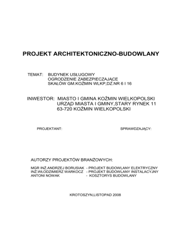 PROJEKT ARCHITEKTONICZNO-BUDOWLANY TEMAT: BUDYNEK USŁUGOWY OGRODZENIE ZABEZPIECZAJĄCE SKAŁÓW GM.KOŹMIN WLKP,DZ.NR 6 I 16 INWESTOR: MIASTO I GMINA KOŹMIN WIELKOPOLSKI URZĄD MIASTA I GMINY,STARY RYNEK 11 63-720 KOŹMIN WIELKOPOLSKI PROJEKTANT: SPRAWDZAJĄCY: AUTORZY PROJEKTÓW BRANśOWYCH: MGR INś.ANDRZEJ BORUSIAK - PROJEKT BUDOWLANY ELEKTRYCZNY INś.WŁODZIMIERZ WARKOCZ - PROJEKT BUDOWLANY INSTALACYJNY ANTONI NOWAK - KOSZTORYS BUDOWLANY KROTOSZYN,LISTOPAD 2008 2 SPIS ZAWARTOŚCI TECZKI 1. Projekt zagospodarowania działki. 2. Opis do projektu zagospodarowania działki. 3. Geotechniczne warunki posadowienia obiektu budowlanego. 4. Informacja dotycząca bezpieczeństwa i ochrony zdrowia. 5. Warunki ochrony przeciwpoŜarowej. 6. Opis techniczny do projektu architektoniczno-budowlanego. 7. Rysunki techniczne: nr 1 - rzut fundamentów, nr 2 - rzut przyziemia, nr 3 - rzut konstrukcji dachu, nr 4 - rzut dachu, nr 5 - przekrój, nr 6 - stopa fundamentowa słupa, nr 7 - stalowy element wieńczący, nr 8 - elewacje, nr 9 - elewacje, nr 10 - ogrodzenie zabezpieczające. 8. Zestawienie pozycji obliczeń statycznych i ich wyników. PROJEKTANT: 3 OPIS DO PROJEKTU ZAGOSPODAROWANIA DZIAŁKI 1. PRZEDMIOT INWESTYCJI. Na działkach nr 6 i 16,połoŜonych w Skałowie,projektuje się budowę ośrodka kulturalno-rekreacyjnego wraz z infrastrukturą techniczną. Zgodnie z zamierzeniami inwestora w jego skład będzie wchodzić budynek usługowy,zaplecze higieniczno-sanitarne,parking dla 24 samochodów osobowych, plac zabaw,boisko sportowe,plac gospodarczy. 2. ISTNIEJĄCY STAN ZAGOSPODAROWANIA DZIAŁKI. W chwili obecnej działka jest uŜytkiem rolnym.Na jej terenie nie ma drzew,ani Ŝadnych budowli podziemnych i naziemnych. 3. PROJEKTOWANE ZAGOSPODAROWANIE DZIAŁKI. Projekt zagospodarowania został opracowany dla terenu obejmującego działkę nr 16 oraz część działki nr 6. Przewidziano w nim budynek usługowy,placyk gospodarczy, przeznaczony na ustawienie szczelnego pojemnika na nieczystości stałe oraz przenośnych kabin toaletowych,parking dla 24 samochodów osobowych,plac zabaw,nawierzchnie utwardzone betonowymi elementami drobnowymiarowymi dla ruchu kołowego i pieszego oraz boisko sportowe.Na placu zabaw przewiduje się ustawienie 2 huśtawek podwójnych,waŜki i przeplotni. 4. ZESTAWIENIE POWIERZCHNI POSZCZEGÓLNYCH CZĘŚCI DZIAŁKI. - powierzchnia zabudowy budynku usługowego placyk gospodarczy boisko sportowe nawierzchnie utwardzone dla ruchu pieszego nawierzchnie utwardzone dla ruchu kołowego plac zabaw nawierzchnie trawiaste 112.87 69.00 2546.00 376.00 1189.00 320.00 1260.00 PROJEKTANT: m2 m2 m2 m2 m2 m2 m2 4 GEOTECHNICZNE WARUNKI POSADOWIENIA OBIEKTU BUDOWLANEGO Budynek usługowy,Skałów gmina Koźmin Wielkopolski,działki nr 6 i 16 1. Biorąc pod uwagę wielkość obiektu,sposób przekazywania obciąŜeń na podłoŜe oraz proste warunki gruntowe,ustala się I kategorię techniczną. 2. Lokalizacja obiektu połoŜona jest w niedalekiej odległości od budynków mieszkalnych i gospodarczych,w których w czasie dotychczasowej eksploatacji nie wystąpiły Ŝadne negatywne zjawiska świadczące o niekorzystnych warunkach geologicznych. W piwnicach nie ma oznak występowania wysokiego poziomu wody gruntowej. 3. Wnioski: 3.1. Grunt w obrębie budowy nadaje się do celów budowlanych. 3.2. Poziom wody gruntowej znajduje się poniŜej poziomu posadowienia stóp fundamentowych. 3.3. Przyjmuje się dopuszczalne napręŜenia na grunt 15 N/cm2. PROJEKTANT: 5 INFORMACJA dotycząca bezpieczeństwa i ochrony zdrowia 1. Nazwa i adres obiektu budowlanego. Budynek usługowy Skałów gmina Koźmin Wielkopolski,działki nr 6 i 16 2. Inwestor. Miasto i Gmina Koźmin Wielkopolski Urząd Miasta i Gminy,Stary Rynek 11 63-720 Koźmin Wielkopolski 3. Projektant. mgr inŜ.arch.Wiesław Świca 63-700 Krotoszyn,ul.Konstytucji 3 Maja 2/14. PROJEKTANT: 6 INFORMACJA dotycząca bezpieczeństwa i ochrony zdrowia Część opisowa 1. Roboty objęte projektem architektoniczno-budowlanym polegają na wykonaniu fundamentów,konstrukcji ciesielskiej,ścian z desek,dachu oraz posadzki. 2. Teren działki uŜytkowany jest rolniczo. 3. Na terenie placu budowy nie występują elementy zagospodarowania działki mogące stwarzać zagroŜenie bezpieczeństwa i zdrowia ludzi. 4. Na przedmiotowej budowie występować będzie jeden rodzaj robót budowlanych stwarzających zagroŜenie bezpieczeństwa i zdrowia ludzi,polegających na zagroŜeniu upadkiem z wysokości powyŜej 5 m. 5. Mimo,iŜ na budowie nie występuje kategoria robót szczególnie niebezpiecznych,kaŜdy pracownik oprócz szkolenia wstępnego winien zostać przeszkolony równieŜ na stanowisku pracy. 6. W trakcie prowadzenia robót budowlanych naleŜy uwzględnić wykonanie zabezpieczeń przed upadkiem z wysokości powyŜej 5 m przy wznoszeniu konstrukcji drewnianej oraz wykonywania deskowania i pokrycia dachu. Wszystkich pracowników prowadzących prace na wysokości naleŜy wyposaŜyć w szelki bezpieczeństwa. Przebiegające w bezpośrednim sąsiedztwie placu budowy utwardzone drogi publiczne zapewniają bezpieczną,sprawną i szybką ewakuację na wypadek poŜaru,awarii i innych zagroŜeń. PROJEKTANT: 7 WARUNKI OCHRONY PRZECIWPOśAROWEJ BUDYNEK USŁUGOWY SKAŁÓW GMINA KOŹMIN WIELKOPOLSKI,DZIAŁKI NR 6 I 16 INWESTOR: MIASTO I GMINA KOŹMIN WIELKOPOLSKI URZĄD MIASTA I GMINY STARY RYNEK 11,63-720 KOŹMIN WIELKOPOLSKI 1. PARAMETRY OBIEKTU. Powierzchnia zabudowy: 112.13 m2 Powierzchnia uŜytkowa: 100.60 m2 Kubatura: 415.25 m3 Ilość kondygnacji: 1 Maksymalna wysokość: 7.0 m 2. ODLEGŁOŚĆ OD BUDYNKÓW SĄSIADUJĄCYCH. NajbliŜsza odległość od budynku sąsiedniego wynosi 180 m. 3. PARAMETRY POśAROWE WYSTĘPUJĄCYCH SUBSTANCJI PALNYCH. W obiekcie nie występują substancje palne. 4. PRZEWIDYWANE WIELKOŚCI OBCIĄśENIA OGNIOWEGO. Nie dotyczy. 5. KATEGORIA ZAGROśENIA LUDZI,PRZEWIDYWANA LICZBA OSÓB W POSZCZEGÓLNYCH POMIESZCZENIACH I NA KAśDEJ KONDYGNACJI. Kat