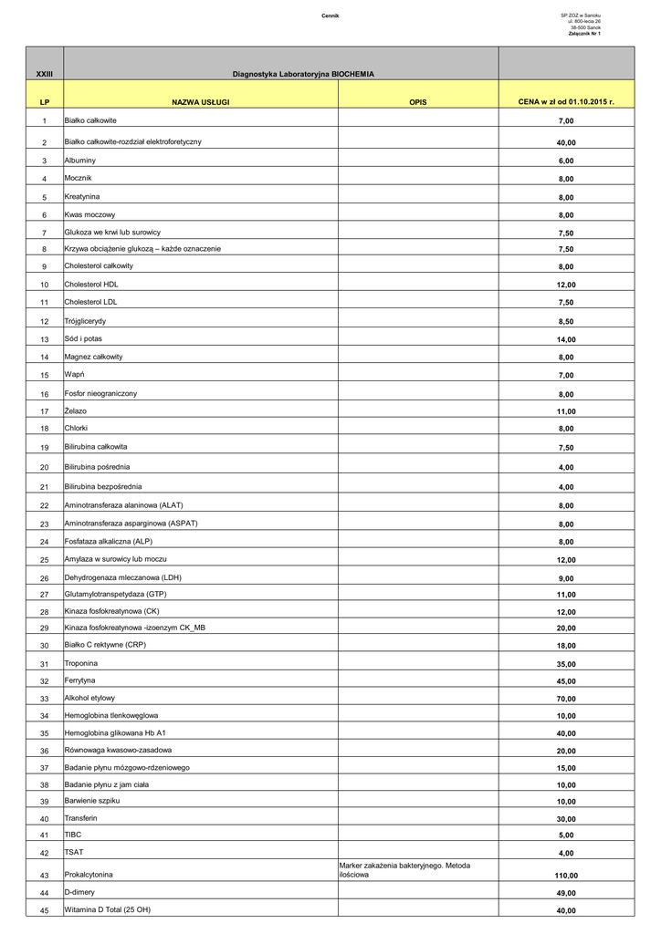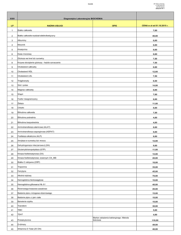 SP ZOZ w Sanoku ul. 800-lecia 26 38-500 Sanok Załącznik Nr 1 Cennik XXIII Diagnostyka Laboratoryjna BIOCHEMIA LP NAZWA USŁUGI OPIS CENA w zł od 01.10.2015 r. 1 Białko całkowite 7,00 2 Białko całkowite-rozdział elektroforetyczny 40,00 3 Albuminy 6,00 4 Mocznik 8,00 5 Kreatynina 8,00 6 Kwas moczowy 8,00 7 Glukoza we krwi lub surowicy 7,50 8 Krzywa obciążenie glukozą – każde oznaczenie 7,50 9 Cholesterol całkowity 8,00 10 Cholesterol HDL 12,00 11 Cholesterol LDL 7,50 12 Trójglicerydy 8,50 13 Sód i potas 14,00 14 Magnez całkowity 8,00 15 Wapń 7,00 16 Fosfor nieograniczony 8,00 17 Żelazo 11,00 18 Chlorki 8,00 19 Bilirubina całkowita 7,50 20 Bilirubina pośrednia 4,00 21 Bilirubina bezpośrednia 4,00 22 Aminotransferaza alaninowa (ALAT) 8,00 23 Aminotransferaza asparginowa (ASPAT) 8,00 24 Fosfataza alkaliczna (ALP) 8,00 25 Amylaza w surowicy lub moczu 12,00 26 Dehydrogenaza mleczanowa (LDH) 9,00 27 Glutamylotranspetydaza (GTP) 11,00 28 Kinaza fosfokreatynowa (CK) 12,00 29 Kinaza fosfokreatynowa -izoenzym CK_MB 20,00 30 Białko C rektywne (CRP) 18,00 31 Troponina 35,00 32 Ferrytyna 45,00 33 Alkohol etylowy 70,00 34 Hemoglobina tlenkowęglowa 10,00 35 Hemoglobina glikowana Hb A1 40,00 36 Równowaga kwasowo-zasadowa 20,00 37 Badanie płynu mózgowo-rdzeniowego 15,00 38 Badanie płynu z jam ciała 10,00 39 Barwienie szpiku 10,00 40 Transferin 30,00 41 TIBC 5,00 42 TSAT 4,00 Marker zakażenia bakteryjnego. Metoda ilościowa 43 Prokalcytonina 44 D-dimery 49,00 45 Witamina D Total (25 OH) 40,00 110,00 SP ZOZ w Sanoku ul. 800-lecia 26 38-500 Sanok Załącznik Nr 1 Cennik 46 Mikroalbuminuria 25,00 47 GRF - wyliczenie 5,00 48 ACR 49 KLIRENS KREATYNINY Wskaźnik albumina/kreatynina w moczu 5,00 5,00