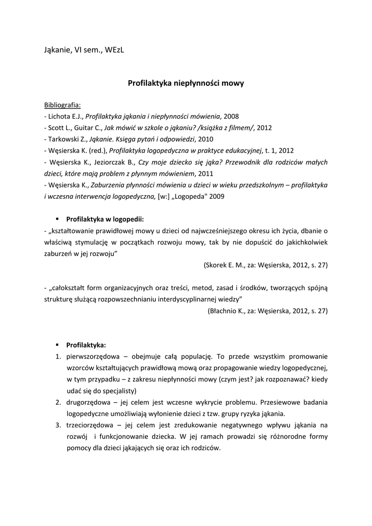 Jąkanie, VI sem., WEzL Profilaktyka niepłynności mowy Bibliografia: - Lichota E.J., Profilaktyka jąkania i niepłynności mówienia, 2008 - Scott L., Guitar C., Jak mówić w szkole o jąkaniu? /książka z filmem/, 2012 - Tarkowski Z., Jąkanie. Księga pytań i odpowiedzi, 2010 - Węsierska K. (red.), Profilaktyka logopedyczna w praktyce edukacyjnej, t. 1, 2012 - Węsierska K., Jeziorczak B., Czy moje dziecko się jąka? Przewodnik dla rodziców małych dzieci, które mają problem z płynnym mówieniem, 2011 - Węsierska K., Zaburzenia płynności mówienia u dzieci w wieku przedszkolnym – profilaktyka i wczesna interwencja logopedyczna, [w:] „Logopeda" 2009 Profilaktyka w logopedii: - „kształtowanie prawidłowej mowy u dzieci od najwcześniejszego okresu ich życia, dbanie o właściwą stymulację w początkach rozwoju mowy, tak by nie dopuścić do jakichkolwiek zaburzeń w jej rozwoju” (Skorek E. M., za: Węsierska, 2012, s. 27) - „całokształt form organizacyjnych oraz treści, metod, zasad i środków, tworzących spójną strukturę służącą rozpowszechnianiu interdyscyplinarnej wiedzy” (Błachnio K., za: Węsierska, 2012, s. 27) Profilaktyka: 1. pierwszorzędowa – obejmuje całą populację. To przede wszystkim promowanie wzorców kształtujących prawidłową mową oraz propagowanie wiedzy logopedycznej, w tym przypadku – z zakresu niepłynności mowy (czym jest? jak rozpoznawać? kiedy udać się do specjalisty) 2. drugorzędowa – jej celem jest wczesne wykrycie problemu. Przesiewowe badania logopedyczne umożliwiają wyłonienie dzieci z tzw. grupy ryzyka jąkania. 3. trzeciorzędowa – jej celem jest zredukowanie negatywnego wpływu jąkania na rozwój i funkcjonowanie dziecka. W jej ramach prowadzi się różnorodne formy pomocy dla dzieci jąkających się oraz ich rodziców. źródło: Węsierska K., Zaburzenia płynności mówienia u dzieci w wieku przedszkolnym – profilaktyka i wczesna interwencja logopedyczna, [w:] „Logopeda" 2009 Profilaktyczna strategia DOM Dobry Kontakt (rodzica z dzieckiem) Dobra Organizacja (m. in. rytm dnia dziecka) Modelowanie Mowy Przydatne linki (do wykorzystania m.in. w popularyzcji wiedzy nt. niepłynności mowy): materiały informacyjne do pobrania na stronie Centrum Logopedycznego: Ocena ryzyka jąkania – karta dla rodziców Do rodziców jąkającego się dziecka – plakat informacyjny Apel do nauczyciela dziecka, które się jąka. http://www.centrumlogopedyczne.com.pl/?page=materialy darmowa publikacja The Stuttering Foundation „Dziecko, które się jąka. Informacje dla pediatry”, w tłumaczeniu na język polski: http://www.stutteringhelp.org/sites/default/files/The_child_who_stutters_to_the_pediatric ian_Polish.pdf krótki belgijski film animowany „Jąkanie”, z polskimi napisami: http://www.youtube.com/watch?v=zNJ6Cfs_XSc