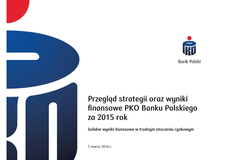 Przegląd strategii oraz wyniki finansowe PKO Banku Polskiego za 2015 rok Solidne wyniki biznesowe w trudnym otoczeniu rynkowym 7 marca 2016 r. Przegląd strategii Banku za lata 2012 - 2015 2 PKO Bank Polski zdecydowanym liderem polskiej bankowości 430 tys. Klientów MŚP 0,9 tys. Agencje Klientów w segmencie detalicznym (z MŚP) 9,0 mln 29,2 tys. 3,2 tys. Pracowników Grupy 7,8 mln Bankomatów 1,2 tys. Oddziałów Użytkowników z dostępem do bankowości elektronicznej 14 tys. Klientów w segmencie korporacyjnym 3 Umocnienie pozycji konkurencyjnej poprzez dynamiczny rozwój organiczny i akwizycje PKO Bank Polski - rozwój biznesu przy najwyższych wolumenach PKO Bank Polski – silna pozycja rynkowa (na koniec 2015) 20% Udział w rynku depozytów 14% 10% Bank 5 16,0% Bank 3 Bank 5 #1 #2 #1 14,0% 13,0% Depozyty podmiotów instyt. Kredyty podmiotów instyt. 20,7% Bank 2 12% #1 25,6% PKO Bank Polski 16% 8% #1 #1 18% 7,3% Bank 4 6% 4% Bank 3 Bank 4 2% 2% 7% 12% 17% Udział w rynku kredytów Udział banków 6% na koniec 3kw. 2015r. PKO BP na koniec 2015 r. Udział w5% rynku na koniec 2012 r. • Zgodnie ze strategią PKO Banku Polskiego na lata 2013-2015 Bank wykorzystał obie dźwignie wzrostu, zarówno dynamiczny wzrost organiczny (wzrost aktywów o 42,1 mld PLN), jak i efekt akwizycji (wzrost o 29,6 mld PLN). 22% Depozyty os.prywatnych Kredyty hipoteczne Kredyty konsumpcyjne TFI* *Pozycja rynkowa wśród TFI działających w ramach bankowych grup kapitałowych. Niższy udział w rynku wynika z braku aktywnego oferowania przez PKO TFI klientom zamkniętych funduszy inwestycyjnych aktywów niepublicznych. • PKO Bank Polski w latach 2013 – 2015 umocnił pozycję lidera we wszystkich kluczowych segmentach rynku kredytów oraz depozytów. • Pozycja nr 2 w depozytach korporacyjnych wynika ze strategii Banku, opierającej źródła finansowania głównie na depozytach detalicznych 4 Źródło: PKO Bank Polski, Sprawozdania finansowe banków. Wysoka dynamika kluczowych mierników finansowych w okresie realizacji strategii „Codziennie Najlepszy” 2013-2015 +71,7 +1,7 p.p. +1,1 p.p. 11,0% mld PLN wzrost aktywów o 38% -1,9 p.p. spadek wskaźnika kredytów zagrożonych wzrost udziału w rynku kredytów -0,7 p.p. spadek kosztu ryzyka wzrost udziału w rynku depozytów +2,0 p.p. wzrost siły finansowej – Core Tier 1 ROE w IV kw. 2015 roku* 3,2% marża odsetkowa w IV kw. 2015 roku* 5 * Dane skonsolidowane po wyłączeniu zdarzeń jednorazowych w postaci kosztów związanych z upadłością SK Banku i Funduszem Wsparcia Kredytobiorców. Silne kluczowe mierniki biznesowe w okresie realizacji strategii „Codziennie Najlepszy” 2013-2015 1 1 . miejsce we wszystkich kluczowych segmentach rynku +809 tys. wzrost liczby klientów . miejsce w rankingu polskich marek w kategorii „Finanse” – najwyższa wartość marki +31 tys. wzrost liczby klientów MSP i korporacyjnych 1 . miejsce 1 -click Contact Center PKO Banku Polskiego po raz 9. najlepszy w sektorze bankowym dla pożyczki gotówkowej ~80% +48% klientów zadowolonych ze współpracy z bankiem wzrost liczby klientów z dostępem do bankowości elektronicznej 6 Główne wyzwania w otoczeniu rynkowym w ostatnich 3 latach Wpływ Zakres regulacji Pakiet CRD IV Bancassurance (Rekomendacja U) Rekomendacja S Fundusz Wsparcia Kredytobiorców (FWK) „Sześciopak” Gwarancja de minimis Domiary kapitałowe KNF • Wzrost kosztów działania banków; wzrost stawki opłat na system gwarantowania depozytów w 2015 r. o ok. 75% r/r. • Ustawowe obniżenie stawek interchange do poziomu 0,2% dla kart debetowych i 0,3% dla kart kredytowych • Spadek przychodów z tytułu interchange negatywny wpływ na wynik z tytułu opłat i prowizji • Zaostrzenie wymogów kapitałowych i płynnościowych; • Finansowanie krótkoterminowe (LCR) • Zmiana zasad kalkulacji funduszy, wskaźnika dźwigni kapitałowej • Dostosowanie działalności biznesowej do wymogów płynnościowych i konieczność pozyskiwania finansowania długoterminowego (emisje obligacji, emisje listów zastawnych) • Rozdzielenie funkcji pośrednika; obowiązki informacyjne, zmiana rozliczania przychodów; stosowanie dobrych praktyk • Zmiana modelu biznesowego banku (kanału sprzedażowego); ograniczenie sprzedaży ubezpieczeń w kanale bankowym; koszty działania • Rekomendacja S dotycząca kredytów hipotecznych: zaostrzenie zasad udzielania kredytów oraz zasad zarządzania ryzykiem: wzrost wymogu wkładu własnego (5% od 2014 r. i 10% od 2015 r.) • Wpływ na akcję kredytową dla kredytów hipotecznych z powodu dodatkowych wymogów wobec kredytobiorców; wpływ na wynik odsetkowy i prowizyjny, dostosowanie modelu biznesowego w zakresie zabezpieczeń • Indywidualne zalecenia KNF w sprawie wymogów kapitałowych w związku z zaangażowaniem w kredyty walutowe % referencyjna 5,75 5 4 4,25 3 2,50 2 1,50 1 cze 15 gru 15 cze 14 gru 14 cze 13 gru 13 cze 12 gru 12 cze 11 gru 11 cze 10 gru 10 0 Składka BFG mld PLN 2,2 • FWK: utworzenie funduszu w wysokości • 600 mln PLN na rzecz wsparcia kredytobiorców, którzy zaciągnęli kredyt mieszkaniowy i znajdują się w trudnej sytuacji • „Sześciopak”: wsparcie dla kredytobiorców • posiadających kredyt w CHF, poprzez m.in. stosowanie ujemnej stawki Libor CHF oraz niższych spreadów walutowych. • Rządowy program gwarancji de minimis wspierający MŚP (gwarancje BGK) lombardowa 6 cze 09 Interchange fee • Wprowadzenie opłaty ostrożnościowej, wzrost opłat na rzecz BFG (2012-2015 ponad dwukrotny wzrost łącznej stawki opłat na rzecz systemu gwarantowania) Stopy procentowe NBP 7 gru 09 System gwarantowania depozytów Spadek wyniku odsetkowego, negatywny wpływ na poziom marży odsetkowej w wyniku historycznie niskich stóp procentowych (w tym obniżenie maksymalnego oprocentowania kredytów konsumpcyjnych) gru 08 Rynkowe stopy procentowe • Uchwały Rady Polityki Pieniężnej obniżające • podstawowe stopy procent