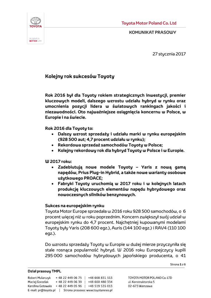 27 stycznia 2017 Kolejny rok sukcesów Toyoty Rok 2016 był dla Toyoty rokiem strategicznych inwestycji, premier kluczowych modeli, dalszego wzrostu udziału hybryd w rynku oraz umocnienia pozycji lidera w światowych rankingach jakości i niezawodności. Oto najważniejsze osiągnięcia koncernu w Polsce, w Europie i na świecie. Rok 2016 dla Toyoty to: Dalszy wzrost sprzedaży i udziału marki w rynku europejskim (928 500 aut; 4,7 procent udziału w rynku); Rekordowa sprzedaż samochodów Toyoty w Polsce; Kolejny rekordowy rok dla hybryd Toyoty w Polsce i w Europie. W 2017 roku: Zadebiutują nowe modele Toyoty – Yaris z nową gamą napędów, Prius Plug-in Hybrid, a także nowe warianty osobowe użytkowego PROACE; Fabryki Toyoty uruchomią w 2017 roku i w kolejnych latach produkcję kluczowych elementów napędu hybrydowego oraz nowoczesnych silników benzynowych. Sukces na europejskim rynku Toyota Motor Europe sprzedała w 2016 roku 928 500 samochodów, o 6 procent więcej niż w roku poprzednim. Koncern zwiększył swój udział w europejskim rynku do 4,7 procent. Najchętniej kupowanymi modelami Toyoty były Yaris (208 600 egz.), Auris (144 100 egz.) i RAV4 (110 100 egz.). Do wzrostu sprzedaży Toyoty w Europie w dużej mierze przyczyniła się stale rosnąca popularność hybryd. W 2016 roku Europejczycy kupili 295 000 samochodów hybrydowych japońskiego producenta, o 41 Strona 1 z 6 procent więcej niż rok wcześniej. Samochody z tym napędem stanowiły niemal 1/3 wszystkich nowych aut Toyoty i Lexusa. W 2015 roku w napęd hybrydowy było wyposażone co czwarte auto. Rekordowy rok w Polsce W 2016 roku Toyota pobiła po raz drugi z rzędu rekord sprzedaży. Polscy klienci kupili 42 913 samochodów tej marki, o 16 procent więcej niż rok wcześniej. Sprzedaż Toyoty na polskim rynku rośnie nieprzerwanie od 5 lat. Toyota jest najchętniej wybieraną marką w Polsce przez klientów indywidualnych. Zarejestrowali oni w 2016 roku 15 642 samochody tej marki, o 14,5 procent więcej niż w roku ubiegłym. Sprzedaż hybryd w Polsce wzrosła z 3 819 samochodów w 2015 roku do 8 364 aut w 2016 roku (+119 procent). Obecnie już co piąta Toyota opuszczająca polski salon jest hybrydą. Samochody z tym napędem coraz częściej wybierają klienci biznesowi – zarówno małe i średnie firmy, jak i międzynarodowe korporacje. Hybrydy zyskują uznanie m.in. wśród taksówkarzy oraz klientów wypożyczalni samochodów. Popularyzację aut o niskiej emisji spalin wspierają samorządy – już ponad 20 polskich miast oferuje kierowcom hybryd ulgi na opłaty za parkowanie lub możliwość wjazdu do stref ograniczonego ruchu. Do sukcesu samochodów hybrydowych przyczynił się m.in. nowy crossover C-HR, którego przedsprzedaż rozpoczęła się we wrześniu. Do tej pory zamówiono już ponad 2000 egzemplarzy, z tego około 700 w samym styczniu bieżącego roku. W lipcu zadebiutowała także odświeżona Corolla. Najpopularniejszy samochód w historii znalazł w ciągu roku w Polsce 4765 nabywców, o 15% więcej niż rok wcześniej. Z myślą o klientach biznesowych, Toyota odnowiła swoją ofertę w zakresie aut użytkowych. W 2016 roku zadebiutował pick-up Hilux 8. generacji oraz użytkowy PROACE 2. generacji w wersji dostawczej i osobowej. Strona 2 z 6 Nowe modele w 2017 roku W tym roku Toyota wprowadzi na rynek kolejne nowe modele. W marcu na targach w Genewie zadebiutuje nowy Yaris z odświeżoną gamą napędów. Model zyska również sportową wersję z silnikiem o mocy 210 KM. Nowością będzie także Prius Plug-in Hybrid, najbardziej wydajny samochód hybrydowy na świecie. Druga generacja powstała na platformie TNGA i wykorzystuje napęd hybrydowy z Priusa IV. generacji, rozbudowany o większy akumulator litowo-jonowy oraz instalację do ładowania z zewnętrznej sieci. Zasięg auta na samym silniku elektrycznym został wydłużony do 50 km. Prius Plug-in Hybrid rozszerzy ofertę hybryd Toyoty do ośmiu modeli. Oferta użytkowego PROACE-a w wersji osobowej zostanie rozszerzona o nowe warianty. Klienci będą mieli do wyboru wersję Long o długości 5,3 m oraz najwyższą wersję wyposażenia VIP. Inwestycje w Polsce Toyota rozpocznie w 2018 roku produkcję nowoczesnych przekładni do napędów hybrydowych w fabryce Toyota Motor Manufacturing Poland (TMMP) w Wałbrzychu. W fabryce Toyota Motor Industries Poland (TMIP) w Jelczu-Laskowicach zostanie uruchomiona produkcja dwóch nowoczesnych silników benzynowych – 1.5 w 2017 roku oraz 2.0 w 2019 roku. Nakłady inwestycyjne obu projektów wyniosą około 650 milionów złotych, co zwiększy dotychczasowe zaangażowanie Toyoty w inwestycje produkcyjne w Polsce do ponad 4 miliardów złotych. Hybrydy sposobem na ograniczenie smogu w miastach Smog stał się w ostatnich tygodniach poważnym problemem. W naszej strefie klimatycznej w jego skład wchodzą toksyczne substancje: tlenek siarki, tlenki azotu, tlenki węgla, sadza oraz trudno opadające pyły. Jego źródłem w Polsce jest przede wszystkim indywidualne ogrzewanie budynków (91% w skali kraju), ale także motoryzacja (6% w skali kraju) oraz przemysł (2%). W miastach te proporcje układają się inaczej – w Warszawie komunikacja jest źródłem aż 63% wszystkich zanieczyszczeń powietrza. Strona 3 z 6 Smog zwiększa zachorowalność na choroby układu oddechowego i krążenia, astmę, alergie oraz raka. Najwięcej toksycznych substancji emitują silniki Diesla. W spalinach napędu wysokoprężnego znajdują się rakotwórcze cząstki stałe PM oraz znaczne ilości tlenków azotu. Coraz popularniejsze samochody hybrydowe generują znikome ilości tlenków azotu, żadnych cząstek stałych i znacząco mniej dwutlenku węgla. Hybrydy są bardzo dobrą alternatywą dla samochodów z silnikiem Diesla, ze względu na, niskie zużycie paliwa i emisję spalin oraz porównywalną cenę. Rozwój innowacyjnych napędów W ciągu 5 lat Toyota zgłosiła 9 807 patentów w dziedzinie alt
