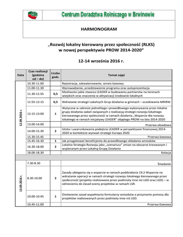 HARMONOGRAM „Rozwój lokalny kierowany przez społeczność (RLKS) w nowej perspektywie PROW 2014-2020” 12-14 września 2016 r. 12.09.2016 r. Data Czas realizacji (godzina od – do) 10.30-11.00 11.00-11.30 Liczba godz. 11.30-11:55 0,5 11:55-12:15 0,5 12:15-13:00 1 13.00-14.00 14.00-15.30 2 15.30-15.45 15.45-16.30 1 16.30-18.00 2 18.00-18.30 13.09.2016 r. 7.30-8.30 Temat zajęć Rejestracja, zakwaterowanie, serwis kawowy Wprowadzenie, przedstawienie programu oraz autoprezentacja Możliwości jakie stwarza LEADER w budowaniu partnerstw na terenach wiejskich oraz znaczenia w aktywizacji środowisk lokalnych Wdrażanie strategii Lokalnych Grup działania w gminach – oczekiwania MRiRW Wytyczne w zakresie jednolitego i prawidłowego wykonywania przez lokalne grupy działania zadań związanych z realizacją strategii rozwoju lokalnego kierowanego przez społeczność w ramach działania „Wsparcie dla rozwoju lokalnego w ramach inicjatywy LEADER” objętego PROW na lata 2014-2020 Przerwa obiadowa Istota i uwarunkowania podejścia LEADER w perspektywie finansowej 20142020 w kontekście wyzwań strategii Europa 2020 Przerwa kawowa Jak przygotować beneficjenta do prawidłowego składania wniosków Lokalna Strategia Rozwoju jako „scenariusz” zmian na obszarze kreowanym i wspieranym przez Lokalną Grupę Działania Kolacja Śniadanie 8.30-10.00 2 Zasady ubiegania się o wsparcie w ramach poddziałania 19.2 Wsparcie na wdrażanie operacji w ramach strategii rozwoju lokalnego kierowanego przez społeczność (projekty realizowane przez podmioty inne niż LGD oraz LGD) – w odniesieniu do Zasad oceny projektów w ramach LSR. 10.00-10.45 1 Omówienie zasad wypełniania formularzy wniosków o przyznanie pomocy dla projektów realizowanych przez podmioty inne niż LGD. 10.45-11.00 Przerwa Kawowa HARMONOGRAM 11.00-14.00 4 14.00-15.00 15.00-16.30 2 16.30-16.45 16.45-18.15 2 14.09.2016 r. 18.15-19.00 7.30-8.30 8.30-10.00 10.00-10.30 10.30-12.00 12.00-13.00 13.00-14.00 Razem godzin Omówienie zasad wypełniania formularzy wniosków o przyznanie pomocy c.d. Omówienie zasad wypełniania załączników do wniosku o przyznanie pomocy, w szczególności biznesplanu. Przerwa obiadowa Omówienie zasad wypełniania załączników do wniosku o przyznanie pomocy c.d. Przerwa kawowa Lokalne kryteria oceny, a cele i wskaźniki lokalnej strategii rozwoju – związek przyczynowo skutkowy warunkujący skuteczność wdrażania LSR – warsztaty, analiza dokumentów macierzystych LGD Kolacja Śniadanie 2 Efektywna komunikacja – konwersatorium - warsztaty 2 Efektywna komunikacja – konwersatorium – warsztaty cd. Podsumowanie szkolenia, wymiana doświadczeń, dyskusja Przerwa kawowa Obiad 22 x