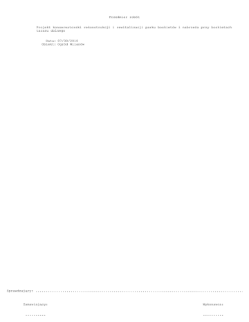 Przedmiar robót Projekt konserwatorski rekonstrukcji i rewitalizacji parku boskietów i nabrzeŜa przy boskietach tarasu dolnego Data: 07/30/2010 Obiekt: Ogród Wilanów Sprawdzający: ........................................................................................................ Zamawiający: Wykonawca: .......... .......... Boskiety tarasu dolnego-p2-kor Zuzia (C) DataComp 1994-2008(lic. 14168) strona nr: 2 Przedmiar robót Podstawa nakładu, opis pozycji, wyliczenie ilości robót 1 Wycinka drzew 1.1 KNNR 1/101/1 Mechaniczne ścinanie drzew z karczowaniem pni, średnice drzew 10-15·cm 1.2 KNNR 1/101/2 Mechaniczne ścinanie drzew z karczowaniem pni, średnice drzew 16-25·cm 1.3 KNNR 1/101/3 Mechaniczne ścinanie drzew z karczowaniem pni, średnice drzew 26-35·cm 1.4 KNNR 1/101/4 Mechaniczne ścinanie drzew z karczowaniem pni, średnice drzew 36-45·cm 1.5 KNNR 1/101/5 Mechaniczne ścinanie drzew z karczowaniem pni, średnice drzew 46-55·cm 1.6 KNNR 1/101/6 Mechaniczne ścinanie drzew z karczowaniem pni, średnice drzew 56-65·cm 1.7 KNNR 1/101/7 Mechaniczne ścinanie drzew z karczowaniem pni, średnice drzew 66-75·cm 1.8 KNNR 1/101/7 Mechaniczne ścinanie drzew z karczowaniem pni, średnice drzew 66-75·cm 1.9 KNR 221/111/10 Ścinanie drzew, twardych dodatek za dalsze 5·cm R= 0,955 M= 1,000 S= 1,000 1.10 KNNR 1/101/7 Mechaniczne ścinanie drzew z karczowaniem pni, średnice drzew 66-75·cm 1.11 KNR 221/111/10 Ścinanie drzew, twardych dodatek za dalsze 5·cm R= 0,955 M= 1,000 S= 1,000 1.12 KNNR 1/107/1 WywoŜenie dłuŜyc, karpiny i gałęzi, transport dłuŜyc na odległość do 2·km 1.13 KNNR 1/107/2 WywoŜenie dłuŜyc, karpiny i gałęzi, transport karpiny na odległość do 2·km 1.14 KNNR 1/107/3 WywoŜenie dłuŜyc, karpiny i gałęzi, transport gałęzi na odległość do 2·km 2 Przygotowanie terenu pod nasadzenia wraz z nasadzeniami 2.1 KNR 221/112/1 Wykaszanie chwastów i jednorocznych samosiewów, koszenie na terenie niezadrzewionym R= 0,955 M= 1,000 S= 1,000 2.2 KNR 221/112/3 Wykaszanie chwastów i jednorocznych samosiewów, wygrabianie i zebranie w stosy R= 0,955 M= 1,000 S= 1,000 2.3 KNR 221/201/1 Wyrównanie nawierzchni pod nasadzenia R= 0,955 M= 1,000 S= 1,000 2.4 KNR 221/301/4 (3) Sadzenie roslin z zaprawą dołów całkowitą, średnica i głębokość dołów 0,3·m, ziemia kompostowa-barwinek w róŜnych kolorach R= 0,955 M= 1,000 S= 1,000 2.5 KNR 221/408/2 (1) RozłoŜenie trawników z rolki-p.a R= 0,955 M= 1,000 S= 1,000 3 Umocnienie skarpy 3.1 KNNR 1/206/3 (3) Roboty ziemne koparkami podsiębiernymi z transportem urobku sam. samowył. do 1·km, w ziemi uprzednio zmagazynowanej w hałdach, koparka co najmniej 0,40·m3, grunt kategorii I-III, spycharka co najmniej 55·kW, samochód 5-10·t-nawiezienie ziemi 3.2 KNNR 1/208/2 (2) Nakłady uzupełniające do tablic za kaŜdy dalszy rozpoczęty 1 km odległości transportu ponad 1 km samochodami samowyładowczymi, drogi o nawierzchni utwardzonej, kategoria gruntu I-IV, samochód 5-10·t 3.3 KNR 221/218/3 Formowanie skarpy R= 0,955 M= 1,000 S= 1,000 3.4 KNR 201/314/4 Ręczne formowanie skarpy z ziemi leŜącej na odkładzie, przemieszczanie spycharkami lub zgarniarkami, kategoria gruntu I-II 3.5 KNNR 11/702/1 MontaŜ maty przeciwerozyjnej np Polymat 3.6 KNNR 1/507/1 Humusowanie skarp, humus grubości max.5·cm 3.7 KNR 221/215/2 NawoŜenie przedsiewne NPK R= 0,955 M= 1,000 S= 1,000 3.8 KNNR 1/507/3 Obsianie skarp, obsianie w ziemi urodzajnej 3.9 KNR 221/702/7 Pielęgnacja mechaniczna wykonywanych siewem trawników parkowych R= 0,955 M= 1,000 S= 1,000 Ilość Krot. Jedn. 17 szt 14 szt 9 szt 6 szt 9 szt 7 szt 7 szt 8 szt 8 2,00 szt 6 szt 6 8,00 szt 43,92 mp 35,04 mp 99 mp 4 062,7 m2 4 062,7 m2 4 062,7 m2 24 376 szt 379 m2 221 m3 221 m3 221 m3 221 m3 600 m2 490 m2 0,049 ha 490 m2 490 m2 Projekt konserwatorski rekonstrukcji i rewitalizacji parku boskietów i nabrzeŜa przy boskietach tarasu dolnego Boskiety tarasu dolnego-p2-kor Podstawa nakładu, opis pozycji, wyliczenie ilości robót 4 Pielęgnacja 4.1 KNR 221/704/2 (1) Pielęgnacja kwietników obsadzonych roślinami kwietnikowymi 6·szt/m2 R= 0,955 M= 1,000 S= 1,000 4.2 KNR 221/703/1 Pielęgnacja trawników darniowych, z rolki-p.a R= 0,955 M= 1,000 S= 1,000 Zuzia (C) DataComp 1994-2008(lic. 14168) strona nr: 3 Ilość Krot. Jedn. 4 062,7 m2 379 m2 Projekt konserwatorski rekonstrukcji i rewitalizacji parku boskietów i nabrzeŜa przy boskietach tarasu dolnego Boskiety tarasu dolnego-p2-kor Zuzia (C) DataComp 1994-2008(lic. 14168) strona nr: 4 Zestawienie robocizny Lp. 1. 2. 3. 4. 5. Ogrodnicy Ogrodnicy Ogrodnicy Robotnicy Robotnicy grupa grupa grupa . . . grupa Nazwa zawodu Jedn. I . . . . . . . . . . . . . . . . . . . . . . . . . . . r-g II . . . . . . . . . . . . . . . . . . . . . . . . . . r-g III . . . . . . . . . . . . . . . . . . . . . . . . . . r-g . . . . . . . . . . . . . . . . . . . . . . . . . . . . r-g I . . . . . . . . . . . . . . . . . . . . . . . . . . . r-g Razem (z dokładnością do zaokrągleń): Ilość 11 534,024 2 607,846 1 847,4972 592,08144 18,564 16 600,013 Cena Wartość Projekt konserwatorski rekonstrukcji i rewitalizacji parku boskietów i nabrzeŜa przy boskietach tarasu dolnego Boskiety tarasu dolnego-p2-kor Zuzia (C) DataComp 1994-2008(lic. 14168) strona nr: 5 Zestawienie materiałów Lp. 1. 2. 3. 4. 5. 6. 7. 8. 9. 10. 11. 12. Nazwa materiału Azofoska . . . . . . . . . . . . . . . . . . . . . . . . . . . . . . . Mata przeciwerozyjna . . . . . . . . . . . . . . . . . . . . . . . . . Nasiona traw . . . . . . . . . . . . . . . . . . . . . . . . . . . . . Nawóz NPK . . . . . . . . . . . . . . . . . . . . . . . . . . . . . . . Strzemiona mocujące . . . . . . . . . . . . . . . . . . . . . . . . . . Środek chwastobójczy - preparat uŜytkowy . . . . . . . . . . . . . . . Trawnik z rolki . . . . . . . . . . . . . . . . . . . . . . . . . . . . Vinca minor . . . . . . . . . . . . . . . . . . . . . . . . . . . . . . Woda . . . . .