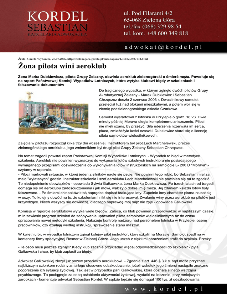 Źróło: Gazeta Wyborcza, 25.07.2006, http://zielonagora.gazeta.pl/zielonagora/1,35182,3507172.html Żona pilota wini aeroklub Żona Marka Dubkiewicza, pilota Grupy Żelazny, obwinia aeroklub zielonogórski o śmierć męża. Powołuje się na raport Państwowej Komisji Wypadków Lotniczych, która wytyka klubowi błędy w szkoleniach i fałszowanie dokumentów Do tragicznego wypadku, w którym zginęło dwóch pilotów Grupy Akrobatycznej Żelazny - Marek Dubkiewicz i Sebastian Chrząszcz doszło 2 czerwca 2003 r. Dwusilnikowy samolot przeleciał tuż nad blokami mieszkalnymi, a potem wbił się w ziemię podzielonogórskiego osiedla Czarkowo. Samolot wystartował z lotniska w Przylepie o godz. 18.23. Dwie minuty później Morava uległa kompletnemu zniszczeniu. Piloci nie mieli szans, by przeżyć. Siła uderzenia rozerwała im serca, płuca, zmiażdżyła kości czaszki. Dubkiewicz starał się o licencję pilota samolotów wielosilnikowych. Zajęcia w pilotażu rozpoczął kilka trzy dni wcześniej. Instruktorem był pilot Lech Marchelewski, prezes zielonogórskiego aeroklubu, jego zmiennikiem był drugi pilot Grupy Żelazny Sebastian Chrząszcz. Na temat tragedii powstał raport Państwowej Komisji Wypadków Lotniczych. - Wypadek to błąd w metodyce szkolenia. Aeroklub nie powinien wyznaczyć do wykonania lotów szkolnych instruktora nie posiadającego wymaganego przepisami doświadczenia do wykonywania lotów instruktorskich na samolocie L- 200 D "Morava" czytamy w raporcie. - Piloci markowali sytuację, w której jeden z silników nagle się psuje. Nie powinni tego robić, bo Sebastian miał za mało "wylatanych" godzin. Instruktor szkolenia i szef aeroklubu Lech Marchelewski nie powinien się na to zgodzić. To niedopełnienie obowiązków - opowiada Sylwia Gałkowska, żona Marka Dubkiewicza. Po trzech latach od tragedii domaga się od aeroklubu zadośćuczynienia i jak mówi, walczy o dobre imię męża. Jej zdaniem książki lotów były fałszowane. - Po śmierci chłopaków ktoś naprędce dopisał brakujące loty. Zupełnie inny charakter pisma rzucał się w oczy. To kolejny dowód na to, że szkoleniami nikt się nie interesował. Zwalanie winy przez aeroklub na pilotów jest krzywdzące. Niech wszyscy się dowiedzą, dlaczego naprawdę mój mąż nie żyje - opowiada Gałkowska. Komisja w raporcie aeroklubowi wytyka wiele błędów. Zaleca, co klub powinien przeprowadzić w najbliższym czasie, m.in zawiesić program szkoleń do zdobywania uprawnień pilota samolotów wielosilnikowych aż do czasu opracowania nowej metodyki szkolenia. Nakazuje kontrolę nadzoru nad personelem lotniska w Przylepie, ocenę pracowników, czy działają według instrukcji, sprawdzenie stanu maszyn. W kwietniu br. w wypadku lotniczym zginął kolejny pilot instruktor, który szkolił na Moravie. Samolot spadł na w kontenery firmy spedycyjnej Rosner w Zielonej Górze. Jego uczeń z ciężkimi obrażeniami trafił do szpitala. Przeżył. - Ile osób musi jeszcze zginąć? Kiedy klub zacznie przykładać więcej odpowiedzialności do szkoleń? - pyta Gałkowska i chce, by klub zapłacił za błędy. Adwokat Gałkowskiej złożył już pozew przeciwko aeroklubowi. - Zgodnie z art. 446 § 3 k.c. sąd może przyznać najbliższym członkom rodziny zmarłego stosowne odszkodowanie, jeżeli wskutek jego śmierci nastąpiło znaczne pogorszenie ich sytuacji życiowej. Tak jest w przypadku pani Gałkowskiej, która doznała silnego wstrząsu psychicznego. To pociągnęło za sobą osłabienie aktywności życiowej, wydatki na leczenie, przy mniejszych zarobkach - komentuje adwokat Sebastian Kordel. W sądzie będzie się domagał 100 tys. zł odszkodowania. Źróło: Gazeta Wyborcza, 25.07.2006, http://zielonagora.gazeta.pl/zielonagora/1,35182,3507172.html Lech Marchelewski, dyrektor aeroklubu, odpiera zarzuty. Nie chce płacić odszkodowania. - Zorganizowaliśmy koncert, z którego dochód przeznaczyliśmy dla rodzin pilotów. To mało? - pyta. To nie jedyny problem szefa aeroklubu. PZU - firma, w której ubezpieczony był samolot - nie chce wypłacić 100 tys. zł odszkodowania. Twierdzi, że wypadku można było uniknąć, gdyby leciał nim doświadczony pilot, a klub nie złamałby procedur, dopuszczając do lotu instruktora bez odpowiedniego doświadczenia. Spór rozstrzygnie zielonogórski sąd, w którym aeroklub złożył pozew przeciwko ubezpieczycielowi. Rozmowa z Lechem Marchelewskim, dyrektorem Aeroklubu Ziemi Lubuskiej Maja Sałwacka: Państwowa Komisja Wypadków Lotniczych w raporcie uznała, że pilot Sebastian Chrząszcz nie powinien szkolić, bo nie miał wylatanej odpowiedniej liczby godzin. Lech Marchelewski: - Choć nie ma na to dowodów w książce lotów, Sebastian miał wymaganą liczbę godzin. Potwierdził to przed sądem szef firmy szkoleniowej Ibex, są inni świadkowie. Druga sprawa, że te brakujące kilka godzin (3,5 godz.) nie mogłyby poprawić doświadczenia instruktora wykorzystywanego w sytuacjach awaryjnych. W lotnictwie wypadki się zdarzają, nie mamy na nie wpływu. Gdybym sam siedział za sterami, nie wyszedłbym także z tych opałów. Komisja uważa, że pan nie powinien zgodzić się na taki lot. - Nie wiedziałem o brakach we wpisach lotów. Sebastian był kierownikiem szkolenia praktycznego ośrodka, to on wpisywał na listy instruktorów, ustalał grafik. Wpisał i siebie. Nie miałem podstaw, by go kontrolować. Do jego obowiązków należało kontrolowanie także mnie jako instruktora, choć jestem dyrektorem. Muszę ufać pracownikom. Chrząszcz był świetnym pilotem i instruktorem. Dlaczego miałem mu nie wierzyć? Poza tym odbyłem z nim loty metodyczne, ćwiczyliśmy sytuacje awaryjne. Nie można więc mówić, że instruktor był nieprzygotowany do lotów. Komisja w raporcie zaleciła zaprzestanie szkoleń na samolotach dwusilnikowych do czasu opracowania nowej metody. A kilka miesięcy temu wydarzył się kolejny wypadek, na tym samym typie samo