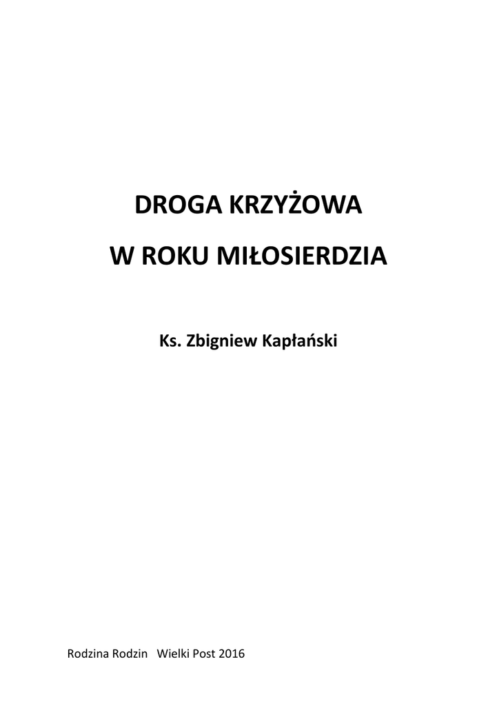 DROGA KRZYŻOWA W ROKU MIŁOSIERDZIA Ks. Zbigniew Kapłański Rodzina Rodzin Wielki Post 2016 Stacja I. - Jezus skazany na śmierć Kłaniamy Cię się Panie Jezu Chryste i błogosławimy Tobie, żeś przez Krzyż i Mękę Swoją świat odkupić raczył. Ile razy oceniałem? Najbliższych, przechodniów, przełożonych, rządzących, nawet niektórzy oceniają papieża. Owszem, moim zadaniem jest umiejętne odróżnianie dobra od zła, by tego ostatniego nie naśladować, ale obowiązkiem chrześcijanina jest szukanie w człowieku dobra, dobrych intencji, zamiarów. Bo człowiek jest dobry, takim go stworzył Pan Bóg i do tworzenia dobra każdy z nas jest wezwany. A osądzając odcinam się od miłosierdzia, skazuję Jezusa albo jedno z dzieci Boga. Któryś za nas cierpiał rany, Jezu Chryste zmiłuj się nad nami! Rodzina Rodzin Wielki Post 2016 Stacja II. - Jezus bierze krzyż na swoje ramiona Kłaniamy Ci się Panie Jezu Chryste i błogosławimy Tobie, żeś przez Krzyż i Mękę Swoją świat odkupić raczył. Biorąc krzyż Jezus uczy odwagi, konsekwencji, daje siłę. Wiemy, że każde zło rodzi zło, ale też każde dobro rodzi dobro. Stawiając czoła trudnościom jednoczę się z Jezusem, który uczy, że nikomu zjednoczonemu z Bogiem nie zabraknie mocy. Podejmując konsekwencje własnych błędów zdejmuję z innych ciężar, który musieliby nieść. Sprowadzam Miłosierdzie nie zgadzając się na własną bierność. Któryś za nas cierpiał rany, Jezu Chryste, zmiłuj się nad nami! Rodzina Rodzin Wielki Post 2016 Stacja III. – Jezus upada pod krzyżem Kłaniamy Ci się Panie Jezu Chryste i błogosławimy Tobie, żeś przez Krzyż i Mękę Swoją świat odkupić raczył. Jezus, Syn Boży, nie korzystał nigdy z mocy Bożej dla siebie, nigdy nie ułatwiał sobie życia, przyjąwszy ludzkie ciało przeżywał swoją codzienność jak każdy z nas. Jezus Chrystus upadając pod ciężarem krzyża jest blisko człowieka, który upada przygnieciony swoją słabością. On rozumie każdego człowieka, on chce wstać z tym, który upadł. Chce wstać ze mną. Któryś za nas cierpiał rany, Jezu Chryste, zmiłuj się nad nami! Rodzina Rodzin Wielki Post 2016 Stacja IV. – Jezus spotyka Matkę Kłaniamy Ci się Panie Jezu Chryste i błogosławimy Tobie, żeś przez Krzyż i Mękę Swoją świat odkupić raczył. Czy może być cierpienie większe niż to, gdy jestem świadkiem, że cierpi ktoś, kogo kocham? Czy jest jakakolwiek sytuacja, w której bardziej potrzebna jest Boża pomoc niż ta, w której widzimy cierpiącego syna czy córkę, męża czy żonę? Tu bardziej niż kiedykolwiek czujemy własną bezsilność, w takich okolicznościach pozostaje nam wpatrywanie się w Maryję, Mistrzynię Miłosierdzia. W Jej sercu wypełnionym bólem nie było miejsca na zemstę. Któryś za nas cierpiał rany, Jezu Chryste, zmiłuj się nad nami! I Ty, któraś współcierpiała, Matko Bolesna, przyczyń się za nami! Rodzina Rodzin Wielki Post 2016 Stacja V. – Jezus przyjmuje pomoc Szymona z Cyreny Kłaniamy Ci się Panie Jezu Chryste i błogosławimy Tobie, żeś przez Krzyż i Mękę Swoją świat odkupić raczył. Nie wszystko robię z entuzjazmem, nie wszędzie umiem być gorliwy. Ale wola człowieka umocnionego łaską Pana Boga jest zdolna przełamać niechęć, spojrzeć na człowieka, któremu mogę usłużyć. Miłosierdzie przejawia się również w pomaganiu tym, którzy są przytłoczeni cierpieniem, chorobą, samotnością. Przyjmując swoje zobowiązania przemieniam siebie. Któryś za nas cierpiał rany, Jezu Chryste, zmiłuj się nad nami! Rodzina Rodzin Wielki Post 2016 Stacja VI. – Jezus okazuje wdzięczność Weronice Kłaniamy Ci się Panie Jezu Chryste i błogosławimy Tobie, żeś przez Krzyż i Mękę Swoją świat odkupić raczył. Przyjmując pomoc też mogę okazać miłosierdzie według przykładu Pana Jezusa. Dzięki takiej postawie miłosierdzie jest utrwalane, częściej okazywane. Bardziej ukochane. Przyjmując pomoc mogę być wdzięczny, mogę w sercu osoby, która okazuje współczucie i życzliwość dokonać kolejnego cudu, dzięki któremu będzie w świecie więcej dobra. Któryś za nas cierpiał rany, Jezu Chryste, zmiłuj się nad nami! Rodzina Rodzin Wielki Post 2016 Stacja VII – Jezus po raz drugi upada Kłaniamy Ci się Panie Jezu Chryste i błogosławimy Tobie, żeś przez Krzyż i Mękę Swoją świat odkupić raczył. Czasem przychodzi pytanie „ile można wytrzymać”, często wraz z tym pytaniem słyszymy w sercu pokusę, by już nie próbować, by poddać się rezygnacji. Rezygnacja to posłuchanie szatana, wstawanie to dowód na nieustanną pomoc Pana Jezusa, który uczy wstawania, ale nie tylko, by nie leżeć na ziemi. On wstaje, by iść. Iść do ostatecznego zwycięstwa. Moc płynąca ze Zmartwychwstania już tutaj jest obecna. Proszę o siłę powstawania. Zawsze. Któryś za nas cierpiał rany, Jezu Chryste, zmiłuj się nad nami! Rodzina Rodzin Wielki Post 2016 Stacja VIII. – Jezus okazuje miłość niewiastom nad Nim płaczącym Kłaniamy Ci się Panie Jezu Chryste i błogosławimy Tobie, żeś przez Krzyż i Mękę Swoją świat odkupić raczył. Dobre jest współczucie. Zwłaszcza współczucie wobec człowieka, który jest niesłusznie oskarżony, poniżony, wykorzystywany. Ale współczucie, które jest jedynie wrażeniem, uczuciem, emocją nie jest wiele warte. Wartościowe jest takie współczucie, z którego płynie dobro trwałe, współczucie, które odkrywa istotę zła. Każde zło zaczyna się od grzechu, po którym zło się mnoży, narasta. Jezus wskazując źródła zła okazuje Miłosierdzie, bo pomaga przez to zerwać łańcuch zła, pomaga w zwycięstwie dobra. Któryś za nas cierpiał rany, Jezu Chryste, zmiłuj się nad nami! Rodzina Rodzin Wielki Post 2016 Stacja IX. – Jezus upada pod ciężarem krzyża po raz trzeci Kłaniamy Ci się Panie Jezu Chryste i błogosławimy Tobie, żeś przez