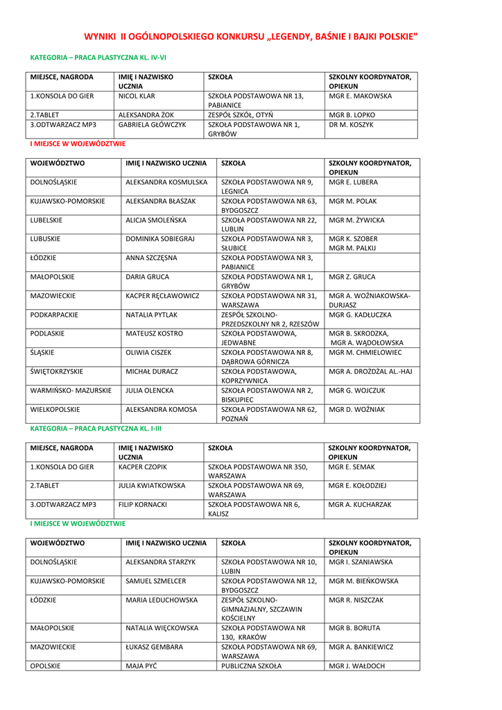 WYNIKI II OGÓLNOPOLSKIEGO KONKURSU „LEGENDY, BAŚNIE I BAJKI POLSKIE” KATEGORIA – PRACA PLASTYCZNA KL. IV-VI MIEJSCE, NAGRODA 1.KONSOLA DO GIER IMIĘ I NAZWISKO UCZNIA NICOL KLAR 2.TABLET 3.ODTWARZACZ MP3 ALEKSANDRA ŻOK GABRIELA GŁÓWCZYK SZKOŁA SZKOŁA PODSTAWOWA NR 13, PABIANICE ZESPÓŁ SZKÓŁ, OTYŃ SZKOŁA PODSTAWOWA NR 1, GRYBÓW SZKOLNY KOORDYNATOR, OPIEKUN MGR E. MAKOWSKA MGR B. LOPKO DR M. KOSZYK I MIEJSCE W WOJEWÓDZTWIE WOJEWÓDZTWO IMIĘ I NAZWISKO UCZNIA SZKOŁA DOLNOŚLĄSKIE ALEKSANDRA KOSMULSKA KUJAWSKO-POMORSKIE ALEKSANDRA BŁASZAK LUBELSKIE ALICJA SMOLEŃSKA LUBUSKIE DOMINIKA SOBIEGRAJ ŁÓDZKIE ANNA SZCZĘSNA MAŁOPOLSKIE DARIA GRUCA MAZOWIECKIE KACPER RĘCŁAWOWICZ PODKARPACKIE NATALIA PYTLAK PODLASKIE MATEUSZ KOSTRO ŚLĄSKIE OLIWIA CISZEK ŚWIĘTOKRZYSKIE MICHAŁ DURACZ WARMIŃSKO- MAZURSKIE JULIA OLENCKA WIELKOPOLSKIE ALEKSANDRA KOMOSA SZKOŁA PODSTAWOWA NR 9, LEGNICA SZKOŁA PODSTAWOWA NR 63, BYDGOSZCZ SZKOŁA PODSTAWOWA NR 22, LUBLIN SZKOŁA PODSTAWOWA NR 3, SŁUBICE SZKOŁA PODSTAWOWA NR 3, PABIANICE SZKOŁA PODSTAWOWA NR 1, GRYBÓW SZKOŁA PODSTAWOWA NR 31, WARSZAWA ZESPÓŁ SZKOLNOPRZEDSZKOLNY NR 2, RZESZÓW SZKOŁA PODSTAWOWA, JEDWABNE SZKOŁA PODSTAWOWA NR 8, DĄBROWA GÓRNICZA SZKOŁA PODSTAWOWA, KOPRZYWNICA SZKOŁA PODSTAWOWA NR 2, BISKUPIEC SZKOŁA PODSTAWOWA NR 62, POZNAŃ SZKOLNY KOORDYNATOR, OPIEKUN MGR E. LUBERA MGR M. POLAK MGR M. ŻYWICKA MGR K. SZOBER MGR M. PALKIJ MGR Z. GRUCA MGR A. WOŹNIAKOWSKADURJASZ MGR G. KADŁUCZKA MGR B. SKRODZKA, MGR A. WĄDOŁOWSKA MGR M. CHMIELOWIEC MGR A. DROŻDŻAL AL.-HAJ MGR G. WOJCZUK MGR D. WOŹNIAK KATEGORIA – PRACA PLASTYCZNA KL. I-III MIEJSCE, NAGRODA 1.KONSOLA DO GIER IMIĘ I NAZWISKO UCZNIA KACPER CZOPIK 2.TABLET JULIA KWIATKOWSKA 3.ODTWARZACZ MP3 FILIP KORNACKI SZKOŁA SZKOŁA PODSTAWOWA NR 350, WARSZAWA SZKOŁA PODSTAWOWA NR 69, WARSZAWA SZKOŁA PODSTAWOWA NR 6, KALISZ SZKOLNY KOORDYNATOR, OPIEKUN MGR E. SEMAK MGR E. KOŁODZIEJ MGR A. KUCHARZAK I MIEJSCE W WOJEWÓDZTWIE WOJEWÓDZTWO IMIĘ I NAZWISKO UCZNIA SZKOŁA DOLNOŚLĄSKIE ALEKSANDRA STARZYK KUJAWSKO-POMORSKIE SAMUEL SZMELCER ŁÓDZKIE MARIA LEDUCHOWSKA MAŁOPOLSKIE NATALIA WIĘCKOWSKA MAZOWIECKIE ŁUKASZ GEMBARA OPOLSKIE MAJA PYĆ SZKOŁA PODSTAWOWA NR 10, LUBIN SZKOŁA PODSTAWOWA NR 12, BYDGOSZCZ ZESPÓŁ SZKOLNOGIMNAZJALNY, SZCZAWIN KOŚCIELNY SZKOŁA PODSTAWOWA NR 130, KRAKÓW SZKOŁA PODSTAWOWA NR 69, WARSZAWA PUBLICZNA SZKOŁA SZKOLNY KOORDYNATOR, OPIEKUN MGR I. SZANIAWSKA MGR M. BIEŃKOWSKA MGR R. NISZCZAK MGR B. BORUTA MGR A. BANKIEWICZ MGR J. WAŁDOCH PODKARPACKIE KACPER GIBEK POMORSKIE IGA TREDER ŚLĄSKIE WIKTORIA OBARZANEK ŚWIĘTOKRZYSKIE KATARZYNA PAPROCKA WARMIŃSKO- MAZURSKIE WIKTORIA CICHOCKA WIELKOPOLSKIE OLGA MAKALSKA ZACHODNIOPOMORSKIE KONRAD DEMBIŃSKI PODSTAWOWA NR 12 Z ODDZ. INTEGRACYJNYMI, KĘDZIERZYNKOŹLE SZKOŁA PODSTAWOWA, RADOMYŚL WIELKI SZKOŁA PODSTAWOWA Z ODDZ. INTEGR. NR 10, SŁUPSK SZKOŁA PODSTAWOWA NR 32, SOSNOWIEC SZKOŁA PODSTAWOWA, KOPRZYWNICA SZKOŁA PODSTAWOWA, LUBAWA SZKOŁA PODSTAWOWA, KSIĄŻ WIELKOPOLSKI PUBLICZNA SZKOŁA PODSTAWOWA NR 1, ŚWIDWIN MGR J. WOLANIN MGR P. SYNAKOWSKA MGR M. NIEDZIELA MGR A. SKOLAK MGR D. WIERZBOWSKA MGR J. BARAŃSKA MGR A. KUZIO KATEGORIA - TEST KL. IV-VI MIEJSCE, NAGRODA IMIĘ I NAZWISKO UCZNIA SZKOŁA ILOŚĆ PUNKTÓW 1.KONSOLA DO GIER KAROL FURMANEK 39 2.TABLET MATEUSZ RZEPKA SZKOŁA PODSTAWOWA NR 31, WARSZAWA SZKOŁA PODSTAWOWA, KUCHARY KOŚCIELNE ZESPÓŁ SZKÓŁ, ODOLANÓW 3. ODTWARZACZ MP3 ALICJA JUREK I MIEJSCE W WOJEWÓDZTWIE 36 SZKOLNY KOORDYNATOR, OPIEKUN MGR J. KOŁODZIEJSKA MGR I. RZEPKA 35 MGR B. NOSKOWICZ WOJEWÓDZTWO IMIĘ I NAZWISKO UCZNIA SZKOŁA DOLNOŚLĄSKIE KUJAWSKO-POMORSKIE MATEUSZ MONDZELEWSKI KAJA SZYKOWNA LUBELSKIE ANIELA TARKOWSKA LUBUSKIE ŁÓDZKIE ALEKSANDRA ŻOK ZUZA LESKE MAŁOPOLSKIE KAROLINA WOLSKA MAZOWIECKIE ALICJA FIUR PODKARPACKIE WERONIKA DZIERŻAK PODLASKIE OLGA ZAPERT ŚLĄSKIE MARTYNA SZOSTEK WARMIŃSKO- MAZURSKIE JULIA BEŁEJ ZESPÓŁ SZKÓŁ, OŁAWA SZKOŁA PODSTAWOWA NR 63, BYDGOSZCZ SZKOŁA PODSTAWOWA, PONIATOWA SZKOŁA PODSTAWOWA, OTYŃ SZKOŁA PODSTAWOWA NR 13, PABIANICE SZKOŁA PODSTAWOWA NR 16, NOWY SĄCZ SZKOŁA PODSTAWOWA NR 31 , WARSZAWA SZKOŁA PODSTAWOWA NR 12, RZESZÓW SZKOŁA PODSTAWOWA, JEDWABNE SZKOŁA PODSTAWOWA NR 37, BIELSKO-BIAŁA SZKOŁA PODSTAWOWA NR 2, OLSZTYN ZESPÓŁ SZKÓŁ, ODOLANÓW WIELKOPOLSKIE MAŁGORZATA DOROŻALSKA ZACHODNIOPOMORSKIE JULIA MAKOWSKA NAGRODY POCIESZENIA OTRZYMUJĄ: IMIĘ I NAZWISKO UCZNIA ZUZANNA DĄBROWSKA ANTONI DĄBROWSKI ZESPÓŁSZKÓŁ, RABINO SZKOLNY KOORDYNATOR, OPIEKUN MGR A. PAWULICH MGR M. POLAK MGR J. MARKUSZEWSKA MGR B. LOPKO MGR M. KRAWCZYK MGR K. DOBOSZ MGR A. WOŹNIAKOWSKADURJASZ MGR G. KADŁUCZKA MGR B. SKRODZKA, MGR A. WĄDOŁOWSKA MGR M. MALEJKA MGR A. KOTYŃSKA-BURYŁA MGR B. NOSKOWICZ MGR M. FELIŃSKA SZKOŁA PUBLICZNA SZKOŁA PODSTAWOWA, NOWE MIASTO NAD PILICĄ SZKOŁA PODSTAWOWA, BUDZYŃ PRZYBORY PIŚMIENNICZE OTRZYMUJĄ: MGR MONIKA PALKIJ- SŁUBICE, DR MARIA KOSZYK- GRYBÓW