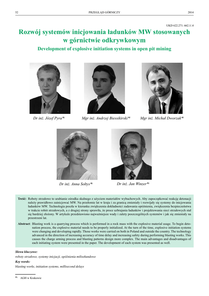 52 PRZEGLĄD GÓRNICZY 2014 UKD 622.271: 662.1/.4 Rozwój systemów inicjowania ładunków MW stosowanych w górnictwie odkrywkowym Development of explosive initiation systems in open pit mining Dr inż. Józef Pyra*) mgr inż. Andrzej Biessikirski*) dr inż. Anna Sołtys*) mgr inż. Michał Dworzak*) dr inż. Jan Winzer*) Treść: Roboty strzałowe to urabianie ośrodka skalnego z użyciem materiałów wybuchowych. Aby zapoczątkować reakcję detonacji należy prawidłowo zainicjować MW. Na przełomie lat w kraju i za granicą zmieniały i rozwijały się systemy do inicjowania ładunków MW. Technologia poszła w kierunku zwiększenia dokładności zadawania opóźnienia, zwiększenia bezpieczeństwa w trakcie robót strzałowych, a z drugiej strony sprawiła, że proce uzbrajania ładunków i projektowania sieci strzałowych stał się bardziej złożony. W artykule przedstawiono najważniejsze wady i zalety poszczególnych systemów i jak się zmieniały na przestrzeni lat. Abstract: Blasting work is a quarrying process which is performed in a rock mass with the explosive material usage. To begin detonation process, the explosive material needs to be properly initialized. At the turn of the time, explosive initiation systems were changing and developing rapidly. Those works were carried on both in Poland and outside the country. The technology advanced in the direction of increasing accuracy of time delay and increasing safety during performing blasting works. This causes the charge arming process and blasting patterns design more complex. The main advantages and disadvantages of each initiating system were presented in the paper. The development of each system was presented as well. Słowa kluczowe: roboty strzałowe, systemy inicjacji, opóźnienia milisekundowe Key words: blasting works, initiation systems, millisecond delays *) AGH w Krakowie Nr 10 PRZEGLĄD GÓRNICZY 53 1. Wprowadzenie 2. Elektryczny system odpalania ładunków MW Prawidłowo zaprojektowane roboty strzałowe maksymalizują pozytywne efekty, a minimalizują negatywne (najlepszym rozwiązaniem byłoby całkowite ich wyeliminowanie). Pod pojęciem pozytywnego efektu rozumie się oczywiście uzyskanie urobku o żądanej granulacji przy wysokości usypu dostosowanej do maszyn załadowczych Pozostałe efekty to już bardziej lub mniej kłopotliwe, niepożądane zjawiska, z którymi zakład górniczy musi sobie radzić. Do tych efektów zaliczamy: drgania parasejsmiczne, rozrzut odłamków skalnych, powietrzną falę uderzeniową, progi przyspągowe, nawisy skalne, nierówny ocios, bryły nadwymiarowe itp. Jednym z wielu czynników mających decydujący wpływ na prawidłowy proces urabiania ośrodka skalnego, z użyciem MW, jest odpowiednio dobrane opóźnienie międzystrzałowe. Opóźnienie międzystrzałowe decyduje o rozdrobnieniu urobku, jego prawidłowym usypie, oraz o intensywności drgań parasejsmicznych. Zbyt małe opóźnienie zastosowane pomiędzy poszczególnymi ładunkami może zadziałać jak odpalanie serii otworów natychmiastowo, co spowoduje słabe wytworzenie się dodatkowych powierzchni odsłonięcia i wzrost intensywności drgań, ale za to lepsze rozdrobnienie urobku. Za duże opóźnienie powoduje dobre wykształtowanie się powierzchni odsłonięcia, nie do końca kontrolowany efekt sejsmiczny (może w niektórych przypadkach dojść do wzmocnienia drgań), a także gorsze rozdrobnienie urobku (brak współdziałania ze sobą sąsiadujących ładunków w otworach) i w niektórych przypadkach pogorszenie stanu ociosu [12]. Precyzyjne zadanie opóźnienia międzystrzałowego jest kluczowe dla minimalizacji intensywności drgań wzbudzanych robotami strzałowymi. Dlatego też na przestrzeni XIX i XX wieku zmieniały się systemy inicjowania, poczynając od elektrycznego, poprzez nieelektryczny aż do systemu elektronicznego (rys. 1). Wszystkie udoskonalenia zmierzały w kierunku uzyskania precyzyjnego opóźnienia z jednoczesnym poszerzeniem możliwości doboru opóźnienia. Bardzo ważnym efektem zmian było również podniesienie bezpieczeństwa wykonywania robót. Zanim weszły na rynek polski systemy nieelektryczny i elektroniczny, był na szeroką skalę stosowany system elektryczny. W systemie elektrycznym główną część stanowi zapalnik, który ze względu na rodzaj (podział ze względu na czas zadziałania) dzieli się na: – mikrosekundowe (U) – o czasie zadziałania poniżej 1 ms, – natychmiastowe (N) – o czasie zadziałania od 1 ms do 10 ms, – milisekundowe (M) – o znamionowym czasie zadziałania stopnia pierwszego od 11 ms do 100 ms, – półsekundowe (P) – o znamionowym czasie zadziałania stopnia pierwszego 0,5 s. W górnictwie odkrywkowym stosuje się głównie zapalniki milisekundowe, których znamionowy czas zadziałania zmieniał się na przestrzeni lat i obecnie wynosi 25 ms. W latach 60 ÷ 70 ubiegłego stulecia były stosowane krajowe zapalniki KZnPT-30/70, które posiadały 11 stopni opóźnienia od 30 ms do 70 ms. W tym samym czasie były dostępne czechosłowackie zapalniki Dem-Cu zawierające 22 stopnie opóźnień (23 ms dla 18 pierwszych zapalników i 30 ms dla pozostałych). Również w tym okresie, w górnictwie podziemnym były stosowane zapalniki KZnPT-26, o opóźnieniu 26 ms (5 stopni opóźnień). Były one później również stosowane w górnictwie odkrywkowym [6]. W Polsce są produkowane zapalniki elektryczne skalne, węglowe i metanowe z opóźnieniem czasowym 25 ms i w zależności od producenta liczba stopni opóźnienia wynosi najczęściej 15, ale bywa również mniejsza 12, lub większa 18 ÷ 20. Ponadto na rynku polskim, są dostępne również zapalniki elektryczne oferowane przez zagranicznych producentów o opóźnieniach 25 ms, 30 ms, 50 ms, z liczbą stopni opóźnień wynoszącą nawet 30. System elektryczny inicjowania ładunków MW składa się z trzech podstawowych elementów: – zapalnika elektrycznego, – przewodów st