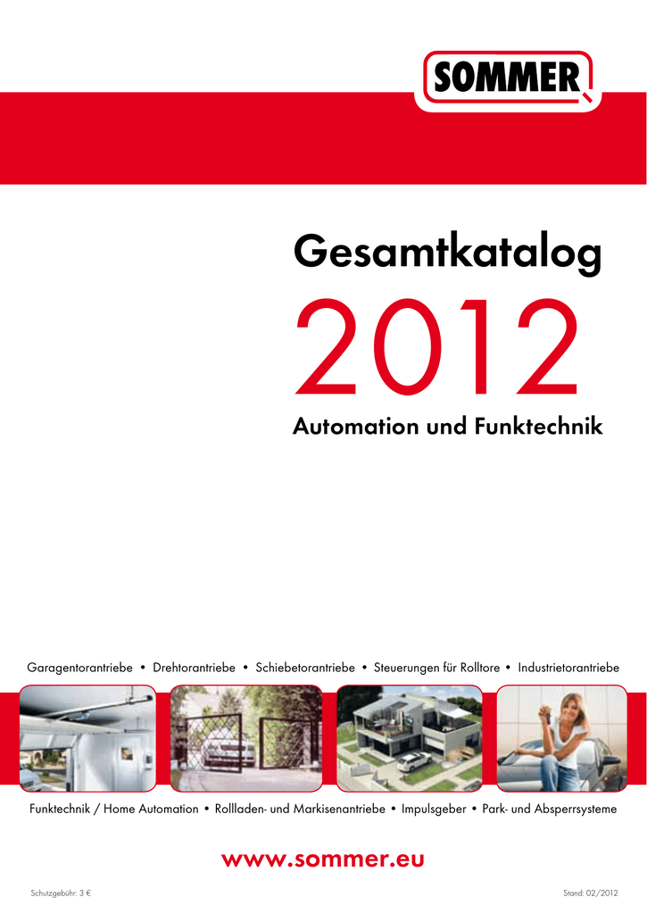 Gesamtkatalog 2012 Automation und Funktechnik Garagentorantriebe • Drehtorantriebe • Schiebetorantriebe • Steuerungen für Rolltore • Industrietorantriebe Funktechnik / Home Automation • Rollladen- und Markisenantriebe • Impulsgeber • Park- und Absperrsysteme www.sommer.eu Schutzgebühr: 3 € Stand: 02/2012 Inhaltsverzeichnis Die Welt der SOMMER-Produkte SOMMER-Team Deutschland SOMMER-Team Österreich/Schweiz SOMMER weltweit Garagentorantriebe Überzeugende Argumente Garagentorantriebe im Überblick Checkliste Garagentorantriebe Einstiegsmodell: sprint evolution Erfolgsmodelle: duo vision Erfolgsmodelle: duo rapido Spitzenmodell: marathon SL Zubehör für Garagentorantriebe Maßzeichnungen Torantriebe für Tief- und Sammelgaragentore marathon tiga SL marathon tiga SLX Zubehör für Tief- und Sammelgaragentorantriebe Drehtorantriebe Überzeugende Argumente Drehtorantriebe im Überblick Checkliste Drehtorantriebe Drehtorantriebe twist 200 E / twist 200 EL Drehtorantrieb twist XL Unterflur-Drehtorantrieb jive 200 E Zubehör für Drehtorantriebe Schiebetorantriebe Überzeugende Argumente Schiebetorantriebe im Überblick Checkliste Schiebetorantriebe Schiebetorantrieb STArter Schiebetorantrieb SP 900 Schiebetorantrieb SG1 Schiebetorantrieb SM 40 T Schiebetorantriebe DS 600 / DS 1200 Zubehör für Schiebetorantriebe 2 | www.sommer.eu 4 6 8 8 10 – 31 11 12 14 16 17 18 20 22 27 28 30 31 34 – 57 35 36 37 38 44 48 51 58 – 75 59 60 61 62 64 66 68 70 72 Inhaltsverzeichnis Funktechnik / Home Automation Home Automation-Anwendungen im Überblick Der SOMMER Funk – die Vorteile Funkfernsteuerungen FM 868,8 MHz (Somloq Rollingcode) Handsender-Verwaltungssystem „Somloq“ Funkfernsteuerungen FM 40,685 MHz Funkfernsteuerungen AM 40,685 MHz (10 Bit) Zubehör Videozutrittssysteme Impulsgeber Lichtschranken / Induktionsschleifendetektoren Optische Sicherheitskontaktleisten Zubehör für optische/elektrische Sicherheitskontaktleisten Elektrische Sicherheitskontaktleisten Verbrauchsmittel (Batterien) Ampeln Warnlichter Rollladen- und Markisenantriebe Überzeugende Argumente So finden Sie den passenden Rohrmotor Rohrmotoren und Standard-Zubehör Zubehör-Wandanker und Zubehör-Adapter Steuerungen für Rollladenantriebe Steuerung für Markisenantriebe Zubehör Funkzubehör Steuerungen für Rolltore 76 – 87 77 78 80 86 87 87 88 – 97 89 89 92 93 94 95 96 96 97 98 – 107 99 100 101 102 104 105 105 106 108 – 109 RDC Vision und RDC 800 109 Industrietorantriebe 110 – 111 Vorschau auf die neue Antriebsgeneration Park- und Absperrsysteme Parkplatzsperre + Zubehör Schranken + Zubehör Allgemeine Geschäftsbedingungen 111 112 – 115 113 114 116 – 117 www.sommer.eu | 3 Die Welt der SOMMER-Produkte elektrische und elektronische Geräte in Haus und Garten fernbedienen ( ab S. 76) Dreh- und Schiebetore nie mehr von Hand öffnen ( ab S. 34) 4 | www.sommer.eu Die Welt der SOMMER-Produkte Rollladen, Markisen und Jalousien einfach und bequem per Funk bedienen ( ab S. 98) Garagentore automatisieren und per Knopfdruck öffnen ( ab S. 10) www.sommer.eu | 5 Wir sind immer für Sie da SOMMER-Groke-Fachakademie: Klaus Hasselbacher Schulungsleiter +49 (0)7021/8001-176 [email protected] Firmenzentrale: SOMMER Antriebs- und Funktechnik GmbH Hans-Böckler-Str. 21–27 D-73230 Kirchheim/Teck Tel.: +49 (0)7021/8001-0 Fax: +49 (0)7021/8001-100 E-Mail: [email protected] Internet: www.sommer.eu Das SOMMER-Verkaufsteam Innendienst (Deutschland) Nadine Schmid +49 (0)7021/8001-121 [email protected] Sarah Werner +49 (0)7021/8001-126 [email protected] Heidy Corvaia +49 (0)7021/8001-124 [email protected] Antje Grohmann +49 (0)7021/8001-123 [email protected] Ansprechpartnerin für die Kunden von Hr. Albert, Hr. Jungemann und Hr. Klockmann Ansprechpartnerin für die Kunden von Hr. Lienstromberg, Hr. Lutz und Hr. Pruchnik Ansprechpartnerin für die Kunden von Hr. Rogg und Hr. Lutz Ansprechpartnerin für die Kunden von Hr. Niemeier, Hr. Reil und Hr. Toma Verkaufsleiter Bernd Klockmann Jungemann Inge Kraushaar +49 (0)7021/8001-125 [email protected] Auftragsbearbeitung Niemeier Albert Pruchnik Verkaufsleiter Georg Lienstromberg Reil Lutz Verkaufsleiter Wolfgang Rogg Toma Rogg 6 | www.sommer.eu Das SOMMER-Verkaufsteam Außendienst (Deutschland) Verkaufsteam Nord & Ost Bernd Klockmann (Verkaufsleiter) Tel.: 04152 / 1 36 05 32 Fax: 04152 / 9 02 41 29 Mobil: 0151 / 18 04 42 93 [email protected] Dieter Jungemann Wolfgang Albert Tel.: 04282 / 5 94 61 32 Fax: 04282 / 5 94 61 33 Mobil: 0151 / 18 04 42 96 [email protected] Tel.: 034441 / 34 88 3 Fax: 034441 / 34 88 7 Mobil: 0151 / 18 04 43 17 [email protected] Verkaufsteam Mitte & West Georg Lienstromberg (Verkaufsleiter) Tel.: 02389 / 78 06 77 Fax: 02389 / 40 30 353 Mobil: 0151 / 18 04 43 01 [email protected] Rainer Niemeier Michael Pruchnik Christian Lutz Tel.: 05751 / 91 77 68 Fax: 05751 / 91 66 63 Mobil: 0151 / 18 04 43 11 [email protected] Tel.: 02732 / 76 76 01 Fax: 02732 / 76 76 03 Mobil: 0151 / 18 04 43 21 [email protected] Tel.: 07273 / 91 82 37 Fax: 07273 / 91 82 46 Mobil: 0151 / 18 04 42 95 [email protected] Verkaufsteam Süd Wolfgang Rogg (Verkaufsleiter) Tel.: 07308 / 36 46 Fax: 07308 / 68 20 Mobil: 0171 / 7 70 76 82 [email protected] Thomas Reil Werner Toma Tel.: 09193 / 46 94 Fax: 09193 / 45 48 Mobil: 0151 / 18 04 43 15 [email protected] Tel.: 09171 / 8 52 00 61 Fax: 09171 / 8 52 00 62 Mobil: 0151 / 18 04 42 94 [email protected] www.sommer.eu | 7 Das SOMMER-Team in Österreich und der Schweiz A SOMMER Austria Ges. mbH Erwin Koll Gewerbepark 1 A - 4111 Walding Tel.: +43 / 72 34 / 84 02 71 Fax: +43 / 72 34 / 84 02 74 Mobil:+43 / 664 / 20 57 550 E-Mail:[email protected] Web: www.sommer-torantriebe.at Antriebs- und Funktechnik AG SOMMER Marco Lietz Buchenstrasse 3 CH - 6210 Sursee Tel.: +41 / 33 - 335 18 18 Fax: +41 / 33 - 335 18 70 Mobil:+41 / 78 67 00 701 E-Mail:[email protected] Web: www.sommer-schweiz.ch Die SOMMER Niederlassungen und Vertretungen weltweit NV B Sec