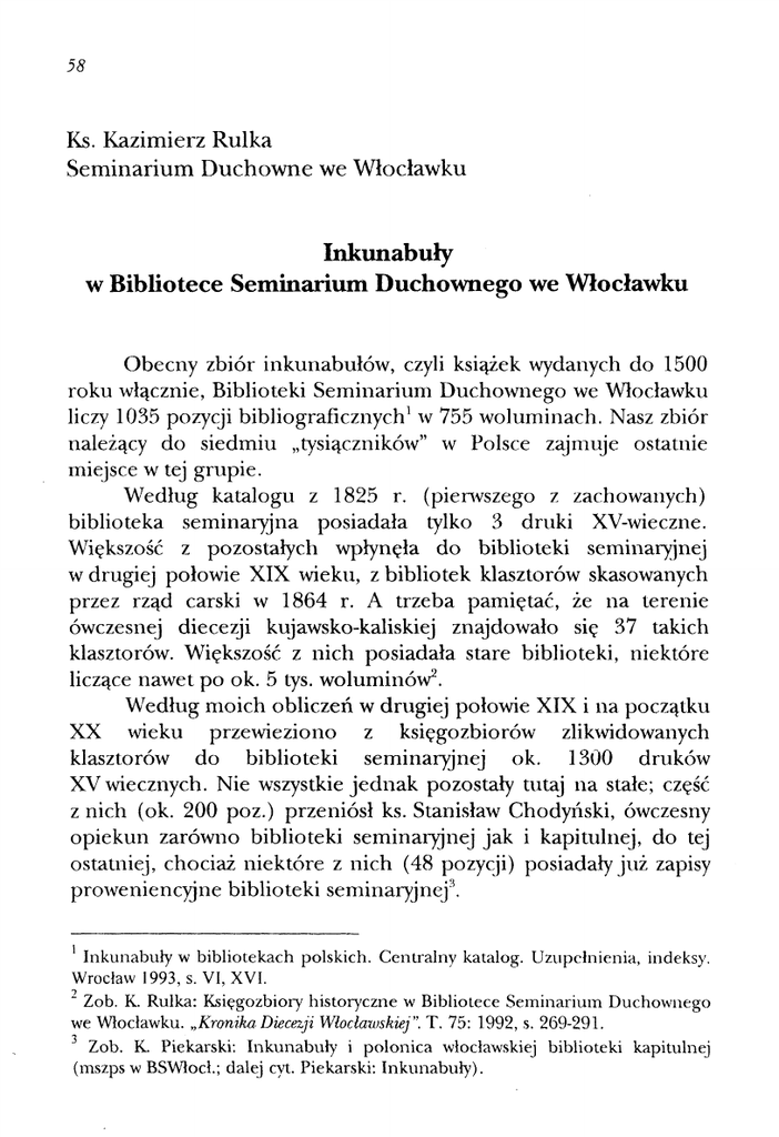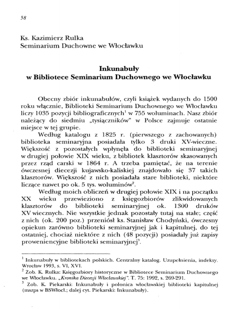 58 Ks. Kazimierz Rulka Seminarium Duchowne we Włocławku Inkunabuły w Bibliotece Seminarium Duchownego we Włocławku Obecny zbiór inkunabułów, czyli książek wydanych do 1500 roku włącznie, Biblioteki Seminarium Duchownego we Włocławku liczy 1035 pozycji bibliograficznych1 w 755 woluminach. Nasz zbiór należący do siedmiu „tysiączników" w Polsce zajmuje ostatnie miejsce w tej grupie. Według katalogu z 1825 r. (pierwszego z zachowanych) biblioteka seminaryjna posiadała tylko 3 druki XV-wieczne. Większość z pozostałych wpłynęła do biblioteki seminaryjnej w drugiej połowie XIX wieku, z bibliotek klasztorów skasowanych przez rząd carski w 1864 r. A trzeba pamiętać, że na terenie ówczesnej diecezji kujawsko-kaliskiej znajdowało się 37 takich klasztorów. Większość z nich posiadała stare biblioteki, niektóre liczące nawet po ok. 5 tys. woluminów2. Według moich obliczeń w drugiej połowie XIX i na początku XX wieku przewieziono z księgozbiorów zlikwidowanych klasztorów do biblioteki seminaryjnej ok. 1300 druków XV wiecznych. Nie wszystkie jednak pozostały tutaj na stałe; część z nich (ok. 200 poz.) przeniósł ks. Stanisław Chodyński, ówczesny opiekun zarówno biblioteki seminaryjnej jak i kapitulnej, do tej ostatniej, chociaż niektóre z nich (48 pozycji) posiadały już zapisy proweniencyjne biblioteki seminaryjnej3. Inkunabuły w bibliotekach polskich. Centralny katalog. Uzupełnienia, indeksy. Wrocław 1993, s. VI, XVI. ~ Zob. K. Rułka: Księgozbiory historyczne w Bibliotece Seminarium Duchownego we Włocławku. „Kronika Diecezji Włocławskiej". T. 75: 1992, s. 269-291. Zob, K. Piekarski: Inkunabuły i polonica włocławskiej biblioteki kapitulnej (mszps w BSWłocł.; dalej cyt. Piekarski: Inkunabuły). ks. Kazimierz Rulka, Inkunabuły w Bibliotece... 59 W pierwszej połowie XX w. doszło jeszcze kilkanaście inkunabułów przekazanych bibliotece przez osoby prywatne (m.in. przez księży Chodyńskich). Trudno coś konkretnego powiedzieć o zwiększaniu się zbioru inkunabułów w bibliotece seminaryjnej, ponieważ nie był on skatalogowany. Spisany w 1890 r. własnoręcznie przez ks. Stanisława Chodynskiego inwentarz działu Pisma Świętego miał na ogół 1110 pozycji 24 druki XV-wieczne. W okresie od 1890 do ok. 1930 r. wpisano do katalogu książkowego (inwentarza) ok. 16 tys. pozycji z ok. 100-tysięcznego księgozbioru. Spośród 13.210 opisów, które się zachowały, ok. 140 dotyczyło druków XVwiecznych. Inkunabuły nie były wówczas wydzielone spośród innych książek ani w miejscu ich przechowywania, ani w katalogu; wydzielenie osobno inkunabułów w magazynie nastąpiło prawdopodobnie podczas przenoszenia księgozbioru seminaryjnego do innego budynku po 1934 r. W 1936 r. zbiorami włocławskimi zainteresował się Kazimierz Piekarski, zbierający materiały do centralnego katalogu inkunabułów. Od 12 IX do 26 X 1936 r. zarejestrował on w bibliotece seminaryjnej 809 inkunabułów 4 . Wraz z późniejszymi uzupełnieniami daje to liczbę ok. 900. Jednakże doliczenie do obecnego zasobu inkunabułów w bibliotece seminaryjnej strat wojennych prowadzi do wniosku, że musiało ich być ok. 1100. Zostały one uporządkowane i otrzymały sygnatury nadane własnoręcznie przez Piekarskiego (na pierwszych kartach kodeksów i na wystających z nich karteluszkach). Oprócz inkunabułów biblioteki seminaryjnej Piekarski spisał również inkunabuły dwóch innych bibliotek włocławskich: Zob. K. Piekarski: Inkunabuły i polonica włocławskiej biblioteki kapitulnej (mszps wBSWłocł.; dalej cyt. Piekarski: Inkunabuły). Z warsztatu Kazimierza Piekarskiego. Listy z lat 1936-1937. Oprać. Alodia Kawecka-Gryczowa, Pamiętnik Literacki. T. 70: 1979, z. 1, s. 256, przyp. 1 (dalej cyt.: Z warsztatu). Piekarski zarejestrował jeszcze wtedy we Włocławku 293 inkunabuły z biblioteki kapitulnej i 35 z biblioteki reformatów; wcześniejsze i późniejsze parodniowe dojazdy do Włocławka przyniosły w wyniku opis dalszych 154 egzemplarzy. 60 FIDES - Biletyn Bibliotek Kościelnych 1-2/96 kapitulnej i reformackiej, a także zbiory cimeliów wszystkich trzech włocławskich bibliotek kościelnych'. Inkunabuły biblioteki seminaryjnej wywiezione przez Niemców w czasie wojny do Poznania zostały zmagazynowane nie wraz z innymi książkami seminaryjnymi w kościele Św. Michała, ale prawdopodobnie - zgodnie z przyjętą przez bibliotekarzy niemieckich praktyką6 - w Bibliotece Uniwersyteckiej. Zdają się to potwierdzać spisy dołączone do 9 skrzyń inkunabułów włocławskich (spisy te zawierają jedynie ich numery inkunabułów według katalogów Haina, Copingera lub GW), sporządzone we wrześniu 1943 r. i podpisane przez Richarda Bussego7, pracownika Biblioteki Uniwersyteckiej; książki przygotowywano prawdopodobnie do wywózki poza Poznań. W tych samych skrzyniach powróciły one 8 X 1945 r. do Włocławka, w liczbie 465 wol8. Była to tylko część inkunabułów seminaryjnych. Reszta powróciła do Włocławka stopniowo w późniejszym czasie. Cenny W bibliotece seminaryjnej zachował się sporządzony w 1956 r. (Archiwum BSWłocł., Korespondencja 1945-1956, pismo z dn. 4 I 1956) odpis maszynopisowy przedwojennych zeszytów rejestracyjnych (z proweniencjami i opisami opraw) Piekarskiego (sygnat. III 674) w trzech częściach: 1) Polonika XVI w. Seminarium Duchownego we Włocławku (61 s., 1132 poz.), 2) Inkunabuły i polonika reformatów włocławskich (8 s., 81 poz.), 3) Inkunabuły i polonika włocławskiej biblioteki kapitulnej ( 56 s., 444 poz.). Brak zatem tej części spisu, który obejmował inkunabuły biblioteki seminaryjnej (w bibliotece seminaryjnej znalazły się, chyba przypadkowo, 35 kartek z opisami, sporządzonymi osobiście przez Piekarskiego, inkunabułów in quarto - nry 522567). Część ta prawdopodobnie spaliła się podczas wojny - zob. Kronika Bibl. Sem. Włoc. Z. 1: 1945-1946, s. 34 (Archiwum B