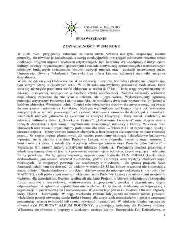 SPRAWOZDANIE Z DZIAŁALNOŚCI W 2010 ROKU W 2010 roku przyjęliśmy założenie, że nasza oferta powinna nie tylko zaspokajać lokalne potrzeby, ale również je kształtować, a swoją atrakcyjnością przyciągać odbiorców również spoza Podkowy. Program imprez i wydarzeń artystycznych był tworzony we współpracy z instytucjami kultury, oświaty, organizacjami społecznymi i zakłada kontynuację sprawdzonych i wartościowych inicjatyw budujących świadomość historii, tradycji miejsca oraz edukacji ustawicznej (m.in. Uniwersytet Otwarty Pokolenia). Rozrywka (np. oferta kinowa, kabarety) stanowiła margines działalności. W ofercie edukacyjnej kładziemy nacisk na edukację muzyczną, teatralną i plastyczną uzupełniając tym samym ofertę miejscowych szkół. W 2010 roku otworzyliśmy pracownię modelarską, która stała się niezwykle popularna wśród chłopców w wieku 8-12 lat. Dużą wagę przywiązujemy do edukacji plastycznej, szczególnie w aspekcie sztuki współczesnej. Podczas wernisaży widzowie mają okazję zapoznać się nie tylko z dziełem, ale i jego twórcą. Wykorzystujemy ogromny potencjał artystyczny Podkowy i okolic oraz fakt, że posiadamy dwie sale wystawowe (po jednej w każdym obiekcie). Wernisaże pełnią również rolę integracyjną środowiska artystycznego, są okazją do nawiązania i odnowienia kontaktów Naszym wyróżnikiem jest bogata oferta dot. koncertów muzycznych w ramach poszczególnych cyklów, skierowana zarówno do dzieci, jak i dorosłych, wielbicieli różnych gatunków (z akcentem na muzykę klasyczną). Duży nacisk kładziemy na edukację kulturalną dzieci („Dziecko w Teatrze”, „Filharmonia Dziecięca” oraz zajęcia stałe z różnych dziedzin), a tym samym wychowanie świadomego odbiorcy i twórcy. W czasie ferii zimowych oraz wakacji organizujemy półkolonie dla dzieci w wieku 8-12 lat zapewniając opiekę i ciekawe zajęcia. Mamy zawsze komplet chętnych, a lista zaczyna się zapełniać na parę miesięcy przed... W czasie imprez plenerowych dla rodzin promujemy ekologię i dziedzictwo kulturowe, wpisując się w zielony charakter Podkowy Leśnej, miasta-ogrodu. Jesteśmy organizatorem 2 konkursów dla dzieci i młodzieży: Recytacji własnego wiersza oraz Piosenki „Rozmaitości” – wspierając tym samym rozwój artystyczny młodego pokolenia. Próbujemy również pracować z młodzieżą starszą, chociaż jest to z pewnością najtrudniejszy odbiorca, często negujący tradycyjne formy przekazu. Dla tej grupy wiekowej organizujemy festiwale FUN PODKO (konkurencje deskorolkowe, jam session, warsztat z sitodruku, graffiti i zinowy) oraz występy lokalnych kapel rockowych. Te inicjatywy powstają we współpracy z młodzieżą. Za sprawą projektu Noce Animacji, udało nam się dotrzeć do widzów w wieku 25-35 lat, którzy wcześniej nie korzystali z naszej oferty. Niestandardowym projektem skierowanym do młodego pokolenia (i nie tylko) był MAPPING, czyli próba stworzenia subiektywnej mapy Podkowy Leśnej z zaznaczonymi miejscami ważnymi dla uczestników. Swoich wielbicieli ma kino Projekt, w którym pokazujemy różnorodne filmy: ambitne i rozrywkowe, kontrowersyjne i „poprawne”, polskie i zagraniczne, często odpowiadając na zgłoszone zapotrzebowanie widzów. Duży nacisk kładziemy na współpracę z organizacjami pozarządowymi i mieszkańcami. Wyrazem tego jest m.in. Festiwal Otwarte Ogrody, który CKiIO koordynuje. W ciągu weekendu (wiosna lub jesień) na terenie miasta prywatni właściciele posesji otwierają swoje furtki i bramy dla wszystkich mieszkańców i gości z zewnątrz, prezentując własną twórczość lub swoich przyjaciół i znajomych. W edukację lokalną wpisuje się również cykl PODKOWY ALBUM RODZINNY, prezentujący zasłużone dla Podkowy rodziny. Włączamy się również w imprezy o większym zasięgu jak np. Europejskie Dni Dziedzictwa, w 1 ramach których z okazji 85. rocznicy powstania Miasta-Ogrodu Podkowy Lesnej zaprezentowany został plenerowy spektakl „Dżentelmen i Spółka”, przypominający postać Stanisława Wilhelma Lilpopa, współzałożyciela miasta. Spektakl był zbiorową kreacją mieszkańców Podkowy, Milanówka i Brwinowa, z udziałem jednego aktora profesjonalnego – Andrzeja Precigsa. W 2010 roku, wpisując się w obchody Roku Chopinowskiego, zorganizowaliśmy Festiwal „Chopin-Inspiracje 1810-2010”, w ramach którego wystąpili polscy i zagraniczni pianiści. Odbiorcami naszej oferty są, oprócz podkowian, również mieszkańcy sąsiadującej z nami gminy Brwinów, Milanówka, a także mieszkańcy Warszawy. Dotyczy to szczególnie oferty weekendowej. W koncertach uczestniczyło ogółem około 1000 osób, w tym znamienici goście ze świata muzycznego m. in. kompozytor Kazimierz Kord, prof. Kazimerz Gierżod, Bohdan Pociej – krytyk muzyczny, Janusz Marynowski – dyrektor orkiestry Sinfonia Varsovia, a także ambasadorowie m.in. Kanady, Australii, Nowej Zelandii i Japonii. Udało się dzięki temu w krótkim czasie zbudować dobrą markę instytucji. W 2010 roku obchodziliśmy 85 rocznicę powstania Podkowy Leśnej i z tej okazji CKiIO postanowiło zrealizować program przede wszystkim z udziałem podkowiańskich artystów, podkreślając ich obecność i znaczenie w podkowiańskim środowisku. Naszych rodzimych twórców mogliśmy zaprezentować w niemal każdej dziedzinie twórczości. Działalność programowa: CHOPIN W KASYNIE Muzyka Fryderyka Chopina w różnorodnych odsłonach wykonawczych recitale, spektakle słowno muzyczne. Przedsięwzięcie zrealizowane ze środków MKiDN w ramach programu: 200 koncertów na 200-lecie urodzin Fryderyka Chopina, we współpracy z Towarzystwem im. Fryderyka Chopina w Warszawie, które wypożyczyło fortepian. 10 stycznia - pianistka Karolina Marchlewska wykonała Nokturny, Etiudy i Mazurki kompozytora Liczba uczestników: 50 osób 24 stycznia - z recitalem chopinowskim wystąpiła pian