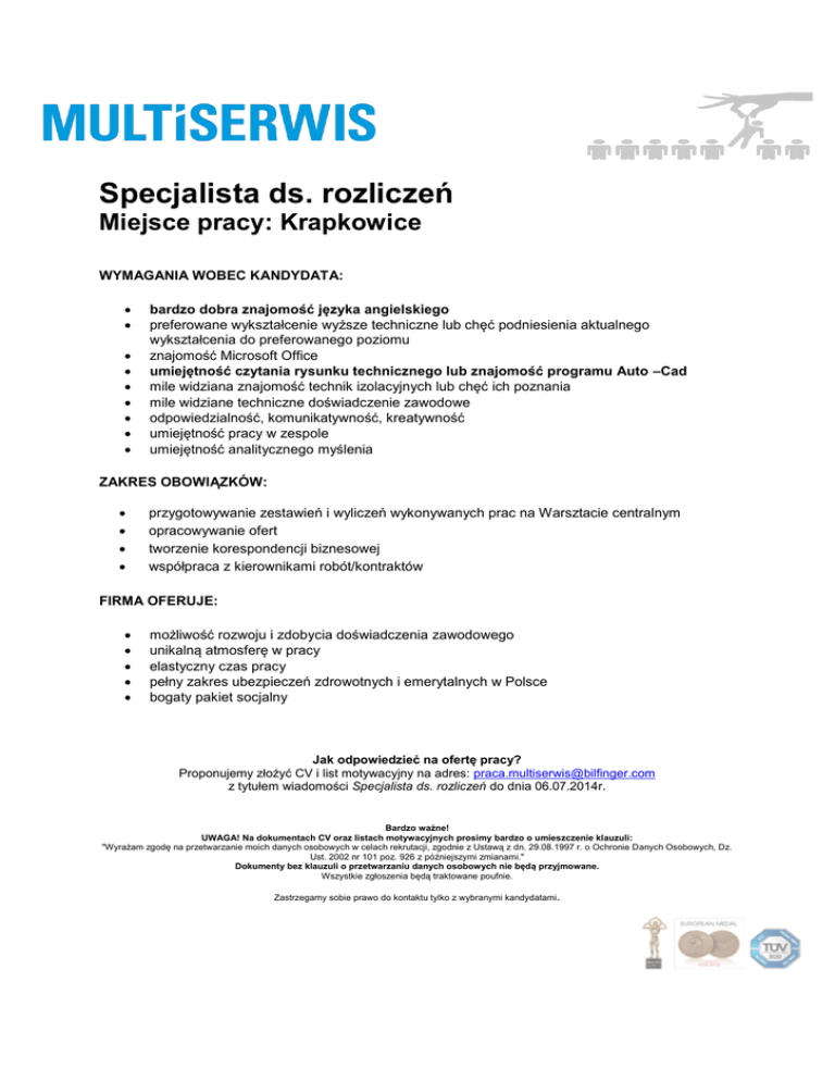 Specjalista ds. rozliczeń Miejsce pracy: Krapkowice WYMAGANIA WOBEC KANDYDATA: bardzo dobra znajomość języka angielskiego preferowane wykształcenie wyższe techniczne lub chęć podniesienia aktualnego wykształcenia do preferowanego poziomu znajomość Microsoft Office umiejętność czytania rysunku technicznego lub znajomość programu Auto –Cad mile widziana znajomość technik izolacyjnych lub chęć ich poznania mile widziane techniczne doświadczenie zawodowe odpowiedzialność, komunikatywność, kreatywność umiejętność pracy w zespole umiejętność analitycznego myślenia ZAKRES OBOWIĄZKÓW: przygotowywanie zestawień i wyliczeń wykonywanych prac na Warsztacie centralnym opracowywanie ofert tworzenie korespondencji biznesowej współpraca z kierownikami robót/kontraktów FIRMA OFERUJE: możliwość rozwoju i zdobycia doświadczenia zawodowego unikalną atmosferę w pracy elastyczny czas pracy pełny zakres ubezpieczeń zdrowotnych i emerytalnych w Polsce bogaty pakiet socjalny Jak odpowiedzieć na ofertę pracy? Proponujemy złożyć CV i list motywacyjny na adres: [email protected] z tytułem wiadomości Specjalista ds. rozliczeń do dnia 06.07.2014r. Bardzo ważne! UWAGA! Na dokumentach CV oraz listach motywacyjnych prosimy bardzo o umieszczenie klauzuli: "Wyrażam zgodę na przetwarzanie moich danych osobowych w celach rekrutacji, zgodnie z Ustawą z dn. 29.08.1997 r. o Ochronie Danych Osobowych, Dz. Ust. 2002 nr 101 poz. 926 z późniejszymi zmianami." Dokumenty bez klauzuli o przetwarzaniu danych osobowych nie będą przyjmowane. Wszystkie zgłoszenia będą traktowane poufnie. Zastrzegamy sobie prawo do kontaktu tylko z wybranymi kandydatami.