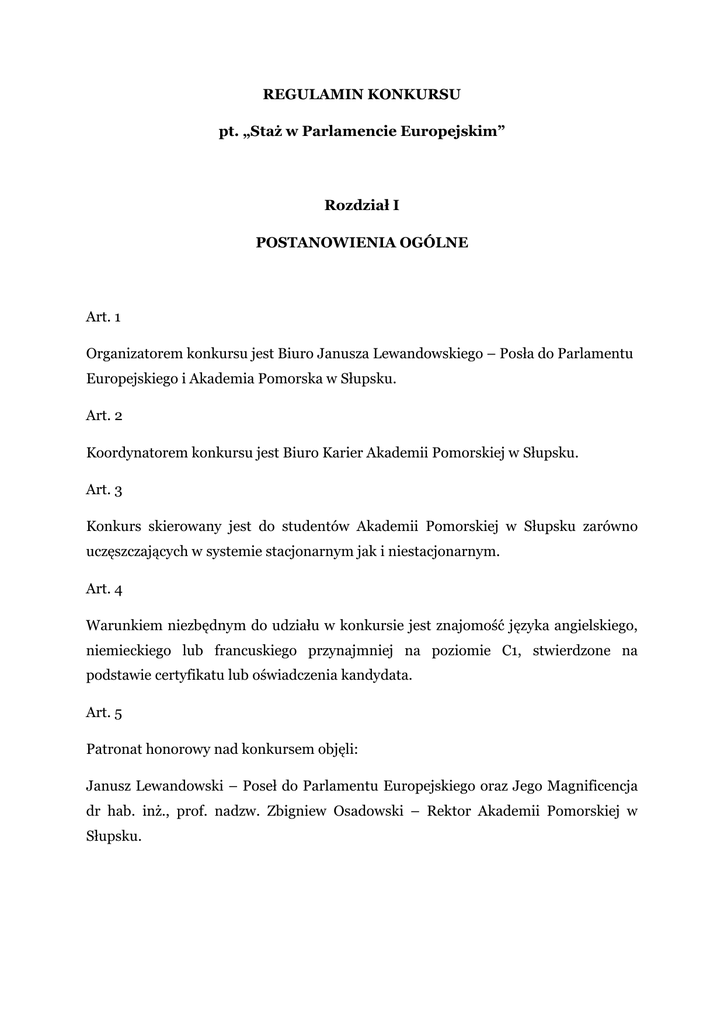REGULAMIN KONKURSU pt. „Staż w Parlamencie Europejskim” Rozdział I POSTANOWIENIA OGÓLNE Art. 1 Organizatorem konkursu jest Biuro Janusza Lewandowskiego – Posła do Parlamentu Europejskiego i Akademia Pomorska w Słupsku. Art. 2 Koordynatorem konkursu jest Biuro Karier Akademii Pomorskiej w Słupsku. Art. 3 Konkurs skierowany jest do studentów Akademii Pomorskiej w Słupsku zarówno uczęszczających w systemie stacjonarnym jak i niestacjonarnym. Art. 4 Warunkiem niezbędnym do udziału w konkursie jest znajomość języka angielskiego, niemieckiego lub francuskiego przynajmniej na poziomie C1, stwierdzone na podstawie certyfikatu lub oświadczenia kandydata. Art. 5 Patronat honorowy nad konkursem objęli: Janusz Lewandowski – Poseł do Parlamentu Europejskiego oraz Jego Magnificencja dr hab. inż., prof. nadzw. Zbigniew Osadowski – Rektor Akademii Pomorskiej w Słupsku. Rozdział II PRZEBIEG KONKURSU Art. 6 Konkurs składa się z II etapów. I etap polega na nakręceniu amatorskiego filmu, natomiast II etap polega na rozmowie kwalifikacyjnej z kandydatem. Art. 7 Warunkiem niezbędnym do udziału w konkursie jest złożenie deklaracji w Biurze Karier Akademii Pomorskiej w Słupsku w terminie nie później niż do 5 listopada 2016 roku. Art. 8 I etap konkursu polega na nakręceniu amatorskiego filmu pt. „Ja i moje miejsce w Europie”. Film nie powinien być dłuższy niż 10 min. Celem nakręconego filmu jest zaprezentowanie przez studenta swoich zainteresowań i zdolności, a także siebie. Specjalnie powołana pięcioosobowa komisja konkursowa, będzie oceniała filmy pod kątem: oryginalności, jakości, wartości merytorycznej, a także zaangażowania środowiska lokalnego. Film należy dostarczyć na nośniku CD/DVD do 15 listopada 2016 roku do Biura Karier Akademii Pomorskiej w Słupsku. Dostarczenie filmu jest jednoznaczne z wyrażeniem zgody przez studenta na opublikowanie jego filmu na Youtube oraz stronie internetowej Akademii Pomorskiej w Słupsku. Art. 9 Komisja Konkursowa może maksymalnie dla każdego filmu przyznać 50 punktów. Do II etapu zakwalifikują się uczestnicy, których filmy uzyskają przynajmniej 27 punktów. Art. 10 II etap polega na rozmowie kwalifikacyjnej przeprowadzonej przez 3 osobową komisję konkursową. Część rozmowy kwalifikacyjnej zostanie przeprowadzona w jednym z języków obcych zadeklarowanych przez studenta. Podczas rozmowy kwalifikacyjnej oceniany będzie poziom kompetencji językowych, wiedza z zakresu funkcjonowania instytucji Unii Europejskiej, a także dotychczasowa aktywność na Akademii Pomorskiej w Słupsku. Podczas rozmowy kwalifikacyjnej komisja konkursowa przyzna punkty w następujących kategoriach: • kompetencje językowe: 30 punktów; • wiedza z zakresu funkcjonowania instytucji UE: 20 punktów; • aktywność studencka na Akademii Pomorskiej w Słupsku: 15 punktów; • średnia ocen za ostatni rok akademicki: 10 punktów. II etap konkursu wygrywa uczeń, który uzyska najwyższą liczbę punktów. Ogłoszenie wyników odbędzie się 25 listopada 2016 roku o godz. 12.00. Rozdział III NAGRODA Art. 11 Nagrodą główną w konkursie jest staż w Parlamencie Europejskim ufundowany przez Janusza Lewandowskiego – Posła do Parlamentu Europejskiego. Art. 12 Staż trwać będzie od 13 lutego do 30 kwietnia 2017 roku. Art. 13 Stażysta otrzyma 1000 euro miesięcznie na pokrycie kosztów związanych ze stażem (podróż, zakwaterowanie, wyżywienie, etc.). Art. 14 Stażysta otrzyma wsparcie w otrzymaniu indywidualnej organizacji studiów (IOS) w semestrze letnim 2016/2017. Rozdział IV POSTANOWIENIA KOŃCOWE Art. 15 Organizator zastrzega sobie prawo zmian w regulaminie. Art. 16 W przypadku wątpliwości w zapisach regulaminu, decyzje podejmuje Biuro Karier Akademii Pomorskiej w Słupsku, której decyzje są ostateczne i nie ma od nich odwołania. Art. 17 Student przesyłając zgłoszenie do udziału w konkursie w pełni akceptuje warunki konkursu i postanowienia regulaminu. Art. 18 Na wszelkie pytania i wątpliwości odpowiadają pracownicy Biura Karier Akademii Pomorskiej w Słupsku: Biuro Karier ul. Westerplatte 64, pokój 325. 76-200 Słupsk [email protected]