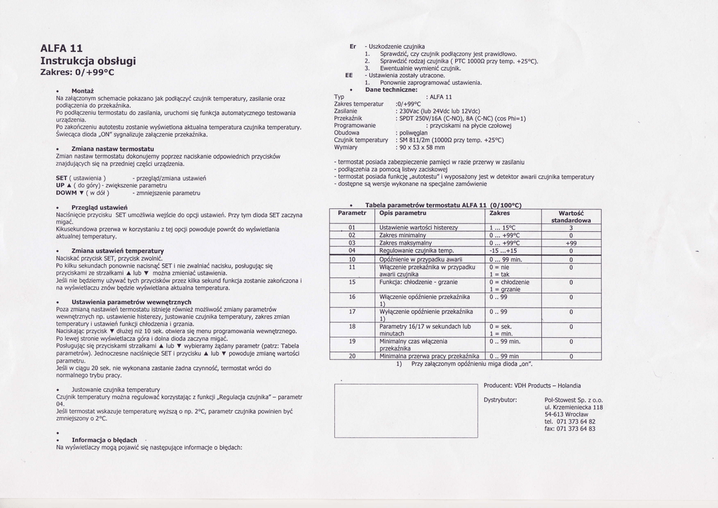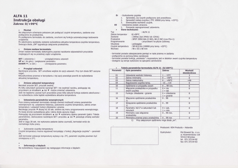 ALFA 11 Instrukcja obsługi Zakres: O/+99oC . Montaż jak podtączyć pokazano Na załączonym schemacie czujniktemperatury/ zasi|anie oraz podłączenia do przekaŹnika. Po podłączeniu termostatu do zasi|ania, uruchomi sięfunkcjaautomatycznego testowania urządzenia. Po Zakoczeniuautotestu zostanieWyśWiet|ona aKua|natemperatura czujnikatemperatury. pzekaźnika. świecąca dioda,,oN,, załączenie sygnaIizuje o Zmiana nastaw termostatu poprzeznaciskanie przyciskÓw zmiannastaW termostatu dokonujemy odpowiednich znajdujących się na przedniejczęści uządzenia. - prueg|ąd/zmiana ustawie parametru UP ( do gÓry)- zwiększenie .zmniejszenieparametru DowM V (wdoł) SET ( ustawienia) . Przegląd ustawie przyciskusET umoż|iwia Naciśnięcie wejście do opcjiustawie. Przytym diodasET zaczyna migać' przerwaW korzystaniuz tej opcjipowodujepowrÓtdo wyświet|ania Kikusekundowa aKualnejtemperatury. . Zmiana ustawie temperatury NaciskaćprzycisksET, przyciskzwoln|ć. ponownienacisnąć Po ki|kusekundach sET i niezwa|niać nacisku,posługując się przyciskaml ze strzałkami |ubV można zmieniać ustawienia. Jeś|i nie będziemyużywać Ęch przyciskÓwpzez kilkasekundfunkcjazostaniezako czonai na WyśWiet|aczu znÓw będziewyświet|ana aktua|na temperatura. o UstawieniaparametrÓwwewnętrznych Pozazmianąnastawietermostatu istniejerÓwnież możliwość zmianyparametrÓw justowanie WeWnętrznych np.ustawienie histerezy, czujnikatemperatury, zakreszmian temperatury i ustawie funkcjichłodzenia i grzania' przyciskV dłużej Naciskając niż10 sek.otwieras|ęmenuprogramowania wewnętrznego. gÓra i do|nadiodazaczynamigać. Po |ewejstronieWyświet|acza parametr (patrz:Tabe|a Posługując sięprzyciskami strzałkami ^ lub V Wybieramy żądany parametrÓW). Jednoczesne naciśnięcie sET i przyciskuA |ubV powoduje zm|anę wartości parametru. W ciągu20 sek. nie Wykonanazastanieżadnaczynność, Jeś|i termostatwrÓc|do normalnego trybuprary. . Justowanie czujnikatemperatury - parametr czujniktemperatury możnaregu|ować kozystającz funkcji,,Regu|acja czujnika', 04. Jeś|i termostat Wskazuje temperaturę Wyższą o np.2oC,parametr czujnikapowinien być zmniejszony o zoc. . Informacjao b|ędach Na wyświet|aczy mogąpojawićsię następujące informacjeo blędach: - Uszkodzenieczujnika 1' Sprawdzić,czy czujnik podłączonyjest prawidłowo. 2. Sprawdzić rodzaj czujnika ( PTc 1000a przy temp. +25"c). 3. Ewentua|niewymienićczujnik' - Ustawienia zostałyutracone' EE 1. Ponowniezaprogramować ustawienia' o Dane techniczne: Typ : ALFA 11 Zakrestemperatur :0/+99oC Zasilanie : 230vac(lub24vdclub 12Vdc) Przekaźnik : SPDT2s0V/16A(c-No),8A (C-Nc)(cosPhi=1) Programowanie : przyciskami na płycieczotowej Obudowa : poIiwęgIan Czujnik temperatury : SM 811/2m(1000Qprzytemp.+25oC) Wymiary :90x53x58mm Er - termostat posiadazabezpieaenie pamięciW raziepnerwyW zasi|aniu - podłączenia za pomocą|istwyzaciskowej - termostatposiadafunkcję,,autotestu,, jest w detektorawariiczujnikatemperatury i Wyposażony . dostępne są Wersjewykonane na specja|ne zamÓwienie . Tabela Parametr Opis parametru 01 02 03 04 10 11 Zakres Ustawienie wartosci histerezv Zakres mlnimalnv Zakres maksvmalnv Requlowanieczuinikatemp. ooÓźnienieW Drzvoadkuawarii przekaŹni|G Włączenie W przypadku awarii or rinike 15 - grzanie Funkcja: chłodzenie 16 WłączenieopÓŹnieniepzekaźnika 150C 0... +99oC 0... +990c -J.J...+lJ 0 ... 99 min. 0=nie 1=tak 0 = chłodzenie 1= orzanie Wa ość standardowa 3 0 +99 0 0 0 0 noo 0 0..99 0 0 = sek. 1 = min. 0 .. 99 min. 0 0 .. 99 min 0 1) L7 18 19 z0 Wyłączenie opÓŹnieniepzekaŹnika 1) Parametry lub 16/17w sekundach mlnutach MinimaInyczas Włączenia ooekaźnika Minima|na I) nŹpMa nraru nf,FkłźnikA Pr4 załączonym opÓŹnieniu migadioda,,on''. 0 - Holandia Producent: VDHProducts Dystrybutor: Pol-Stowest Sp. z o.o. u|'KŹemieniecka 118 54.613Wrocław tel. 0713736482 fax:07137364 83