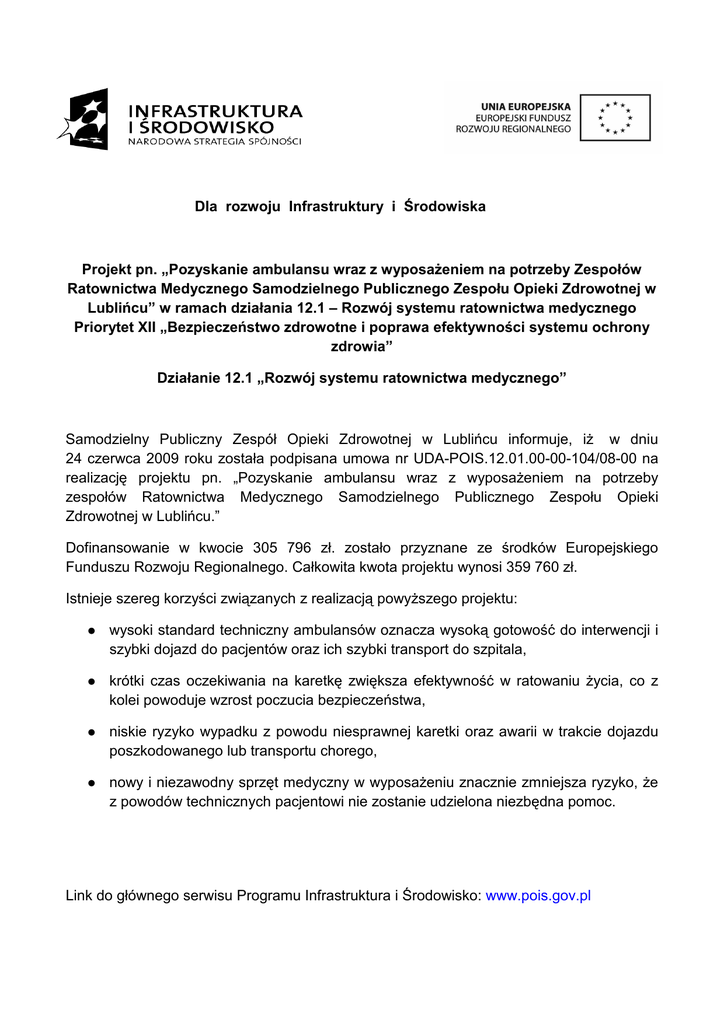 Dla rozwoju Infrastruktury i Środowiska Projekt pn. „Pozyskanie ambulansu wraz z wyposaŜeniem na potrzeby Zespołów Ratownictwa Medycznego Samodzielnego Publicznego Zespołu Opieki Zdrowotnej w Lublińcu” w ramach działania 12.1 – Rozwój systemu ratownictwa medycznego Priorytet XII „Bezpieczeństwo zdrowotne i poprawa efektywności systemu ochrony zdrowia” Działanie 12.1 „Rozwój systemu ratownictwa medycznego” Samodzielny Publiczny Zespół Opieki Zdrowotnej w Lublińcu informuje, iŜ w dniu 24 czerwca 2009 roku została podpisana umowa nr UDA-POIS.12.01.00-00-104/08-00 na realizację projektu pn. „Pozyskanie ambulansu wraz z wyposaŜeniem na potrzeby zespołów Ratownictwa Medycznego Samodzielnego Publicznego Zespołu Opieki Zdrowotnej w Lublińcu.” Dofinansowanie w kwocie 305 796 zł. zostało przyznane ze środków Europejskiego Funduszu Rozwoju Regionalnego. Całkowita kwota projektu wynosi 359 760 zł. Istnieje szereg korzyści związanych z realizacją powyŜszego projektu: wysoki standard techniczny ambulansów oznacza wysoką gotowość do interwencji i szybki dojazd do pacjentów oraz ich szybki transport do szpitala, krótki czas oczekiwania na karetkę zwiększa efektywność w ratowaniu Ŝycia, co z kolei powoduje wzrost poczucia bezpieczeństwa, niskie ryzyko wypadku z powodu niesprawnej karetki oraz awarii w trakcie dojazdu poszkodowanego lub transportu chorego, nowy i niezawodny sprzęt medyczny w wyposaŜeniu znacznie zmniejsza ryzyko, Ŝe z powodów technicznych pacjentowi nie zostanie udzielona niezbędna pomoc. Link do głównego serwisu Programu Infrastruktura i Środowisko: www.pois.gov.pl