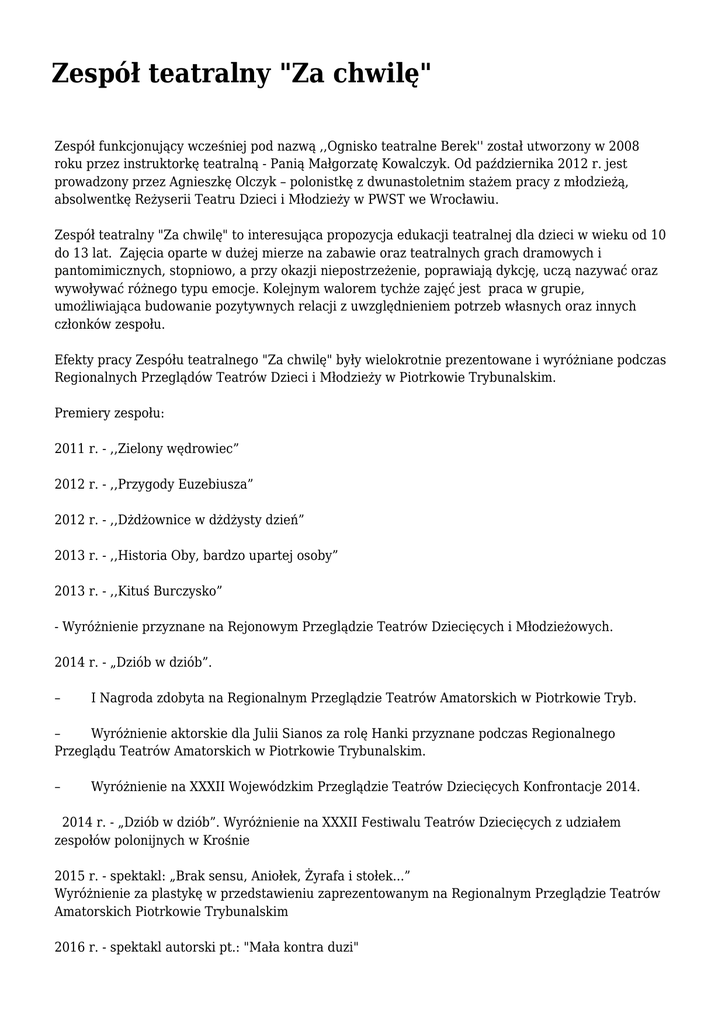 Zespół teatralny "Za chwilę" Zespół funkcjonujący wcześniej pod nazwą ,,Ognisko teatralne Berek'' został utworzony w 2008 roku przez instruktorkę teatralną - Panią Małgorzatę Kowalczyk. Od października 2012 r. jest prowadzony przez Agnieszkę Olczyk – polonistkę z dwunastoletnim stażem pracy z młodzieżą, absolwentkę Reżyserii Teatru Dzieci i Młodzieży w PWST we Wrocławiu. Zespół teatralny "Za chwilę" to interesująca propozycja edukacji teatralnej dla dzieci w wieku od 10 do 13 lat. Zajęcia oparte w dużej mierze na zabawie oraz teatralnych grach dramowych i pantomimicznych, stopniowo, a przy okazji niepostrzeżenie, poprawiają dykcję, uczą nazywać oraz wywoływać różnego typu emocje. Kolejnym walorem tychże zajęć jest praca w grupie, umożliwiająca budowanie pozytywnych relacji z uwzględnieniem potrzeb własnych oraz innych członków zespołu. Efekty pracy Zespółu teatralnego "Za chwilę" były wielokrotnie prezentowane i wyróżniane podczas Regionalnych Przeglądów Teatrów Dzieci i Młodzieży w Piotrkowie Trybunalskim. Premiery zespołu: 2011 r. - ,,Zielony wędrowiec” 2012 r. - ,,Przygody Euzebiusza” 2012 r. - ,,Dżdżownice w dżdżysty dzień” 2013 r. - ,,Historia Oby, bardzo upartej osoby” 2013 r. - ,,Kituś Burczysko” - Wyróżnienie przyznane na Rejonowym Przeglądzie Teatrów Dziecięcych i Młodzieżowych. 2014 r. - „Dziób w dziób”. – I Nagroda zdobyta na Regionalnym Przeglądzie Teatrów Amatorskich w Piotrkowie Tryb. – Wyróżnienie aktorskie dla Julii Sianos za rolę Hanki przyznane podczas Regionalnego Przeglądu Teatrów Amatorskich w Piotrkowie Trybunalskim. – Wyróżnienie na XXXII Wojewódzkim Przeglądzie Teatrów Dziecięcych Konfrontacje 2014. 2014 r. - „Dziób w dziób”. Wyróżnienie na XXXII Festiwalu Teatrów Dziecięcych z udziałem zespołów polonijnych w Krośnie 2015 r. - spektakl: „Brak sensu, Aniołek, Żyrafa i stołek...” Wyróżnienie za plastykę w przedstawieniu zaprezentowanym na Regionalnym Przeglądzie Teatrów Amatorskich Piotrkowie Trybunalskim 2016 r. - spektakl autorski pt.: "Mała kontra duzi" I Nagroda zdobyta podczas Regionalnego Przeglądu Teatrów Amatorskich w Piotrkowie Trybunalskim I miejsce dla Anny Pabin w XX Małym Miejskim Konkursie Recytatorskim w Piotrkowie Trybunalskim III miejsce dla Wiktora Chimiaka w XX Małym Miejskim Konkursie Recytatorskim w Piotrkowie Trybunalskim