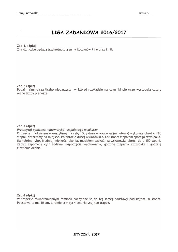 Imię i nazwisko …………………………………………………................... klasa 5...... LIGA ZADANIOWA 2016/2017 Zad 1. (3pkt) Znajdź liczbę będącą trzykrotnością sumy iloczynów 7 i 6 oraz 9 i 8. Zad 2 (3pkt) Podaj najmniejszą liczbę nieparzystą, w której rozkładzie na czynniki pierwsze występują cztery różne liczby pierwsze. Zad 3 (4pkt) Przeczytaj opowieśc matematyka - zapalonego wędkarza. O trzeciej nad ranem wyruszyliśmy na ryby. Gdy duża wskazówka (minutowa) wykonała obrót o 180 stopni, dotarliśmy na miejsce. Po obrocie dużej wskazówki o 120 stopni złapałem sporego szczupaka. Na kolejną rybę, średniej wielkości okonia, musiałem czekać, aż wskazówka obróci się o 150 stopni. Zapisz zapomocą cyfr godzinę rozpoczęcia wędkowania, godzinę złapania szczupaka i godzinę złowienia okonia. Zad 4 (4pkt) W trapezie równoramiennym ramiona nachylone są do tej samej podstawy pod kątem 60 stopni. Podstawa ta ma 10 cm, a ramiona mają 4 cm. Narysuj ten trapez. STYCZEŃ 2017 Imię i nazwisko …………………………………………………................... klasa 5...... Zad 5 (5pkt) W prostokącie, którego obwód jest równy 48 cm, różnica odległości punktu przecięcia przekątnych od dwu sąsiednich boków wynosi 3 cm. Oblicz długości boków prostokąta. Zad. 6 ( 3 pkt. ) Gwiazdka w liczbie 28692* oznacza cyfrę jedności. Jaka to cyfra, jeżeli ta liczba jest podzielna jednocześnie przez 3 i 4? Zad. 7 ( 4 pkt. ) Królicza rodzina, składająca się z trzech królików, zjadła w ciągu tygodnia 73 marchewki. Tata królik zjadł o 5 marchewek więcej niż mama, a ich synek zjadł 12 marchewek. Ile marchewek zjadła mama w ciągu tego tygodnia? Zad. 8 ( 4 pkt. ) W dwóch pudełkach jest razem 48 zapałek. Jeśli z pierwszego pudełka wyjmiemy 13 zapałek, a z drugiego 23, to w obu pudełkach będzie po tyle samo zapałek . Ile zapałek jest w pierwszym, a ile w drugim pudełku? STYCZEŃ 2017