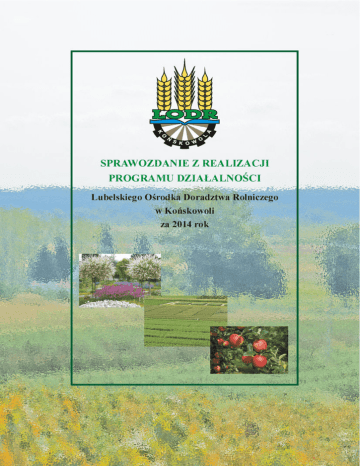 SPIS TREŚCI I. WSTĘP.............................................................................................................................. 2 1. Status prawny, zadania .............................................................................................. 2 1.1. Realizacja zadań LODR w Końskowoli ............................................................... 2 1.2. Komórki organizacyjne biorące udział w realizacji zadań w 2014 r. ................... 5 1.3. Metodologia prac nad sprawozdaniem ................................................................. 6 1.4. Priorytety realizowanych działań w LODR w Końskowoli w roku 2014: ........... 7 II. PRIORYTETY DZIAŁAŃ REALIZOWANYCH W LODR W KOŃSKOWOLI W ROKU 2014 .............................................................................................................. 10 1. Priorytet 1. Poprawa konkurencyjności gospodarstw rolnych w województwie lubelskim ...................................................................................... 10 1.1. Program 1. Transfer innowacji technologicznych .............................................. 10 1.2. Program 2. Popularyzacja i kształcenie rolników w zakresie poprawy jakości produktów rolnych (Ŝywności) i dobrej praktyki rolniczej................................. 37 1.3. Program 3. Pomoc rolnikom w zakresie ukierunkowania i zmiany profilu produkcji w aspekcie ekonomicznym ................................................................ 44 1.4. Program 4. Ułatwienie gospodarstwom funkcjonowania na rynku poprzez zrzeszanie się w grupy producentów rolnych z uwzględnieniem róŜnych form prawnych wspólnego działania ........................................................................... 60 2. Priorytet 2. ZrównowaŜony rozwój obszarów wiejskich.................................. 62 2.1. Program 1. Działania proekologiczne i ochrona środowiska .............................. 62 2.2. Program 2. Wspieranie rozwoju przedsiębiorczości i aktywizacja mieszkańców obszarów wiejskich ............................................................................................. 77 3. Priorytet 3. Promowanie nowoczesnych myśli technologicznych i doradztwa .................................................................................................................. 96 3.1. Program 1. Upowszechnianie i wdraŜanie wiedzy rolniczej .............................. 96 3.2. Program 2. Współpraca z organizacjami okołorolniczymi ............................... 105 3.3. Działalność wydawnicza ................................................................................... 109 3.4. Projekty zrealizowane w 2014 r. ....................................................................... 110 4. Priorytet 4. Zarządzanie Lubelskim Ośrodkiem Doradztwa Rolniczego ... 116 III. ZESTAWIENIE USŁUG DORADCZYCH PLANOWANYCH W LODR W KOŃSKOWOLI W 2014 R................................................................................... 123 1 I. WSTĘP 1. Status prawny, zadania Lubelski Ośrodek Doradztwa Rolniczego w Końskowoli w roku 2014 realizował zadania i usługi z zakresu doradztwa rolniczego jako samorządowa wojewódzka osoba prawna działająca na podstawie: 1. Ustawy z dnia 22 października 2004 r. o jednostkach doradztwa rolniczego (z późniejszymi zmianami) Dz. U. z 19.04.2013 r. poz. 474. 2. Uchwały Nr CCXXXIX/4915/2014 Zarządu Województwa Lubelskiego z dnia 8 kwietnia 2014 r. w sprawie nadania Statutu Lubelskiemu Ośrodkowi Doradztwa Rolniczego w Końskowoli. 3. Uchwały Nr CCXXXIX/4916/2014 Zarządu Województwa Lubelskiego z dnia 8 kwietnia 2014 r. w sprawie zatwierdzenia Regulaminu Organizacyjnego Lubelskiego Ośrodka Doradztwa Rolniczego w Końskowoli. 1.1. Realizacja zadań LODR w Końskowoli Specjaliści i doradcy LODR w Końskowoli realizując podstawowe zadania stojące przed doradztwem udzielali wszechstronnej pomocy rolnikom oraz mieszkańcom obszarów wiejskich w celu zwiększenia dochodów z gospodarstwa rolnego, produkcji bezpiecznej Ŝywności oraz działań mających na celu poprawę warunków Ŝycia rodzin wiejskich. Zrealizowano szereg działań w róŜnych obszarach poprzez: − doradztwo indywidualne i grupowe, − organizowanie szkoleń, seminariów, konferencji, kursów, − organizowanie wystaw, pokazów, kolekcji, demonstracji i innych przedsięwzięć upowszechniających wiedzę rolniczą, nowe technologie produkcji i promujących produkty i wyroby przetwórstwa rolno-spoŜywczego, − sporządzanie opracowań ekonomicznych, finansowych i technologicznych, − prowadzenie działalności informacyjnej i wydawniczej. Realizacja zadań za 2014 r. ogółem: Nazwa zadania Ilość Liczba uczestników 1044 22172 158 2343 48 37 1318 43241 1937 498 22 468 705 1052 220 276 1226 2920 - 151 - Zadania nieodpłatne Szkolenia Szkolenia praktyczne w tym: kursy bezpłatne ekologiczne, agroturystyczne i Ŝywieniowe Szkolenia wyjazdowe Konferencje/Seminaria Wykłady Porady Zadania wdroŜeniowo-upowszechnieniowe Artykuły (do gazet i na stronę internetową) Audycje telewizyjne i radiowe Monitoring gospodarstw rolnych (ankiety, embargo) Informacje rynkowe Cotygodniowe notowania targowiskowe Cotygodniowe notowania do MRiRW Notowania cen środków do produkcji rolnej Notowania cen nawozów mineralnych dla CDR Brwinów 2 Analiza kształtowania się relacji cen na produkty rolnicze i środki do produkcji Opracowanie kalkulacji opłacalności produkcji Imprezy wystawienniczo-targowe/Promocja działalności LODR na doŜynkach i innych imprezach Konkursy Udział w komisjach klęskowych Udział w komisjach konkursowych Udział w posiedzeniach rad gmin, miast, powiatów, itp. Projekt pt. „Szkolenia w zakresie stosowania środków ochrony roślin z uwzględnieniem zasad Integrowanej Ochrony Roślin w woj. lubelskim” Projekt pt. „Integrowana Produkcja Roślin” Zadania odpłatne Usługi doradcze w tym: Wniosek o dopłatę do materiału siewnego P