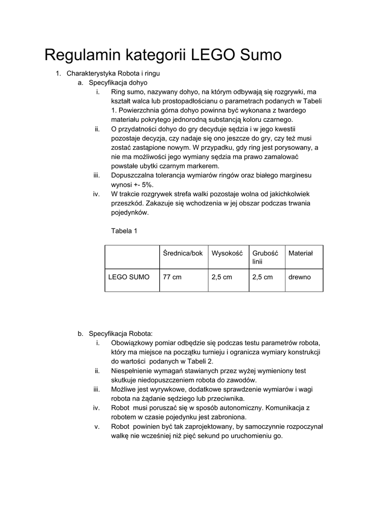 Regulamin kategorii LEGO Sumo 1. Charakterystyka Robota i ringu a. Specyfikacja dohyo i. Ring sumo, nazywany dohyo, na którym odbywają się rozgrywki, ma kształt walca lub prostopadło cianu o parametrach podanych w Tabeli 1. Powierzchnia górna dohyo powinna być wykonana z twardego materiału pokrytego jednorodną substancją koloru czarnego. ii. O przydatno ci dohyo do gry decyduje sędzia i w jego kwestii pozostaje decyzja, czy nadaje się ono jeszcze do gry, czy też musi zostać zastąpione nowym. W przypadku, gdy ring jest porysowany, a nie ma możliwo ci jego wymiany sędzia ma prawo zamalować powstałe ubytki czarnym markerem. iii. Dopuszczalna tolerancja wymiarów ringów oraz białego marginesu wynosi + 5%. iv. W trakcie rozgrywek strefa walki pozostaje wolna od jakichkolwiek przeszkód. Zakazuje się wchodzenia w jej obszar podczas trwania pojedynków. Tabela 1 LEGO SUMO rednica/bok 77 cm Wysoko ć Grubo ć linii Materiał 2,5 cm 2,5 cm drewno b. Specyfikacja RobotaŚ i. Obowiązkowy pomiar odbędzie się podczas testu parametrów robota, który ma miejsce na początku turnieju i ogranicza wymiary konstrukcji do warto ci podanych w Tabeli 2. ii. Niespełnienie wymagań stawianych przez wyżej wymieniony test skutkuje niedopuszczeniem robota do zawodów. iii. Możliwe jest wyrywkowe, dodatkowe sprawdzenie wymiarów i wagi robota na żądanie sędziego lub przeciwnika. iv. Robot musi poruszać się w sposób autonomiczny. Komunikacja z robotem w czasie pojedynku jest zabroniona. v. Robot powinien być tak zaprojektowany, by samoczynnie rozpoczynał walkę nie wcze niej niż pięć sekund po uruchomieniu go. Tabela 2 Klasa Wysoko ć [cm] Szeroko ć [cm] Długo ć [cm] Masa [g] LEGO SUMO Bez limitu 20 20 1000 vi. Robot musi być złożony tylko i wyłącznie z klocków typu „LEGO”. Ilo ć klocków nie jest ograniczona, lecz masa nie może przekraczać dopuszczalnej warto ci. Elementy ELEKTRONICZNE są ci le ograniczone do podanych poniżejŚ ● 1 sterownik kostka ● 3 silniki ● 2 czujniki dotyku ● 1 czujnik koloru lub natężenie wiatła ● 1 dalmierz ultradźwiękowy lub czujnik podczerwieni vii. Posiadanie większej ilo ci czę ci elektronicznych lub silników (podpunkt vi.) wiąże się z niedopuszczeniem robota do zawodów. 2. Specyfikacja konkurencji a. Nie ma ograniczeń dotyczących liczby robotów wystawianych przez jedną drużynę w obrębie danej kategorii. Jedynym warunkiem jest posiadanie nieidentycznych robotów. b. Celem konkurencji jest wypchnięcie przeciwnika poza ring. Rundę przegrywa ten robot, który jako pierwszy dotknie podłoża znajdującego się w strefie walki. c. Konkurencje składają się z eliminacji i rozgrywek finałowych. W przypadku gdy liczba startujących robotów jest mniejsza od 9 dopuszcza się rozegranie samych finałów. Szczegóły opisane zostały w punkcie trzecim zatytułowanym „Organizacja rozgrywek” 3. Organizacja rozgrywek a. System walk i. Podczas eliminacji roboty są podzielone na grupy, w których odbywają się walki w oparciu o zasadę „każdy z każdym”. ii. Do finału awansują roboty z odpowiednio wysoką liczbą punktów. W przypadku gdy dwie lub więcej konstrukcji posiada identyczną liczbę wygranych walk, o przej ciu decyduje odpowiednioŚ bezpo rednie starcie lub dogrywka zarządzona przez sędziego. iii. Finały rozgrywane są zgodnie z pucharowym systemem rozgrywek. iv. Pojedyncza runda trwa do 3 minut, jednakże nie dłużej niż do uzyskania punktu Yuko przez jednego z zawodników. v. Ustawienie robotów na ringu determinuje marker, który wyznacza kierunki i zwroty ustawień. Przed startem walczące roboty muszą być ustawione w przeciwnych ćwiartkach ringu, zwrócone tyłem do siebie. vi. Zawodnik, który pierwszy w ramach rozgrywek zdobędzie dwa punkty Yuko wygrywa rundę. vii. Kiedy żaden z uczestników meczu nie zdobędzie punktu Yuko, lub obaj mają ich taką samą liczbę, zwycięzca zostanie ogłoszony decyzją sędziego. Jednakże, je li nie zaistniała wyraźna przewaga którego z zawodników, zostaje zarządzona dodatkowa 3 minutowa rozgrywka. viii. Uruchomienie robotów następuje na znak sędziego. Runda rozpoczyna się po pięciu sekundach od tego sygnału. ix. Do rozpoczęcia rundy, roboty nie mogą się przemieszczać oraz podejmować żadnych akcji mających na celu zdobycie przewagi nad przeciwnikiem. W tym czasie uczestnicy są zobowiązani opu cić obszar zewnętrzny dohyo. x. O kolejno ci ustawienia robotów na ringu przed pierwszą rundą decyduje rzut monetą. xi. W kolejnych rundach, robot, który w poprzedniej walce uzyskał punkt Yuko stawiany jest jako drugi. Obowiązuje zasada stawiania robotów na swojej połowie. xii. W przypadku braku reakcji robota na komendę „start” następuje powtórzenie rozgrywki. Je li w trzech kolejnych próbach start nie nastąpi, decyzję o dalszym ciągu walki podejmuje sędzia. xiii. W sytuacji gdy roboty nie poruszają się przez 30 sekund runda zostaje powtórzona. xiv. W przypadku kiedy podczas walki z robota odpadły elementy konstrukcji, to czę ci tego robota leżące na dohyo traktowane są jako robot i jeżeli zostaną zepchnięte z ringu to ten robot przegrywa rundę. xv. Je li robot, z którego odpadły czę ci zepchnie rywala z ringu (patrz wyżej), ale elementy konstrukcji, które zgubił sumarycznie ważą więcej niż 20 gramów to przegrywa tęrundę, a przeciwnik mimo, że wypadł z dohyo zdobywa punkt Yuko. b. Ograniczenia i przywileje uczestników i. Gdy obaj zawodnicy zgodzą się na przerwanie rundy, zostaje ona zatrzymana i przeprowadzona ponownie. ii. Zawodnik ma prawo przerwać rundę, ale skutkuje to jej przegraniem. iii. W przypadku nie stawienia się robota do walki w wyznaczonym przez sędziego czasie, robot ten przegrywa walkę. iv. Drużynie przysługuje jednorazowa, 5 minutowa przerwa na żądanie podczas każdej walki ale nie bezpo rednio w trakcie trwania rundy. v. Pomiędzy rundami zawodnic
