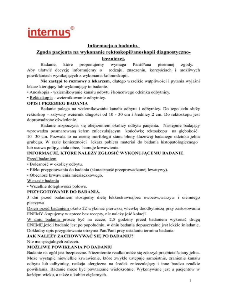 Informacja o badaniu. Zgoda pacjenta na wykonanie rektoskopii/anoskopii diagnostycznoleczniczej. Badanie, które proponujemy wymaga Pani/Pana pisemnej zgody. Aby ułatwić decyzję informujemy o rodzaju, znaczeniu, korzyściach i możliwych powikłaniach wynikających z wykonania kolonoskopii. Nie zastąpi to rozmowy z lekarzem, dlatego wszelkie wątpliwości i pytania wyjaśni lekarz kierujący lub wykonujący to badanie. • Anoskopia - wziernikowanie kanału odbytu i końcowego odcinka odbytnicy. • Rektoskopia - wziernikowanie odbytnicy. OPIS I PRZEBIEG BADANIA Badanie polega na wziernikowaniu kanału odbytu i odbytnicy. Do tego celu służy rektoskop – sztywny wziernik długości od 10 - 30 cm i średnicy 2 cm. Do rektoskopu jest doprowadzone oświetlenie. Badanie rozpoczyna się obejrzeniem okolicy odbytu pacjenta. Następnie badający wprowadza posmarowaną żelem znieczulającym końcówkę rektoskopu na głębokość 10- 30 cm. Pozwala to na ocenę morfologii stanu błony śluzowej badanego odcinka jelita grubego. W razie konieczności lekarz pobiera materiał do badania histopatologicznego lub usuwa polipy, ciała obce, hamuje krwawienie. INFORMACJE, KTÓRE NALEŻY ZGŁOSIĆ WYKONUJĄCEMU BADANIE. Przed badaniem • Bolesność w okolicy odbytu. • Efekt przygotowania do badania (skuteczność przeprowadzonej lewatywy). • Obecność krwawienia miesiączkowego. W czasie badania • Wszelkie dolegliwości bólowe. PRZYGOTOWANIE DO BADANIA. 3 dni przed badaniem stosujemy dietę lekkostrawną,bez owoców,warzyw i ciemnego pieczywa. Dzień przed badaniem około 22 wykonać pierwszą wlewkę doodbytniczą przy zastosowaniu ENEMY /kupujemy w aptece bez recepty, nie należy jeść kolacji. W dniu badania proszę być na czczo, 2,5 godziny przed badaniem wykonać drugą ENEMĘ,jeżeli badanie jest po popołudniu, w dniu badania dopuszczalne jest lekkie śniadanie. Dokładny opis przygotowania otrzyma Pan/Pani przy ustalaniu terminu badania. JAK NALEŻY ZACHOWYWAĆ SIĘ PO BADANIU? Nie ma specjalnych zaleceń. MOŻLIWE POWIKŁANIA PO BADANIU Badanie na ogół jest bezpieczne. Niezmiernie rzadko może się zdarzyć przebicie ściany jelita. Może wystąpić niewielkie krwawienie, które zwykle ustępuje samoistnie, zranienie kanału odbytu lub odbytnicy, reakcja alergiczna na środek znieczulający i inne bardzo rzadkie powikłania. Badanie może być powtarzane wielokrotnie. Wykonywane jest u pacjentów w każdym wieku, a także u kobiet ciężarnych. 1 Aby zmniejszyć ryzyko powikłań, prosimy odpowiedzieć na następujące pytania (zakreślić kółkiem): 1. Czy istnieje u Pani/Pana zwiększona skłonność do krwawień po zranieniach usunięciu zębów? tak nie 2. Czy zaobserwowała/ł Pani/Pan skłonność do łatwego powstawania „siniaków” na skórze? tak nie 3. Czy przyjmuje Pani/Pan leki przeciwkrzepliwe (np. Acenocumarol, Sintrom, Warfin, Xarelto, Syncumar, Clexane, Fraxiparine, Fraxodi)? tak nie 4. Czy przyjmuje Pani/Pan niesterydowe leki przeciwzapalne (np. Majamil, Voltaren, Diclac, Diclo-Duo, Piroxicam, Ibuprofen, Ketonal, Febrofen), aspirynę (np. Aspirin, Acard, Polocard, Bestpirin, Polopiryna, Acesan), leki przeciwpyłowe (np. Aclotin, Ticlo, Apo-clodin, Plavix, Areplex)? tak nie 5. Czy jest Pani/Pan uczulona/y na środki znieczulające, lekarstwa, jodynę? tak nie 6. Czy ma Pani/Pan wszczepiony „rozrusznik” serca lub endoprotezę? 7. Czy jest Pani w ciąży? tak nie tak nie 8. Czy Pani/Pan leczy się z powodu chorób serca lub płuc (np. wada serca, zaburzenia rytmu serca, choroba wieńcowa, nadciśnienie, astma oskrzelowa)? tak nie 9. Czy jest Pani/Pan leczona/y z powodu innych chorób przewlekłych (np. jaskra, cukrzyca, padaczka, choroby psychiczne)? tak nie Jeśli tak to jakich?………………………………..…………………………………... 10. Czy była Pani/Pan dotychczas operowani? tak nie Jeśli tak, to proszę wymienić operacje, szczególnie te wykonane w obrębie brzucha: ………………………………………………………………………………………… W razie jakichkolwiek wątpliwości, prosimy o pytania. Lekarz wyjaśni Pani/Panu wszystkie wątpliwości. ……………….………………………................................................................... /data/ /podpis pacjenta lub/ i opiekuna prawnego/ 2 Świadoma zgoda na wykonanie zabiegu diagnostyczno-leczniczego. Wyrażam świadomą zgodę na wykonanie u mnie rektoskopii/anoskopii diagnostyczno-leczniczej i inne konieczne podczas badania zabiegi (pobranie wycinków, usunięcie polipów, koagulację itp.). Po zapoznaniu się z treścią tego formularza strony od 1 do3 i rozmowie wyjaśniającej z dr ………………………. uzyskałam / uzyskałem wyczerpujące informacje na temat badania i ewentualnych powikłań oraz miałam / miałem możliwość zadawania pytań i uzyskałam/ uzyskałem wyczerpujące wyjaśnienie. Nie mam więcej pytań ani żadnych wątpliwości. Wyrażam również zgodę na zastosowanie ogólnodziałających środków przeciwbólowych, uspokajających oraz rozkurczowych / anestetycznych. ……………….. (data) …………….............................................. (podpis pacjenta lub/i opiekuna prawnego) UWAGA! W przypadku pacjentów małoletnich, którzy ukończyli 16 rok życia do przeprowadzenia badania lub udzielenia innych świadczeń zdrowotnych takiemu pacjentowi wymagana jest jego zgoda oraz zgoda opiekunów prawnych. Podstawa prawna : Ustawa o prawach pacjenta i Rzeczniku Praw Pacjenta z dn. 6.11.2008 r. (Dz. U.2009 Nr 52 poz. 417) z późn. zmianami. wyd.2 3