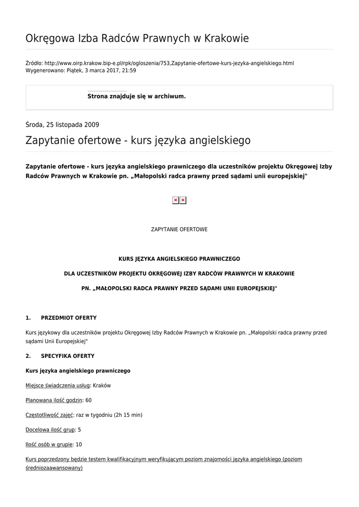 Okręgowa Izba Radców Prawnych w Krakowie Źródło: http://www.oirp.krakow.bip-e.pl/rpk/ogloszenia/753,Zapytanie-ofertowe-kurs-jezyka-angielskiego.html Wygenerowano: Piątek, 3 marca 2017, 21:59 Strona znajduje się w archiwum. Środa, 25 listopada 2009 Zapytanie ofertowe - kurs języka angielskiego Zapytanie ofertowe - kurs języka angielskiego prawniczego dla uczestników projektu Okręgowej Izby Radców Prawnych w Krakowie pn. „Małopolski radca prawny przed sądami unii europejskiej" ZAPYTANIE OFERTOWE KURS JĘZYKA ANGIELSKIEGO PRAWNICZEGO DLA UCZESTNIKÓW PROJEKTU OKRĘGOWEJ IZBY RADCÓW PRAWNYCH W KRAKOWIE PN. „MAŁOPOLSKI RADCA PRAWNY PRZED SĄDAMI UNII EUROPEJSKIEJ" 1. PRZEDMIOT OFERTY Kurs językowy dla uczestników projektu Okręgowej Izby Radców Prawnych w Krakowie pn. „Małopolski radca prawny przed sądami Unii Europejskiej" 2. SPECYFIKA OFERTY Kurs języka angielskiego prawniczego Miejsce świadczenia usług: Kraków Planowana ilość godzin: 60 Częstotliwość zajęć: raz w tygodniu (2h 15 min) Docelowa ilość grup: 5 Ilość osób w grupie: 10 Kurs poprzedzony będzie testem kwalifikacyjnym weryfikującym poziom znajomości języka angielskiego (poziom średniozaawansowany) Wymagania wobec lektora: Lektor prowadzący zajęcia powinien mieć wysokie kwalifikacje z zakresu angielskiego języka prawniczego oraz posiadać potwierdzone doświadczenie w nauczaniu tego rodzaju języka, zwłaszcza jeśli chodzi o przygotowanie uczestników do Certyfikatu TOLES W tym celu CV (w języku polskim lub angielskim) kandydata na lektora powinno być dołączone do oferty. Termin rozpoczęcia kursu: grudzień 2009 Termin zakończenia kursu: maj 2010 Wymagania dotyczące program kursu: Po ukończeniu kursu uczestnicy powinni osiągnąć następujące cele: - przygotowanie do Certyfikatu Angielskiego Języka Prawniczego TOLES - opanowanie specjalistycznego słownictwa z zakresu języka angielskiego prawniczego (formy leksykalne i gramatyczne właściwe dla tego rodzaju języka) - poznanie słownictwa z zakresu procedury postępowania przed sądami Unii Europejskiej w języku angielskim, (wskazówki praktyczne dotyczące redagowania i struktury pism w postępowaniu oraz przygotowania do rozprawy) - poznanie specyfiki angielskich tekstów prawniczych (analiza i porównanie z ich polskimi odpowiednikami) takich jak: orzeczenia sądów Unii Europejskiej, pisma procesowe, pisma wszczynające postępowanie, umowy, pełnomocnictwa, dokumenty spółek i inne. Prowadzący powinien zapewnić wysoką jakość materiałów dydaktycznych ( dotyczy także testu kwalifikacyjnego) oraz różnorodne metody dydaktyczne. Dobrze widziane będą programy autorskie uwzględniające specyfikę niniejszego kursu i jego wymogi. Termin złożenia oferty upływa dnia 25 listopada 2009 roku o godzinie 18 Prosimy o przesyłanie ofert na adres e-mail: [email protected] Dodatkowe informacje udzielane są pod numerem telefonu 505 689 551 Metadane Data publikacji 25.11.2009 Data modyfikacji 25.11.2009 Rejestr zmian Podmiot udostępniający informację: Okręgowa Izba Radców Prawnych w Krakowie Osoba wytwarzająca/odpowiadająca za informację: Paweł Krewniak Osoba udostępniająca informację: Paweł Krewniak Osoba modyfikująca informację: