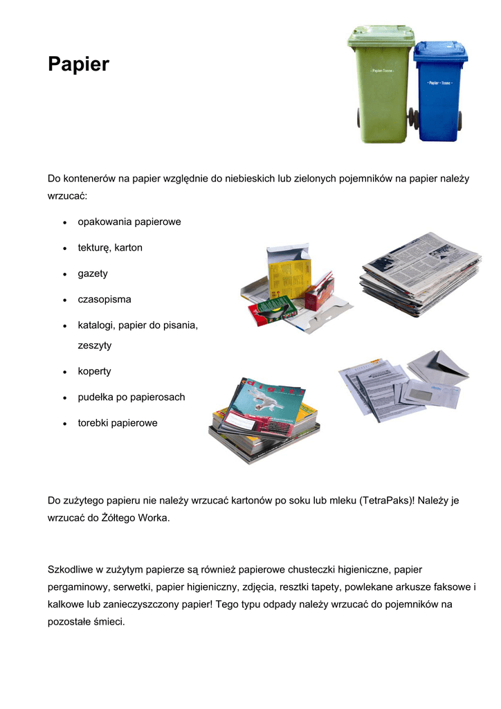 Papier Do kontenerów na papier względnie do niebieskich lub zielonych pojemników na papier należy wrzucać: • opakowania papierowe • tekturę, karton • gazety • czasopisma • katalogi, papier do pisania, zeszyty • koperty • pudełka po papierosach • torebki papierowe Do zużytego papieru nie należy wrzucać kartonów po soku lub mleku (TetraPaks)! Należy je wrzucać do Żółtego Worka. Szkodliwe w zużytym papierze są również papierowe chusteczki higieniczne, papier pergaminowy, serwetki, papier higieniczny, zdjęcia, resztki tapety, powlekane arkusze faksowe i kalkowe lub zanieczyszczony papier! Tego typu odpady należy wrzucać do pojemników na pozostałe śmieci.