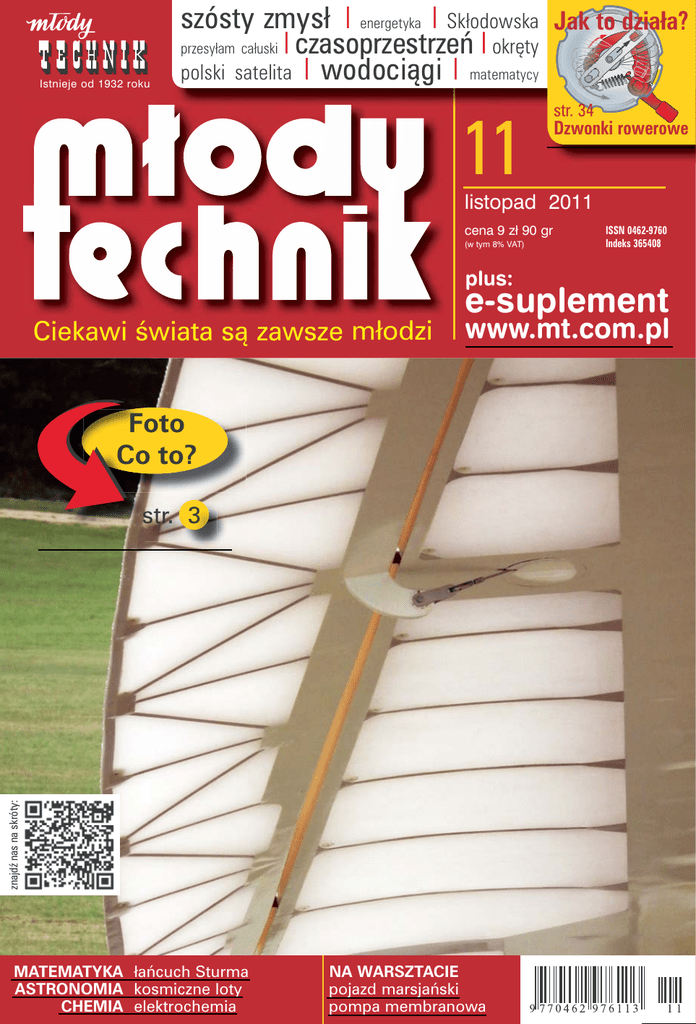 Istnieje od 1932 roku szósty zmys I energetyka I Skodowska Jak to dziaa? przesyam causki I czasoprzestrze I okrty polski satelita I wodocigi I matematycy 11 str. 34 Dzwonki rowerowe listopad 2011 cena 9 z 90 gr (w tym 8% VAT) ISSN 0462-9760 Indeks 365408 plus: Ciekawi wiata s zawsze modzi e-suplement www.mt.com.pl Foto Co to? znajd nas na skróty: str. 3 MATEMATYKA acuch Sturma ASTRONOMIA kosmiczne loty CHEMIA elektrochemia NA WARSZTACIE pojazd marsjaski pompa membranowa z Miesięcznik „Młody Technik” (12 numerów w roku) wydawany przez Wydawnictwo AVT z Adres wydawnictwa: 03-197 Warszawa, ul. Leszczynowa 11, tel.: 022 257 84 99, faks: 022 257 84 00, e-mail: [email protected] http://www.avt.pl z Dyrektor wydawnictwa AVT: Wiesław Marciniak z Kontakt do Redakcji: tel.: 022 257 84 10, e-mail: [email protected] http://www.mt.com.pl z Redaktor Naczelny: Adam Dębowski e-mail: [email protected] z Sekretarz Redakcji: Wisława Karolewska e-mail: [email protected] z Redaktor: Monika Witan e-mail: [email protected] z Dział Reklamy: Ewa Owczarek tel.: 022 257 84 87 faks: 022 257 84 32 e-mail: [email protected] z Dział Prenumeraty: tel.: 022 257 84 22 faks: 022 257 84 00 e-mail: [email protected] z Stale współpracują: Stanisław Bajtlik, Jan Boratyński, Jerzy I. Chmielewski, Paweł Dejnak, Alvar Hansen, Piotr Kawalerowicz, Juliusz Konczalski, Adam Łowicki, Magdalena Michalska, W listopadowym numerze Młodego Technika nie brakuje tematyki astronautycznej. Polecam artykuł „Lem w Kosmosie” o pierwszym polskim mikrosatelicie. Jest on elementem pierwszego polskiego programu satelitarnego noszącego nazwę BRITE-PL. Polska część programu obejmuje budowę dwóch bliźniaczych satelitów, których nazwy zostały wybrane w drodze konkursu internetowego. Wybrano nazwy Lem i Heweliusz, na cześć pisarza Stanisława Lema i gdańskiego astronoma Jana Heweliusza. Tematyka astronautyczna powraca jeszcze w jednym z artykułów działu „Na Warsztacie” poświęconemu projektowi pojazdu marsjańskiego, który powstał we Wrocławiu. W chwili obecnej większość projektów „marsjańskich” trwa w zwieszeniu i nieznane są ich przyszłe losy, ale i tak cieszymy się z sukcesów zespołu Politechniki Wrocławskiej, traktując projekt jako temat do budowy modelu kartonowego. JEDNĄ NOGĄ W KOSMOSIE Mimo obfitości tematyki kosmicznej w tym numerze, a może właśnie dla jej podkreślenia, chciałbym w tym miejscu zwrócić uwagę na inny ciekawy eksperyment odbywający się obecnie na Międzynarodowej Stacji Kosmicznej. Eksperyment, który umknął uwadze mediów. Mianowicie, po dziesięciu latach pracy nad prototypami na Ziemi wysłano na orbitę humanoidalnego robota. Po półrocznym oczekiwaniu (dostarczono go na stację na początku tego roku) przyszedł czas na jego uruchomienie. Robot R2 ma tors, dwie ręce z dłońmi o pięciu palcach i głowę. Nie zabrano na orbitę nóg, robot jest zamocowany do nieruchomej podstawy. NASA pokłada duże nadzieje w projektach robotów humanoidalnych. Naukowcy i inżynierowie twierdzą, że robot dzięki dłoni przypominającej ludzką będzie mógł korzystać z dokładnie tych samych narzędzi co astronauci, a to ułatwi planowanie zadań dla niego. Będzie też mógł wykonywać prace konserwacyjne urządzeń, których ergonomia jest dostosowana do ludzkiej budowy. Po prostu dostosuje się do otoczenia. W chwili obecnej trwa wstępny rozruch, robot próbuje właśnie rozruszać po długiej podróży i leżakowaniu swoje ramiona, o czym donosi... na swoim profilu na Facebooku. Profil społecznościowy robota jest w tej chwili najaktualniejszym źródłem informacji i zdjęć ze stacji kosmicznej. A co dalej? Biorąc pod uwagę ludzkie kształty robota, jeden z projektów na przyszłość wydaje się odrobinę makabryczny. Przewiduje dostarczenie na orbitę… jednej nogi. Ma to tymczasowo wystarczyć do pierwszych prób poruszania się robota w nieważkości. Sergiusz Mitin, Krzysztof Orliński, Zdzisław Podbielski, Stefan Sękowski, Tomasz Sowiński, Adam Dębowski Redaktor Naczelny Michał Stępień, Michał Szurek, Bronisława Średniawa, Kazimierz Topór, Marek Utkin. z Rysunki: Piotr Kanarek, Adam Łowicki, Tomasz Paleczny, Jacek Wardęcki. z Skład: Jacek Wardęcki e-mail: [email protected] z Konsultacja graficzna: Małgorzata Jabłońska Redakcja nie ponosi odpowiedzialności za treści reklam i ogłoszeń zamieszczonych w numerze z Druk: gallery one 70g UWAGA SZKOŁY, NAUCZYCIELE I UCZNIOWIE! Miesięcznik Młody Technik jest dostępny dla szkół podstawowych, gimnazjalnych i średnich w prenumeracie sponsorowanej przez Ministerstwo Nauki i Szkolnictwa Wyższego. W roku 2011 szkoły opłacają 40% kosztów prenumeraty Młodego Technika. Dzięki tej prenumeracie Młody Technik trafia prawie do każdej biblioteki szkolnej, co oznacza, że jest czytany przez kilkaset tysięcy uczniów szkół ponadpodstawowych i podstawowych. Specjalnie dla naszych młodych Czytelników – uczniów tych szkół – stosujemy dwa ułatwienia: – w poszczególnych artykułach zamieszczamy leksykon trudniejszych pojęć – oznaczamy stopień trudności artykułu, przy czym jeden punkt oznacza, że artykuł powinni zrozumieć uczniowie szkół podstawowych, dwa punkty odpowiadają poziomowi uczniów gimnazjum, trzy punkty – poziom szkoły średniej. spis treci 16 11/2011 Dzieje krakowskich wodocigów W Krakowie od zawsze wod pitn czerpano z rzek i ze studni. Pierwsz znan inwestycj wodocigow, jeszcze pod koniec rozbicia dzielnicowego (prawdopodobnie okoo 1286 roku), byy akwedukty, czyli otwarte sztuczne kanay zbudowane przez klasztor Dominikanów, doprowadzajce wod z Rudawy, z Mydlnik do miasta. Z latami system rozbudowywano. E C H N I K 24 „Urodziam si w Warszawie…” Maria Salomea Skodowska urodzia si 7 listopada 1867 roku w Warszawie jako ostatnie, pite dziecko Wadysawa i Bronisawy. Rodzice przyszej noblistki byli znanymi warszawskimi nauczycielami. Gd