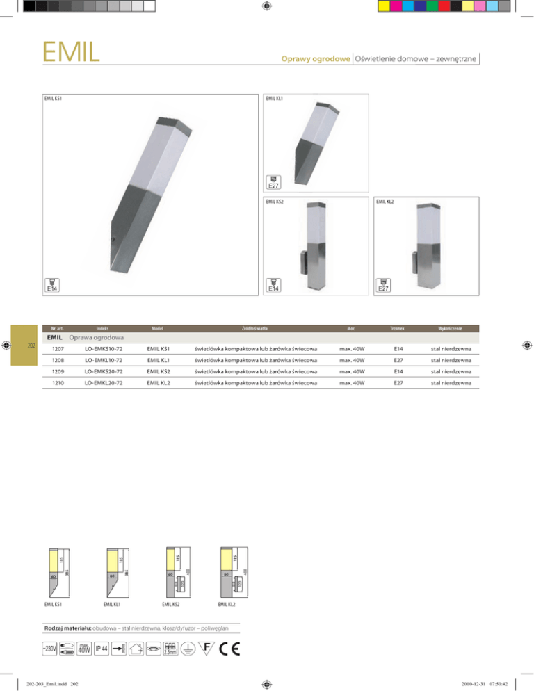 EMIL Oprawy ogrodowe Oświetlenie domowe – zewnętrzne EMIL KS1 EMIL KL1 E27 EMIL KS2 EMIL KL2 E14 E27 E14 Nr. art. 202 Indeks EMIL Oprawa ogrodowa 1207 LO-EMKS10-72 Model Źródło światła Moc Trzonek Wykończenie EMIL KS1 świetlówka kompaktowa lub żarówka świecowa max. 40W E14 stal nierdzewna 1208 LO-EMKL10-72 EMIL KL1 świetlówka kompaktowa lub żarówka świecowa max. 40W E27 stal nierdzewna 1209 LO-EMKS20-72 EMIL KS2 świetlówka kompaktowa lub żarówka świecowa max. 40W E14 stal nierdzewna 1210 LO-EMKL20-72 EMIL KL2 świetlówka kompaktowa lub żarówka świecowa max. 40W E27 stal nierdzewna EMIL KS1 EMIL KL1 EMIL KS2 EMIL KL2 Rodzaj materiału: obudowa – stal nierdzewna, klosz/dyfuzor – poliwęglan ~230V 202-203_Emil.indd 202 max. 40W IP 44 2.5mm2 2010-12-31 07:50:42 Oprawy ogrodowe Oświetlenie domowe – zewnętrzne EMIL 50S EMIL 50L E14 E27 Nr. art. Indeks EMIL 105S EMIL 105L E27 E14 Model Źródło światła Moc Trzonek Wykończenie LO-EM050S-72 EMIL 50S świetlówka kompaktowa lub żarówka świecowa max. 40W E14 stal nierdzewna EMIL Oprawa ogrodowa 1211 1212 LO-EM050L-72 EMIL 50L świetlówka kompaktowa lub żarówka świecowa max. 40W E27 stal nierdzewna 1213 LO-EM105S-72 EMIL 105S świetlówka kompaktowa lub żarówka świecowa max. 40W E14 stal nierdzewna 1214 LO-EM105L-72 EMIL 105L świetlówka kompaktowa lub żarówka świecowa max. 40W E27 stal nierdzewna EMIL 50S EMIL 50L EMIL 105S 203 EMIL 105L Rodzaj materiału: obudowa – stal nierdzewna, klosz/dyfuzor – poliwęglan ~230V 202-203_Emil.indd 203 max. 40W IP 44 2.5mm2 2010-12-31 07:50:47