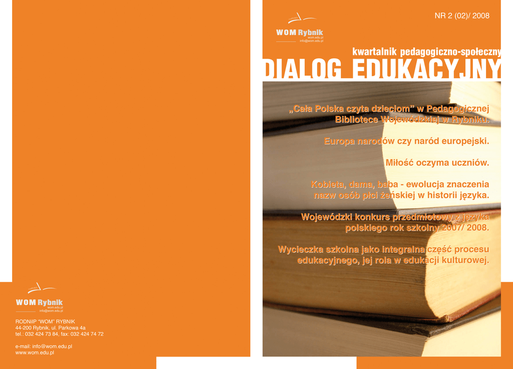 DIALOG EDUKACYJNY RODNiIP “WOM” RYBNIK Nr 2 (02)/ 2008 DIALOG EDUKACYJNY RODNiIP “WOM” RYBNIK DIALOG EDUKACYJNY RODNiIP “WOM” RYBNIK Kwartalnik pedagogiczno-spo eczny RODNiIP “WOM” RYBNIK RODNiIP “WOM” RYBNIK Dyrektor dr Roman Miruk-Mirski [email protected] Regionalny O rodek Doskonalenia Nauczycieli i Informacji Pedagogicznej "WOM" w Rybniku jest jedn z pi ciu w Województwie, publicznych placówek doskonalenia nauczycieli. Wicedyrektor d/s bibliotek mgr Adam Kapias [email protected] ... PROMUJEMY INNOWACYJNO Pracownia doskonalenia i dydaktyki: mgr Alicja Krawczyk [email protected] mgr Anna Ogrodnik [email protected] mgr Maria Stachowicz-Polak [email protected] mgr Alojzy Zimo czyk [email protected] Pracownia wspierania kadry kierowniczej i doradztwa metodycznego: mgr Mariola Gajek-Czapla [email protected] mgr in . Jadwiga Garcorz [email protected] Pracownia edukacji informatycznej i nauczania na odleg o : mgr Gra yna Studzi ska-Cavour [email protected] mgr Tomasz Stadnicki [email protected] mgr in . Piotr Tokarz [email protected] Promujemy innowacyjno , nowoczesne metody nauczania, techniki i technologie, nowinki edukacyjne i autonomi pracy nauczyciela, pozostaj c w zgodzie z priorytetami Ministra Edukacji, l skiego Kuratora O wiaty, standardami Rady Europy, pog biaj c nasze pasje i wytyczaj c nowe cie ki. POMAGAMY NAUCZYCIELOM ... Pomagamy nauczycielom, dyrektorom szkó , radom pedagogicznym i doradcom metodycznym we wprowadzaniu nowego wymiaru do polskiej edukacji oraz podniesieniu jako ci i efektywno ci nauczania, oferuj c szkolenia na najwy szym poziomie merytorycznym, dydaktycznym i technicznym. ZAPEWNIAMY ORGANIZACJ ... Zapewniamy organizacj ró norodnych form wspó pracy oraz wymiany do wiadcze , w tym konferencji i seminariów. ZASPAKAJAMY I ROZWIJAMY ... Zaspakajamy i rozwijamy potrzeby czytelnicze nauczycieli i innych pracowników pedagogicznych oraz o wiatowych. DIALOG EDUKACYJNY Wydawca: Regionalny O rodek Doskonalenia Nauczycieli i Informacji Pedagogicznej „WOM” w Rybniku tel./fax: 032 424 74 72 Redaguje zespó konsultantów RODNiIP “WOM” redaktor: Adam Kapias, korekta: Jolanta Malczewska PEDAGOGICZNA BIBLIOTEKA WOJEWÓDZKA W RYBNIKU Biblioteka posiada bogaty ksi gozbiór naukowy i popularnonaukowy, ze szczególnym uwzgl dnieniem nauk pedagogicznych, psychologicznych i socjologicznych. GROMADZIMY LITERATUR Z ZAKRESU: • pedagogiki, psychologii i nauk pokrewnych, materia y dotycz ce problematyki o wiatowej regionu, • metodyki nauczania, podr czniki do nauki j zyków obcych, lektury szkolne oraz programy nauczania, • nauk spo ecznych, • literatur pi kn polsk i dzie a klasyki wiatowej, • materia y dotycz ce edukacji regionalnej, edukacji europejskiej, edukacji ekologicznej. CZYTELNIA Warsztat informacyjny czytelni tworz katalogi: alfabetyczny i rzeczowy oraz kartoteka zagadnieniowa tworzona z autopsji na bazie prenumerowanych czasopism m. in.: regionalna, dydaktyczna, wychowawcza, ekologiczna, literacka. Posiadamy zbiór programów edukacyjnych zarejestrowanych na kasetach wideo z ró nych dziedzin wiedzy. Materia y te s u nauczycielom i studentom w realizacji procesu dydaktycznego i wychowawczego. INTERNETOWE CENTRUM INFORMACJI W RYBNIKU Pracownia informacji pedagogicznej i wydawnictw: mgr Sylwia Bloch [email protected] mgr Romana Piecha [email protected] mgr Jolanta Spyrczak [email protected] W Internetowym Centrum Informacji Multimedialnej znajduj si 4 komputery i urz dzenie wielofunkcyjne (drukarka i skaner). Korzystanie z Internetu i pakietu Microsoft Office jest bezp atne. CZYTELNICY Z zasobów biblioteki korzystaj nauczyciele, studenci oraz wszyscy zainteresowani problemami o wiaty i kszta cenia. Adres redakcji: RODNiIP “WOM” RYBNIK 44-200 Rybnik, ul. Parkowa 4a, tel.: 032 424 73 84, fax: 032 424 74 72, e-mail: [email protected] Redakcja nie zwraca materiaów niezamówionych i zastrzega sobie prawo dokonywania skrótów w nades anych tekstach. Za tre og osze redakcja nie odpowiada. Sk ad: Rh+studio, ul. Piastów 26/ 201, 40-868 Katowice, Druk: D&D Sp. z o.o., ul. Moniuszki 6, 44-100 Gliwice Nr 2 (02)/ 2008 DZIA ALNO DYCZNA: EDUKACYJNO-METO- • promowanie edukacji czytelniczej, medialnej, • wspieranie nauczycieli w realizacji cie ek edukacyjnych; edukacja regionalna, europejska, ekologiczna. DZIA ALNO GRAFICZNA: INFORMACYJNO-BIBLIO- • opracowanie wykazów nowo ci, opracowanie zestawie bibliograficznych, przygotowanie wystaw tematycznych i okoli• czno ciowych. ADRESY BIBLIOTEK Pedagogiczna Biblioteka Wojewódzka w Rybniku 44-200 Rybnik, ul. Chrobrego 27 tel./ fax: 032 422 20 59 e-mail: [email protected] www.wom.edu.pl/biblioteka/rybnik godziny otwarcia: pn - cz od 08:00 do 18:00 pt od 08:00 do 15:00 s od 08:00 do 13:00 Filia w Raciborzu 47-400 Racibórz, il. S owackiego 55 tel./ fax: 032 419 00 02 e-mail: [email protected] www.wom.edu.pl/biblioteka/raciborz godziny otwarcia: pn - cz od 08:00 do 18:00 pt od 08:00 do 15:00 s od 08:00 do 13:00 Filia w Wodzis awiu l skim 44-300 Wodzis aw l ski, O . 1 Maja 16a tel./ fax: 032 729 32 10 e-mail: [email protected] www.wom.edu.pl/biblioteka/wodzislaw godziny otwarcia: pn od 08:00 do 15:00 wt - pt od 08:00 do 17:00 s od 08:00 do 13:00 DIALOG EDUKACYJNY RODNiIP “WOM” RYBNIK Drodzy Czytelnicy! Przedstawiamy Państwu drugi numer naszego kwartalnika „Dialog Edukacyjny”. Dziękujemy wszystkim czytelnikom za rady i uwagi, ponieważ ciągle jesteśmy na etapie kształtowania profilu naszego czasopisma. Mamy nadzieję, że również w przyszłości będziemy mogli liczyć na wymianę poglądów, dyskusji. W tym numerze tematyka zamieszczonych artykułów jest różnorodna, począwszy od odpowiedzi na pytania: Czym jest miłość w oczach młodych Polaków, poprzez zagadnienie ewolucji znaczenia słów: kobieta, dama, baba, po tematy metodyczne nauczania języka angielskiego i matematyki. Uwadze naszych czytelników polecamy artykuł „Europa narodów czy naród europejski” starają
