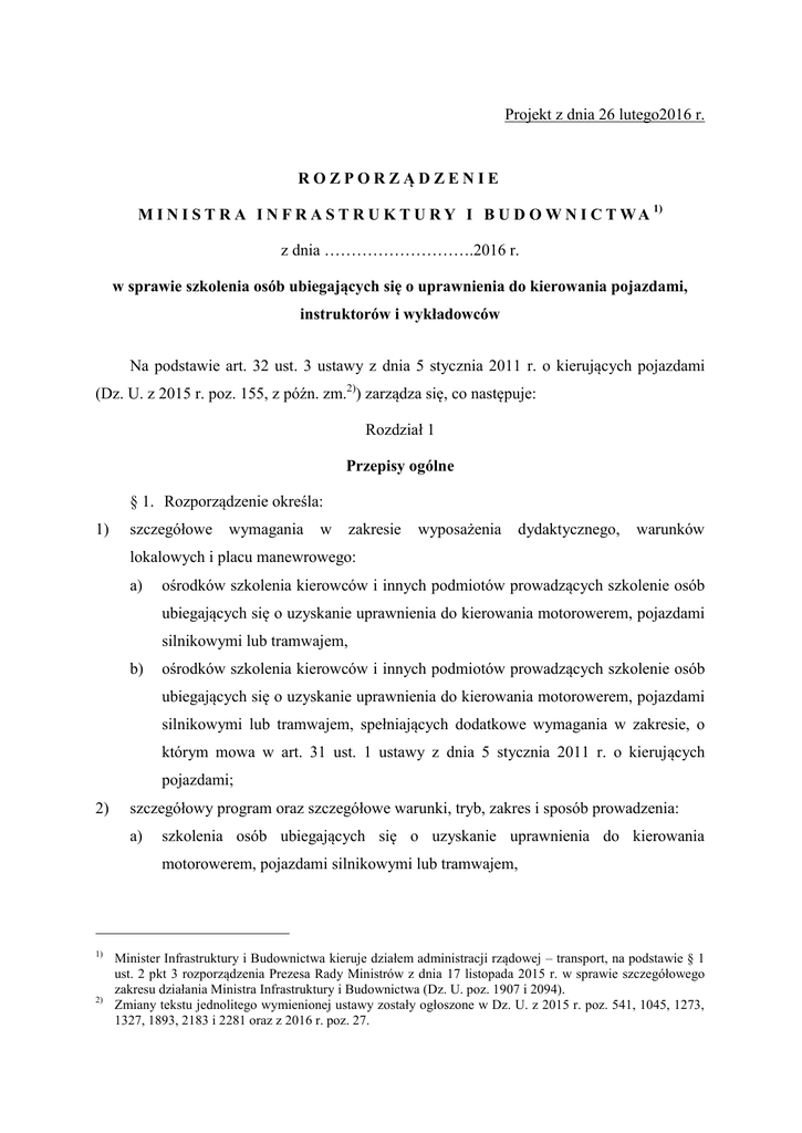 Projekt z dnia 26 lutego2016 r. ROZPORZĄDZENIE M I N I S T R A I N F R A S T R U K T U R Y I B U D O W N I C T W A 1) z dnia ……………………….2016 r. w sprawie szkolenia osób ubiegających się o uprawnienia do kierowania pojazdami, instruktorów i wykładowców Na podstawie art. 32 ust. 3 ustawy z dnia 5 stycznia 2011 r. o kierujących pojazdami (Dz. U. z 2015 r. poz. 155, z późn. zm.2)) zarządza się, co następuje: Rozdział 1 Przepisy ogólne § 1. Rozporządzenie określa: 1) szczegółowe wymagania w zakresie wyposażenia dydaktycznego, warunków lokalowych i placu manewrowego: a) ośrodków szkolenia kierowców i innych podmiotów prowadzących szkolenie osób ubiegających się o uzyskanie uprawnienia do kierowania motorowerem, pojazdami silnikowymi lub tramwajem, b) ośrodków szkolenia kierowców i innych podmiotów prowadzących szkolenie osób ubiegających się o uzyskanie uprawnienia do kierowania motorowerem, pojazdami silnikowymi lub tramwajem, spełniających dodatkowe wymagania w zakresie, o którym mowa w art. 31 ust. 1 ustawy z dnia 5 stycznia 2011 r. o kierujących pojazdami; 2) szczegółowy program oraz szczegółowe warunki, tryb, zakres i sposób prowadzenia: a) szkolenia osób ubiegających się o uzyskanie uprawnienia do kierowania motorowerem, pojazdami silnikowymi lub tramwajem, 1) 2) Minister Infrastruktury i Budownictwa kieruje działem administracji rządowej – transport, na podstawie § 1 ust. 2 pkt 3 rozporządzenia Prezesa Rady Ministrów z dnia 17 listopada 2015 r. w sprawie szczegółowego zakresu działania Ministra Infrastruktury i Budownictwa (Dz. U. poz. 1907 i 2094). Zmiany tekstu jednolitego wymienionej ustawy zostały ogłoszone w Dz. U. z 2015 r. poz. 541, 1045, 1273, 1327, 1893, 2183 i 2281 oraz z 2016 r. poz. 27. –2– b) szkolenia kandydatów na instruktorów i instruktorów oraz kandydatów na wykładowców i wykładowców, c) 3) warsztatów doskonalenia zawodowego dla instruktorów i wykładowców; szczegółowe warunki i tryb: a) postępowania z dokumentami dotyczącymi osób ubiegających się o uzyskanie uprawnienia do kierowania motorowerem, pojazdami silnikowymi lub tramwajem i kandydatów na instruktorów oraz wzory stosowanych dokumentów, b) 4) prowadzenia dokumentacji przez ośrodki szkolenia kierowców; wzory dokumentów związanych z prowadzeniem szkolenia. § 2. Ilekroć w rozporządzeniu jest mowa o: 1) ustawie – rozumie się przez to ustawę z dnia 5 stycznia 2011 r. o kierujących pojazdami; 2) pozwoleniu – rozumie się przez to pozwolenie na kierowanie tramwajem, o którym mowa w art. 7 ust. 1 pkt 1 ustawy; 3) osobie szkolonej – rozumie się przez to osobę, o której mowa w art. 21 ust. 1 ustawy; 4) egzaminie państwowym – rozumie się przez to egzamin, o którym mowa w art. 51 ustawy; 5) ośrodku egzaminowania – rozumie się przez to wojewódzki ośrodek ruchu drogowego, o którym mowa w art. 56 ust. 1 ustawy; 6) osobie egzaminowanej – rozumie się przez to osoby, o których mowa w art. 49 ust. 1 ustawy; 7) pojeździe szkoleniowym – rozumie się przez to pojazdy, o których mowa w art. 24 ustawy; 8) pojeździe z automatyczną skrzynią biegów – rozumie się przez to pojazd, w którym nie ma pedału sprzęgła, a w przypadku motorowerów i motocykli ręcznej dźwigni sprzęgła; 9) profilu kandydata na kierowcę – rozumie się przez to profil, o którym mowa w przepisach wydanych na podstawie art. 20 ust. 1 pkt 2 ustawy; Rozdział 2 Ośrodek szkolenia kierowców § 3.1. Ośrodek szkolenia kierowców i inne podmioty prowadzące szkolenie osób ubiegających się o uzyskanie uprawnienia do kierowania motorowerem, pojazdami silnikowymi lub tramwajem powinny spełniać następujące wymagania: 1) sala wykładowa powinna: –3– a) mieć powierzchnię nie mniejszą niż 25 m2, b) być wyposażona w stoliki i miejsca siedzące dla każdej osoby biorącej udział w szkoleniu, c) być przystosowana do szkolenia minimum 10 osób, d) być oświetlona, ogrzewana i przewietrzana, e) być odizolowana od innych pomieszczeń, f) być oznaczona nazwą ośrodka szkolenia kierowców oraz informacją „Sala wykładowa”, g) być wyposażona w pomoce dydaktyczne odpowiadające obowiązującemu stanowi prawnemu, obejmujące co najmniej: – tablicę do pisania, – makietę lub programy komputerowe umożliwiające symulowanie sytuacji na drodze, – tablice poglądowe z zakresu szkolenia, programy komputerowe lub filmy wideo prezentujące: zasady bezpiecznego poruszania się w ruchu drogowym, zasady kierowania pojazdem, podstawowe czynności kontrolno-obsługowe i zasady udzielania pierwszej pomocy ofiarom wypadku, – przedmioty i urządzenia umożliwiające korzystanie z tych pomocy dydaktycznych; 2) pomieszczenie biurowe powinno: a) być oznaczone przez wskazanie nazwy, adresu oraz godzin pracy ośrodka szkolenia kierowców, b) umożliwiać obsługę osób i przechowywanie dokumentacji związanej z prowadzonymi szkoleniami w sposób uniemożliwiający dostęp osób postronnych; 3) plac manewrowy powinien: a) mieć nawierzchnię asfaltową, betonową lub kostkową, b) być wyłączony z ruchu pojazdów innych niż pojazdy szkoleniowe, c) umożliwiać, przez trwałe wyznaczenie odpowiednich stanowisk, wykonanie każdego z zadań egzaminacyjnych przewidzianych do wykonania na placu manewrowym na egzaminie państwowym (z wyjątkiem ruszania na wzniesieniu), odpowiednio do zakresu prowadzonego szkolenia, d) umożliwiać jazdę tramwajem na odcinku o długości co najmniej 100 m oraz powinien być wyposażony w sieć trakcyjną i torowisko umożliwiające realizację –4– zadań wchodzących w skład części praktycznej egzaminu w zakresie pozwolenia realizowanej na placu manewrowym – dotyczy podmiotu prowadzącego szkolenie w zakresie pozwolenia. 2. Jeżeli w sali wykładowej jest prowadzone jednocześnie szkolenie dla więcej niż 20 osób, to minimalna wymagana powierzchnia sali zostaje zwiększ