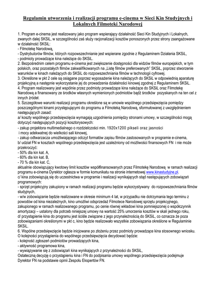 Regulamin utworzenia i realizacji programu e-cinema w Sieci Kin Studyjnych i Lokalnych Filmoteki Narodowej 1. Program e-cinema jest realizowany jako program wspierający działalność Sieci Kin Studyjnych i Lokalnych, zwanych dalej SKSiL, w szczególności zaś służy racjonalizacji kosztów ponoszonych przez strony zaangażowane w działalność SKSiL: - Filmotekę Narodową, - Dystrybutorów filmów, których rozpowszechnianie jest wspierane zgodnie z Regulaminem Działania SKSiL, - podmioty prowadzące kina należące do SKSiL. 2. Bezpośrednim celem programu e-cinema jest zwiększenie dostępności dla widzów filmów europejskich, w tym polskich, oraz pozostałych filmów zakwalifikowanych na „Listę filmów preferowanych” SKSiL, poprzez stworzenie warunków w kinach należących do SKSiL do rozpowszechniania filmów w technologii cyfrowej. 3. Określone w pkt 2 cele są osiągane poprzez wyposażenie kina należących do SKSiL w odpowiednią aparaturę projekcyjną a następnie wykorzystanie jej do prowadzenia działalności kinowej zgodnej z Regulaminem SKSiL. 4. Program realizowany jest wspólnie przez podmioty prowadzące kina należące do SKSiL oraz Filmotekę Narodową a finansowany ze środków własnych wymienionych podmiotów bądź środków pozyskanych na ten cel z innych źródeł. 5. Szczegółowe warunki realizacji programu określone są w umowie wspólnego przedsięwzięcia pomiędzy poszczególnymi kinami przystępującymi do programu a Filmoteką Narodową, sformułowanej z uwzględnieniem następujących zasad: a/ koszty wspólnego przedsięwzięcia wymagają uzgodnienia pomiędzy stronami umowy, w szczególności mogą dotyczyć następujących pozycji kosztorysowych: - zakup projektora multimedialnego o rozdzielczości min. 1920x1200 pikseli oraz jasności i mocy adekwatnej do wielkości sali kinowej, - zakup odtwarzacza umożliwiającego odczyt formatów zapisu filmów zastosowanych w programie e-cinema, b/ udział FN w kosztach wspólnego przedsięwzięcia jest uzależniony od możliwości finansowych FN i nie może przekroczyć: - 50% dla kin kat. A, - 60% dla kin kat. B, - 70 % dla kin kat. C, aktualnie obowiązujący kwotowy limit kosztów współfinansowanych przez Filmotekę Narodową w ramach realizacji programu e-cinema Dyrektor ogłasza w formie komunikatu na stronie internetowej www.kinastudyjne.pl. c/ kina zobowiązują się do uczestnictwa w programie i realizacji wynikających stąd następujących zobowiązań programowych: - sprzęt projekcyjny zakupiony w ramach realizacji programu będzie wykorzystywany do rozpowszechniania filmów studyjnych, - w/w zobowiązanie będzie realizowane w okresie minimum 4 lat, w przypadku nie dotrzymania tego terminu z powodów od kina niezależnych, kino umożliwi odsprzedaż Filmotece Narodowej sprzętu projekcyjnego, zakupionego w ramach realizowanego programu, po cenie równej wkładowi kina pomniejszonej o współczynnik amortyzacji – ustalony dla potrzeb niniejszej umowy na wartość 25% umorzenia kosztów w skali jednego roku, d/ przystąpienie kina do programu jest ściśle związane z jego przynależnością do SKSiL, co oznacza że poza zobowiązaniami określonymi w pkt c, kino będzie realizowało wszystkie zobowiązania określone w Regulaminie SKSiL. 6. Wspólne przedsięwzięcie będzie inicjowane po złożeniu przez podmioty prowadzące kina stosownego wniosku. O kolejności przystąpienia do wspólnego przedsięwzięcia decydować będzie: - kolejność zgłoszeń podmiotów prowadzących kina, - aktywność programowa kina, - wywiązywanie się z zobowiązań kina wynikających z przynależności do SKSiL, Ostateczną decyzję o przystąpieniu kina i FN do podpisania umowy wspólnego przedsięwzięcia podejmuje Dyrektor FN na podstawie opinii Zespołu Ekspertów FN.