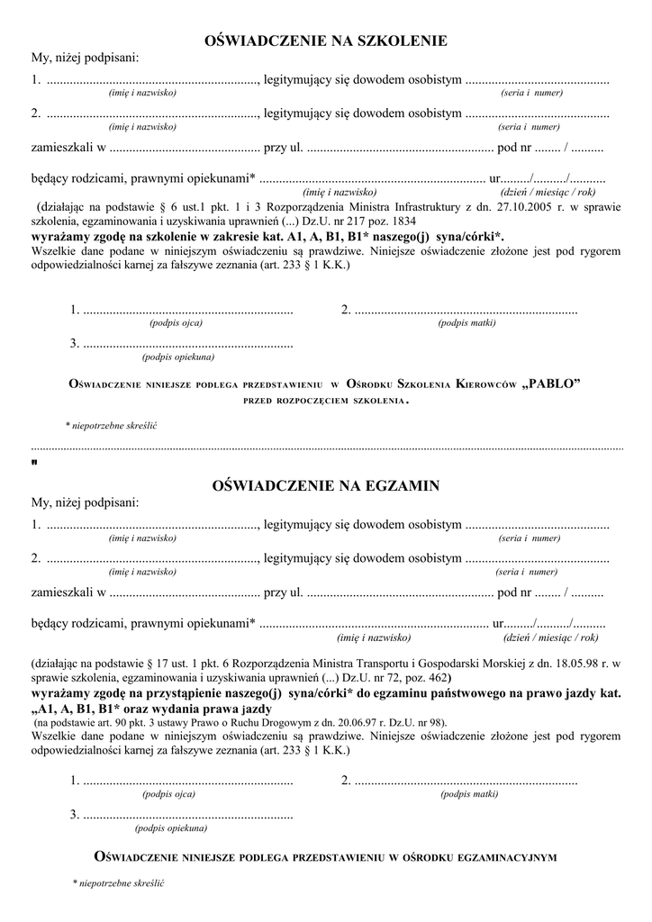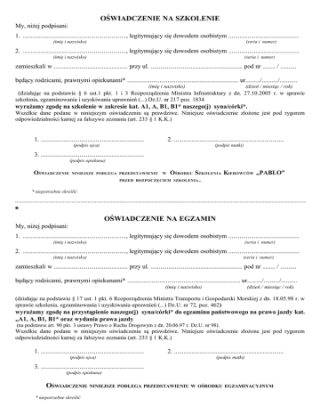 OŚWIADCZENIE NA SZKOLENIE My, niżej podpisani: 1. ................................................................, legitymujący się dowodem osobistym ............................................ (imię i nazwisko) (seria i numer) 2. ................................................................, legitymujący się dowodem osobistym ............................................ (imię i nazwisko) (seria i numer) zamieszkali w .............................................. przy ul. ......................................................... pod nr ........ / .......... będący rodzicami, prawnymi opiekunami* ..................................................................... ur........./........../........... (imię i nazwisko) (dzień / miesiąc / rok) (działając na podstawie § 6 ust.1 pkt. 1 i 3 Rozporządzenia Ministra Infrastruktury z dn. 27.10.2005 r. w sprawie szkolenia, egzaminowania i uzyskiwania uprawnień (...) Dz.U. nr 217 poz. 1834 wyrażamy zgodę na szkolenie w zakresie kat. A1, A, B1, B1* naszego(j) syna/córki*. Wszelkie dane podane w niniejszym oświadczeniu są prawdziwe. Niniejsze oświadczenie złożone jest pod rygorem odpowiedzialności karnej za fałszywe zeznania (art. 233 § 1 K.K.) 1. ................................................................ 2. .................................................................... (podpis ojca) (podpis matki) 3. ................................................................ (podpis opiekuna) OŚWIADCZENIE OŚRODKU SZKOLENIA KIEROWCÓW „PABLO” ROZPOCZĘCIEM SZKOLENIA . NINIEJSZE PODLEGA PRZEDSTAWIENIU PRZED W * niepotrzebne skreślić OŚWIADCZENIE NA EGZAMIN My, niżej podpisani: 1. ................................................................, legitymujący się dowodem osobistym ............................................ (imię i nazwisko) (seria i numer) 2. ................................................................, legitymujący się dowodem osobistym ............................................ (imię i nazwisko) (seria i numer) zamieszkali w .............................................. przy ul. ......................................................... pod nr ........ / .......... będący rodzicami, prawnymi opiekunami* ...................................................................... ur........./........../.......... (imię i nazwisko) (dzień / miesiąc / rok) (działając na podstawie § 17 ust. 1 pkt. 6 Rozporządzenia Ministra Transportu i Gospodarski Morskiej z dn. 18.05.98 r. w sprawie szkolenia, egzaminowania i uzyskiwania uprawnień (...) Dz.U. nr 72, poz. 462) wyrażamy zgodę na przystąpienie naszego(j) syna/córki* do egzaminu państwowego na prawo jazdy kat. „A1, A, B1, B1* oraz wydania prawa jazdy (na podstawie art. 90 pkt. 3 ustawy Prawo o Ruchu Drogowym z dn. 20.06.97 r. Dz.U. nr 98). Wszelkie dane podane w niniejszym oświadczeniu są prawdziwe. Niniejsze oświadczenie złożone jest pod rygorem odpowiedzialności karnej za fałszywe zeznania (art. 233 § 1 K.K.) 1. ................................................................ (podpis ojca) 2. .................................................................... (podpis matki) 3. ................................................................ (podpis opiekuna) OŚWIADCZENIE NINIEJSZE PODLEGA PRZEDSTAWIENIU W OŚRODKU EGZAMINACYJNYM * niepotrzebne skreślić