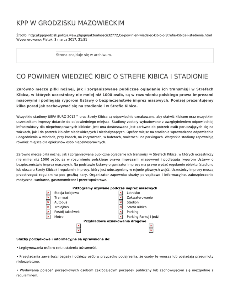 KPP W GRODZISKU MAZOWIECKIM Źródło: http://kppgrodzisk.policja.waw.pl/pgm/aktualnosci/32772,Co-powinien-wiedziec-kibic-o-Strefie-Kibica-i-stadionie.html Wygenerowano: Piątek, 3 marca 2017, 21:51 Strona znajduje się w archiwum. CO POWINIEN WIEDZIEĆ KIBIC O STREFIE KIBICA I STADIONIE Zarówno mecze piłki nożnej, jak i zorganizowane publiczne oglądanie ich transmisji w Strefach Kibica, w których uczestniczy nie mniej niż 1000 osób, są w rozumieniu polskiego prawa imprezami masowymi i podlegają rygorom Ustawy o bezpieczeństwie imprez masowych. Poniżej prezentujemy kilka porad jak zachowywać się na stadionie i w Strefie Kibica. Wszystkie stadiony UEFA EURO 2012™ oraz Strefy Kibica są odpowiednio oznakowane, aby ułatwić kibicom oraz wszystkim uczestnikom imprezy dotarcie do odpowiedniego miejsca. Stadiony zostały wybudowane z uwzględnieniem odpowiedniej infrastruktury dla niepełnosprawnych kibiców. Jest ona dostosowana jest zarówno do potrzeb osób poruszających się na wózkach, jak i do potrzeb kibiców niedowidzących i niedosłyszących. Oprócz miejsc na stadionie wprowadzono odpowiednie udogodnienia w windach, przy kasach, na korytarzach, w bufetach, toaletach i na parkingach. Wszystkie stadiony zapewniają również miejsca dla opiekunów osób niepełnosprawnych. Zarówno mecze piłki nożnej, jak i zorganizowane publiczne oglądanie ich transmisji w Strefach Kibica, w których uczestniczy nie mniej niż 1000 osób, są w rozumieniu polskiego prawa imprezami masowymi i podlegają rygorom Ustawy o bezpieczeństwie imprez masowych. Na podstawie Ustawy organizator imprezy ma prawo wydać regulamin obiektu (stadionu lub obszaru Strefy Kibica) i regulamin imprezy, który jest udostępniony w rejonie głównych wejść. Uczestnicy imprezy muszą przestrzegać regulaminu pod groźbą kary. Organizator zapewnia: służby porządkowe i informacyjne, zabezpieczenie medyczne, sanitarne, gastronomiczne i przeciwpożarowe. Piktogramy używane podczas imprez masowych Stacja kolejowa Lotnisko Tramwaj Zakwaterowanie Autobus Stadion Trolejbus Strefa Kibica Postój taksówek Parking Metro Parking Parkuj i Jedź Przykładowe oznakowania drogowe Służby porządkowe i informacyjne są uprawnione do: • Legitymowania osób w celu ustalenia tożsamości. • Przeglądania zawartości bagaży i odzieży osób w przypadku podejrzenia, że osoby te wnoszą lub posiadają przedmioty niebezpieczne. • Wydawania poleceń porządkowych osobom zakłócającym porządek publiczny lub zachowującym się niezgodnie z regulaminem. • Ujęcia – w celu niezwłocznego przekazania policji – osób stwarzających bezpośrednie zagrożenie dla dóbr powierzonych ochronie oraz osób dopuszczających się czynów zabronionych. Służby informacyjne są zobowiązane do: • Informowania o udogodnieniach oraz wymogach bezpieczeństwa. • Informowania o umiejscowieniu punktów medycznych, gastronomicznych i sanitarnych. • Nadzorowania bezpiecznego wejścia i wyjścia. • Niezwłocznego reagowania na incydenty i zagrożenia. • Reagowania na skargi. ZAKAZANE ZACHOWANIA NA STADIONIE I W STREFIE KIBICA: • Agresywne zachowanie wobec uczestników imprezy oraz członków służb odpowiedzialnych za bezpieczeństwo imprezy. • Zakrywanie twarzy elementem odzieży lub innym przedmiotem w celu uniemożliwienia lub utrudnienia rozpoznania tożsamości osoby. • Przebywanie w miejscu nieprzeznaczonym dla publiczności bez odpowiedniego dokumentu, akredytacji, zaproszenia. • Wszczynanie fałszywych alarmów. • Przebywanie na terenie imprezy osób, które są pod widocznym wpływem alkoholu, substancji odurzających, psychotropowych lub innych podobnie działających środków. Przebywający na stadionie i w Strefie Kibica (uczestnicy imprezy masowej) są zobowiązani zachowywać się w sposób niezagrażający bezpieczeństwu innych osób, a w szczególności przestrzegać postanowień regulaminu obiektu i imprezy masowej. Zabrania się wnoszenia na imprezą masową i posiadania przedmiotów mogących stanowić zagrożenie dla życia lub zdrowia innych osób. Należą do nich: broń lub inne niebezpieczne przedmioty, materiały wybuchowe, wyroby pirotechniczne, materiały pożarowo niebezpieczne, napoje alkoholowe, środki odurzające lub substancje psychotropowe. Przedmioty zabronione: broń, materiały wybuchowe, noże napoje alkoholowe, narkotyki materiały piroteczniczne części ubioru zakrywające twarz, kominiarki gaz w aerozolu, substancje żrące, łatwopalne butelki, kubki, puszki, dzbanki Próba wniesienia przedmiotów zabronionych na teren stadionu czy do Strefy Kibica może skutkować postępowaniem karnym. Organizator jest uprawniony do utrwalania przebiegu imprezy masowej, a w szczególności zachowania osób w niej uczestniczących, za pomocą urządzeń rejestrujących obraz i dźwięk. Zgromadzone w ten sposób materiały mogą stanowić dowody pozwalające na wszczęcie postępowania karnego. Stadion jest podzielony na dwie strefy bezpieczeństwa: zewnętrzną, pomiędzy ogrodzeniem a stadionem, i wewnętrzną, którą stanowią promenady wewnętrzne i trybuny. Wejście do strefy zewnętrznej jest możliwe po sprawdzeniu biletu przez stewardów oraz po kontroli odzieży i bagażu. Wejście na trybuny odbywa się przez bramki obrotowe po odczytaniu przez elektroniczny czytnik kodu na bilecie. W czasie pobytu na trybunie należy przebywać w swoim sektorze. Zabronione jest wchodzenie w strefy i rejony oznaczone jako nieprzeznaczone dla publiczności pod groźbą kary. Wejście do Strefy Kibica na transmisję meczu nie jest biletowane i następuje po kontroli odzieży i bagażu. Przy wejściach na stadion i do Strefy Kibica znajdują się punkty depozytowe. Za pokwitowaniem można w nich zostawić na przechowanie przedmioty, których nie wolno wnosić na teren imprezy masowej (profesjonalny sprzęt fotograficzny, profesjonalne kamery, sztywne parasole z zaostrzonym końcem itp.)