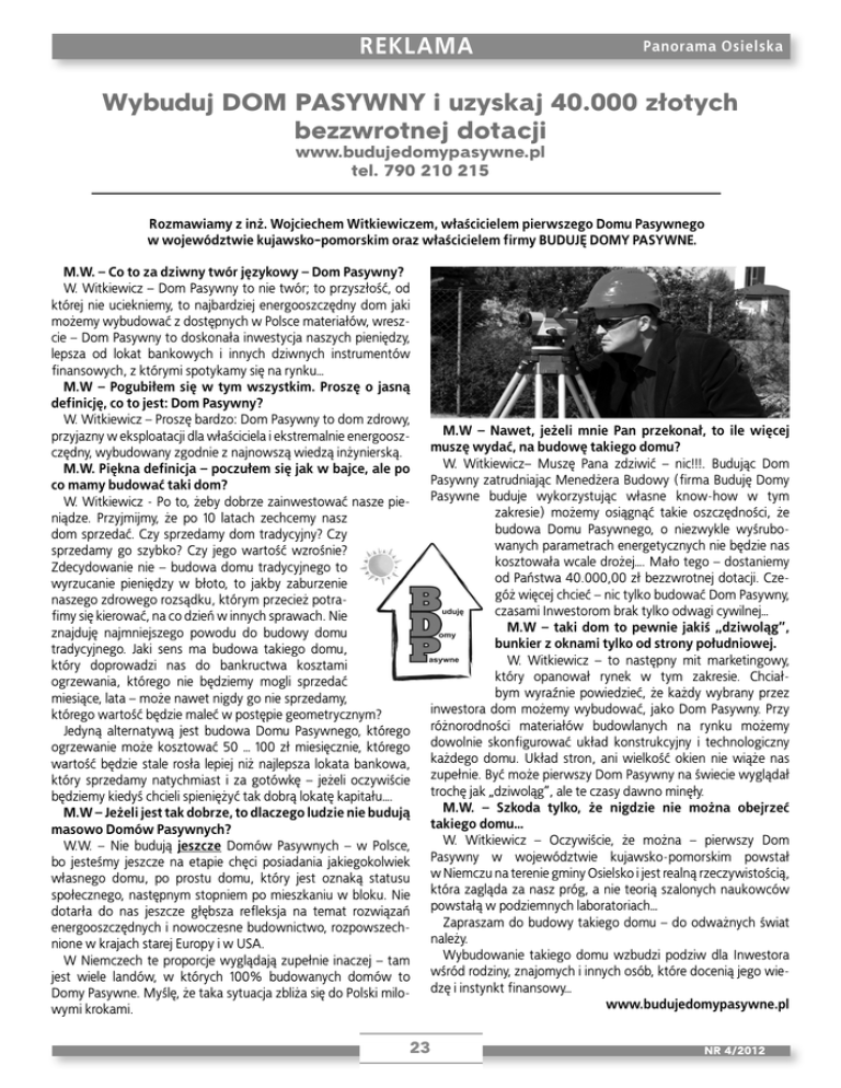 REKLAMA Panorama Osielska Wybuduj DOM PASYWNY i uzyskaj 40.000 złotych bezzwrotnej dotacji www.budujedomypasywne.pl tel. 790 210 215 Rozmawiamy z inż. Wojciechem Witkiewiczem, właścicielem pierwszego Domu Pasywnego w województwie kujawsko-pomorskim oraz właścicielem firmy BUDUJĘ DOMY PASYWNE. M.W. – Co to za dziwny twór językowy – Dom Pasywny? W. Witkiewicz – Dom Pasywny to nie twór; to przyszłość, od której nie uciekniemy, to najbardziej energooszczędny dom jaki możemy wybudować z dostępnych w Polsce materiałów, wreszcie – Dom Pasywny to doskonała inwestycja naszych pieniędzy, lepsza od lokat bankowych i innych dziwnych instrumentów finansowych, z którymi spotykamy się na rynku… M.W – Pogubiłem się w tym wszystkim. Proszę o jasną definicję, co to jest: Dom Pasywny? W. Witkiewicz – Proszę bardzo: Dom Pasywny to dom zdrowy, przyjazny w eksploatacji dla właściciela i ekstremalnie energooszczędny, wybudowany zgodnie z najnowszą wiedzą inżynierską. M.W. Piękna definicja – poczułem się jak w bajce, ale po co mamy budować taki dom? W. Witkiewicz - Po to, żeby dobrze zainwestować nasze pieniądze. Przyjmijmy, że po 10 latach zechcemy nasz dom sprzedać. Czy sprzedamy dom tradycyjny? Czy sprzedamy go szybko? Czy jego wartość wzrośnie? Zdecydowanie nie – budowa domu tradycyjnego to wyrzucanie pieniędzy w błoto, to jakby zaburzenie naszego zdrowego rozsądku, którym przecież potrafimy się kierować, na co dzień w innych sprawach. Nie znajduję najmniejszego powodu do budowy domu tradycyjnego. Jaki sens ma budowa takiego domu, który doprowadzi nas do bankructwa kosztami ogrzewania, którego nie będziemy mogli sprzedać miesiące, lata – może nawet nigdy go nie sprzedamy, którego wartość będzie maleć w postępie geometrycznym? Jedyną alternatywą jest budowa Domu Pasywnego, którego ogrzewanie może kosztować 50 … 100 zł miesięcznie, którego wartość będzie stale rosła lepiej niż najlepsza lokata bankowa, który sprzedamy natychmiast i za gotówkę – jeżeli oczywiście będziemy kiedyś chcieli spieniężyć tak dobrą lokatę kapitału…. M.W – Jeżeli jest tak dobrze, to dlaczego ludzie nie budują masowo Domów Pasywnych? W.W. – Nie budują jeszcze Domów Pasywnych – w Polsce, bo jesteśmy jeszcze na etapie chęci posiadania jakiegokolwiek własnego domu, po prostu domu, który jest oznaką statusu społecznego, następnym stopniem po mieszkaniu w bloku. Nie dotarła do nas jeszcze głębsza refleksja na temat rozwiązań energooszczędnych i nowoczesne budownictwo, rozpowszechnione w krajach starej Europy i w USA. W Niemczech te proporcje wyglądają zupełnie inaczej – tam jest wiele landów, w których 100% budowanych domów to Domy Pasywne. Myślę, że taka sytuacja zbliża się do Polski milowymi krokami. 23 M.W – Nawet, jeżeli mnie Pan przekonał, to ile więcej muszę wydać, na budowę takiego domu? W. Witkiewicz– Muszę Pana zdziwić – nic!!!. Budując Dom Pasywny zatrudniając Menedżera Budowy (firma Buduję Domy Pasywne buduje wykorzystując własne know-how w tym zakresie) możemy osiągnąć takie oszczędności, że budowa Domu Pasywnego, o niezwykle wyśrubowanych parametrach energetycznych nie będzie nas kosztowała wcale drożej…. Mało tego – dostaniemy od Państwa 40.000,00 zł bezzwrotnej dotacji. Czegóż więcej chcieć – nic tylko budować Dom Pasywny, czasami Inwestorom brak tylko odwagi cywilnej… M.W – taki dom to pewnie jakiś „dziwoląg”, bunkier z oknami tylko od strony południowej. W. Witkiewicz – to następny mit marketingowy, który opanował rynek w tym zakresie. Chciałbym wyraźnie powiedzieć, że każdy wybrany przez inwestora dom możemy wybudować, jako Dom Pasywny. Przy różnorodności materiałów budowlanych na rynku możemy dowolnie skonfigurować układ konstrukcyjny i technologiczny każdego domu. Układ stron, ani wielkość okien nie wiąże nas zupełnie. Być może pierwszy Dom Pasywny na świecie wyglądał trochę jak „dziwoląg”, ale te czasy dawno minęły. M.W. – Szkoda tylko, że nigdzie nie można obejrzeć takiego domu… W. Witkiewicz – Oczywiście, że można – pierwszy Dom Pasywny w województwie kujawsko-pomorskim powstał w Niemczu na terenie gminy Osielsko i jest realną rzeczywistością, która zagląda za nasz próg, a nie teorią szalonych naukowców powstałą w podziemnych laboratoriach… Zapraszam do budowy takiego domu – do odważnych świat należy. Wybudowanie takiego domu wzbudzi podziw dla Inwestora wśród rodziny, znajomych i innych osób, które docenią jego wiedzę i instynkt finansowy… www.budujedomypasywne.pl NR 4/2012