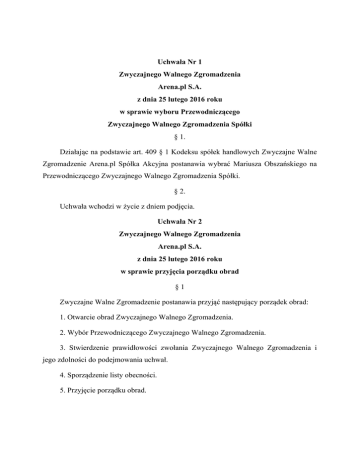 Uchwała Nr 1 Zwyczajnego Walnego Zgromadzenia Arena.pl S.A. z dnia 25 lutego 2016 roku w sprawie wyboru Przewodniczącego Zwyczajnego Walnego Zgromadzenia Spółki § 1. Działając na podstawie art. 409 § 1 Kodeksu spółek handlowych Zwyczajne Walne Zgromadzenie Arena.pl Spółka Akcyjna postanawia wybrać Mariusza Obszańskiego na Przewodniczącego Zwyczajnego Walnego Zgromadzenia Spółki. § 2. Uchwała wchodzi w życie z dniem podjęcia. Uchwała Nr 2 Zwyczajnego Walnego Zgromadzenia Arena.pl S.A. z dnia 25 lutego 2016 roku w sprawie przyjęcia porządku obrad §1 Zwyczajne Walne Zgromadzenie postanawia przyjąć następujący porządek obrad: 1. Otwarcie obrad Zwyczajnego Walnego Zgromadzenia. 2. Wybór Przewodniczącego Zwyczajnego Walnego Zgromadzenia. 3. Stwierdzenie prawidłowości zwołania Zwyczajnego Walnego Zgromadzenia i jego zdolności do podejmowania uchwał. 4. Sporządzenie listy obecności. 5. Przyjęcie porządku obrad. 2 6. Przedstawienie i rozpatrzenie: sprawozdania Zarządu z działalności Spółki za rok obrotowy 2015; sprawozdania finansowego Spółki za rok obrotowy 2015, wniosku Zarządu co do pokrycia straty za rok obrotowy 2015. 7. Przedstawienie i rozpatrzenie sprawozdania Rady Nadzorczej Spółki z wyników oceny: sprawozdania Zarządu z działalności Spółki za rok obrotowy 2015, sprawozdania finansowego Spółki za rok obrotowy 2015; wniosku Zarządu, co do pokrycia straty za rok obrotowy 2015. 8. Przedstawienie rekomendacji Rady Nadzorczej co do udzielenia członkom Zarządu Spółki absolutorium za rok obrotowy 2015. 9. Podjęcie uchwał w przedmiocie: a. zatwierdzenia sprawozdania Zarządu z działalności Spółki za rok obrotowy 2015; b. zatwierdzenia sprawozdania finansowego Spółki za rok obrotowy 2015; c. pokrycia straty Spółki za rok obrotowy 2015; d. udzielenia Członkom Zarządu Spółki absolutorium z wykonania przez nich obowiązków w roku obrotowym 2015; e. udzielenia Członkom Rady Nadzorczej Spółki absolutorium z wykonania przez nich obowiązków w roku obrotowym 2015. 10. Zamknięcie obrad Zwyczajnego Walnego Zgromadzenia. §2 Uchwała wchodzi w życie z dniem podjęcia. Uchwała Nr 3 Zwyczajnego Walnego Zgromadzenia Arena.pl S.A. z dnia 25 lutego 2016 roku w sprawie zatwierdzenia sprawozdania Zarządu z działalności Spółki za rok obrotowy 2015 3 §1 Po rozpatrzeniu sprawozdania Zarządu z działalności Spółki w roku obrotowym 2015, na podstawie art. 395 § 2 pkt 1 KSH Zwyczajne Walne Zgromadzenie postanawia zatwierdzić w całości sprawozdanie Zarządu z działalności Spółki w roku 2015. §2 Uchwała wchodzi w życie z chwilą podjęcia. Uchwała Nr 4 Zwyczajnego Walnego Zgromadzenia Arena.pl S.A. z dnia 25 lutego 2016 roku w sprawie zatwierdzenia sprawozdania finansowego Spółki za rok obrotowy 2015 §1 Po rozpatrzeniu sprawozdania finansowego Spółki za rok obrotowy 2015 obejmującego: 1. wprowadzenie do sprawozdania finansowego, 2. bilans sporządzony na dzień 31 grudnia 2015 roku, zamykający się po stronie aktywów i pasywów kwotą 11.483.371,44 /jedenaście milionów czterysta osiemdziesiąt trzy tysiące trzysta siedemdziesiąt jeden złotych czterdzieści cztery grosze/ złotych, 3. rachunek zysków i strat, wykazujący stratę netto w wysokości 727.914,23 /siedemset dwadzieścia siedem tysięcy dziewięćset czternaście złotych dwadzieścia trzy grosze/ złotych, 4. informację dodatkową. Na podstawie art. 395 § 2 pkt 1 KSH, Zwyczajne Walne Zgromadzenie postanawia zatwierdzić w całości sprawozdanie finansowe Spółki za rok obrotowy 2015. §2 Uchwała wchodzi w życie z chwilą podjęcia. 4 Uchwała Nr 5 Zwyczajnego Walnego Zgromadzenia Arena.pl S.A. z dnia 25 lutego 2016 roku w sprawie pokrycia straty za rok obrotowy 2015 §1 Po zapoznaniu się z wnioskiem Zarządu w sprawie pokrycia straty za rok obrotowy 2015, Zwyczajne Walne Zgromadzenie postanawia, że strata Spółki w wysokości 727.914,23 /siedemset dwadzieścia siedem tysięcy dziewięćset czternaście złotych dwadzieścia trzy grosze/ złotych, zostanie w całości pokryta z zysków Spółki z lat następnych. §2 Uchwała wchodzi w życie z chwilą podjęcia. Uchwała Nr 6 Zwyczajnego Walnego Zgromadzenia Arena.pl S.A. z dnia 25 lutego 2016 roku w sprawie udzielenia absolutorium z wykonania obowiązków Członka Zarządu Spółki w roku obrotowym 2015 Panu Edwardowi Kozickiemu §1 Na podstawie art. 395 §2 pkt 3 KSH, Zwyczajne Walne Zgromadzenia postanawia udzielić Panu Edwardowi Kozickiemu absolutorium z wykonania przez niego obowiązków Członka Zarządu w roku obrotowym 2015. §2 Uchwała wchodzi w życie z chwilą podjęcia. Uchwała Nr 7 Zwyczajnego Walnego Zgromadzenia 5 Arena.pl S.A. z dnia 25 lutego 2016 roku w sprawie udzielenia absolutorium z wykonania obowiązków Prezesa Zarządu w roku obrotowym 2015 Panu Mariuszowi Obszańskiemu §1 Na podstawie art. 395 § 2 pkt 3 KSH, Zwyczajne Walne Zgromadzenia postanawia udzielić Panu Mariuszowi Obszańskiego absolutorium z wykonania przez niego obowiązków Prezesa Zarządu w roku obrotowym 2015, zgodnie z instrukcją głosowania. §2 Uchwała wchodzi w życie z chwilą podjęcia. Uchwała Nr 8 Zwyczajnego Walnego Zgromadzenia Arena.pl S.A. z dnia 25 lutego 2016 roku w sprawie udzielenia absolutorium z wykonania obowiązków członka Rady Nadzorczej w roku obrotowym 2015 Panu Tomaszowi Tylińskiemu §1 Na podstawie art. 395 §2 pkt 3 KSH, Zwyczajne Walne Zgromadzenia postanawia udzielić Panu Tomaszowi Tylińskiemu absolutorium z wykonania przez niego obowiązków członka Rady Nadzorczej w roku obrotowym 2015. §2 Uchwała wchodzi w życie z chwilą podjęcia. Uchwała Nr 9 Zwyczajnego Walnego Zgromadzenia Arena.pl S.A. z dnia 25 lutego 2016 roku w sprawie udzielenia absolutorium z wykonania obowiązków Członka Rady Nadzorczej w roku obrotowym 2015 Pani Marii Bogajewskiej 6 §1 Na podstawie art. 395 §2 pkt 3 KSH, Zwyczajne Walne Zgromadzenia postanawia udzielić Pani Ma