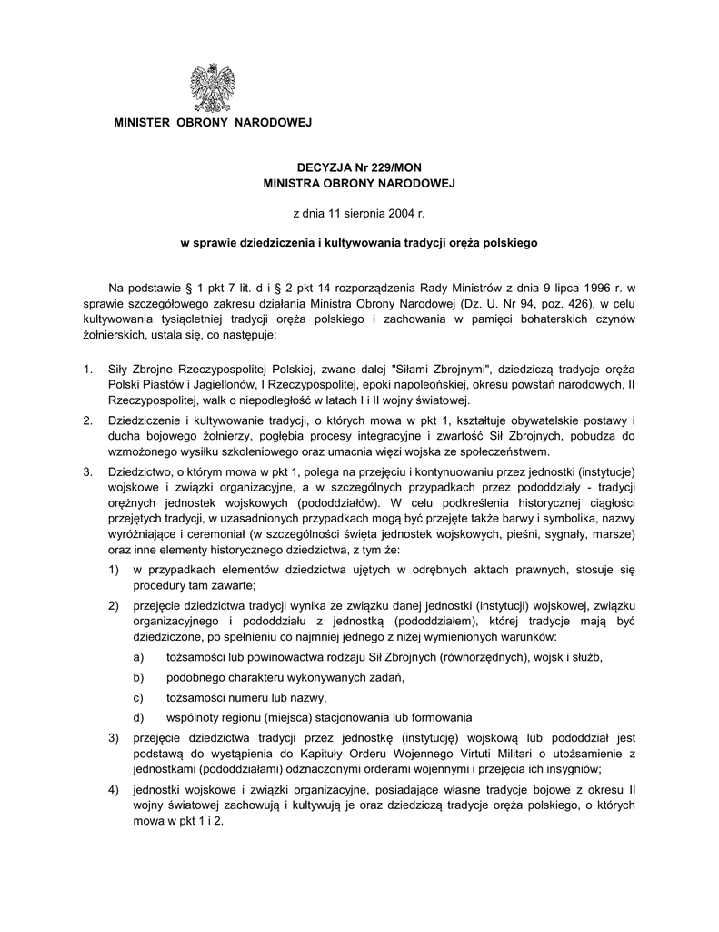 MINISTER OBRONY NARODOWEJ DECYZJA Nr 229/MON MINISTRA OBRONY NARODOWEJ z dnia 11 sierpnia 2004 r. w sprawie dziedziczenia i kultywowania tradycji oręża polskiego Na podstawie § 1 pkt 7 lit. d i § 2 pkt 14 rozporządzenia Rady Ministrów z dnia 9 lipca 1996 r. w sprawie szczegółowego zakresu działania Ministra Obrony Narodowej (Dz. U. Nr 94, poz. 426), w celu kultywowania tysiącletniej tradycji oręża polskiego i zachowania w pamięci bohaterskich czynów żołnierskich, ustala się, co następuje: 1. Siły Zbrojne Rzeczypospolitej Polskiej, zwane dalej "Siłami Zbrojnymi", dziedziczą tradycje oręża Polski Piastów i Jagiellonów, I Rzeczypospolitej, epoki napoleońskiej, okresu powstań narodowych, II Rzeczypospolitej, walk o niepodległość w latach I i II wojny światowej. 2. Dziedziczenie i kultywowanie tradycji, o których mowa w pkt 1, kształtuje obywatelskie postawy i ducha bojowego żołnierzy, pogłębia procesy integracyjne i zwartość Sił Zbrojnych, pobudza do wzmożonego wysiłku szkoleniowego oraz umacnia więzi wojska ze społeczeństwem. 3. Dziedzictwo, o którym mowa w pkt 1, polega na przejęciu i kontynuowaniu przez jednostki (instytucje) wojskowe i związki organizacyjne, a w szczególnych przypadkach przez pododdziały - tradycji orężnych jednostek wojskowych (pododdziałów). W celu podkreślenia historycznej ciągłości przejętych tradycji, w uzasadnionych przypadkach mogą być przejęte także barwy i symbolika, nazwy wyróżniające i ceremoniał (w szczególności święta jednostek wojskowych, pieśni, sygnały, marsze) oraz inne elementy historycznego dziedzictwa, z tym że: 1) w przypadkach elementów dziedzictwa ujętych w odrębnych aktach prawnych, stosuje się procedury tam zawarte; 2) przejęcie dziedzictwa tradycji wynika ze związku danej jednostki (instytucji) wojskowej, związku organizacyjnego i pododdziału z jednostką (pododdziałem), której tradycje mają być dziedziczone, po spełnieniu co najmniej jednego z niżej wymienionych warunków: a) tożsamości lub powinowactwa rodzaju Sił Zbrojnych (równorzędnych), wojsk i służb, b) podobnego charakteru wykonywanych zadań, c) tożsamości numeru lub nazwy, d) wspólnoty regionu (miejsca) stacjonowania lub formowania 3) przejęcie dziedzictwa tradycji przez jednostkę (instytucję) wojskową lub pododdział jest podstawą do wystąpienia do Kapituły Orderu Wojennego Virtuti Militari o utożsamienie z jednostkami (pododdziałami) odznaczonymi orderami wojennymi i przejęcia ich insygniów; 4) jednostki wojskowe i związki organizacyjne, posiadające własne tradycje bojowe z okresu II wojny światowej zachowują i kultywują je oraz dziedziczą tradycje oręża polskiego, o których mowa w pkt 1 i 2. 4. Jednostce wojskowej, związkowi organizacyjnemu i w uzasadnionych przypadkach pododdziałowi, może być nadane imię osoby zajmującej poczesne miejsce w tradycji narodu i oręża polskiego lub szczególnie zasłużonej dla Sił Zbrojnych i obronności Państwa albo osoby, która wykazała się męstwem i odwagą polegającą na dokonaniu bohaterskiego czynu w walce zbrojnej, przy czym: 1) patronem nie może być osoba żyjąca; 2) charakter zasług patrona powinien być zgodny ze specyfiką rodzaju Sił Zbrojnych, wojska lub służby; 3) w wyjątkowych wypadkach patronem może zostać obywatel innego państwa. 4a. Sprawy dotyczące dziedziczenia i kultywowania tradycji oręża polskiego koordynuje komórka organizacyjna Ministerstwa Obrony Narodowej właściwa do spraw tradycji orężnych. 5. 6. Inicjatywę przejęcia dziedzictwa tradycji, przyjęcia nazwy wyróżniającej lub nadania imienia patrona podejmują żołnierze jednostki wojskowej (związku organizacyjnego, pododdziału), z tym że: 1) inicjatorzy powinni zgromadzić materiały historyczne (bibliograficzne) oraz przeprowadzić konsultacje z zainteresowanymi środowiskami; 2) inicjatywa wymaga uzyskania zgody odpowiednio: a) władz organizacji kombatantów, weteranów i rezerwistów, związków broni, kół dywizyjnych lub pułkowych, b) władz administracyjnych lub samorządowych na użycie nazwy miejscowości lub regionu, c) najbliższej rodziny na używanie nazwiska patrona w nazwie jednostki wojskowej (związku organizacyjnego, pododdziału); Z wnioskiem o przejęcie dziedzictwa tradycji, przyjęcie wyróżniającej nazwy lub nadanie imienia patrona dowódca jednostki (instytucji) wojskowej lub związku organizacyjnego występuje do Ministra Obrony Narodowej z zachowaniem drogi służbowej za pośrednictwem Szefa Sztabu Generalnego Wojska Polskiego i dyrektora komórki organizacyjnej Ministerstwa Obrony Narodowej właściwej do spraw tradycji orężnych. 6a. Wnioski, o których mowa w pkt 6, przed przedstawieniem Ministrowi Obrony Narodowej, opiniowane są przez Szefa Sztabu Generalnego Wojska Polskiego oraz Komisję Historyczną do Spraw Symboliki Wojskowej i Tradycji Orężnych Ministerstwa Obrony Narodowej. 6b. Pozytywnie zaopiniowane wnioski przedstawiane są Ministrowi Obrony Narodowej. W przypadku akceptacji wniosku Minister Obrony Narodowej wydaje stosowną decyzję. Wnioski zaopiniowane negatywnie zwracane są wnioskodawcom. 7. Decyzja wchodzi w życie z dniem ogłoszenia, z mocą od dnia podpisania. MINISTER OBRONY NARODOWEJ / - / Tekst jednolity zawierający zmiany ogłoszone w Dz. Urz. MON z 2011 r. Nr 22 poz. 327 oraz z 2013 r. poz. 315