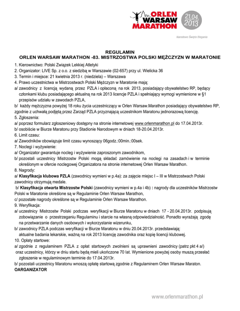 REGULAMIN ORLEN WARSAW MARATHON -83. MISTRZOSTWA POLSKI MĘŻCZYZN W MARATONIE 1. Kierownictwo: Polski Związek Lekkiej Atletyki 2. Organizator: LIVE Sp. z o.o. z siedzibą w Warszawie (02-657) przy ul. Wielicka 36 3. Termin i miejsce: 21 kwietnia 2013 r. (niedziela) – Warszawa 4. Prawo uczestnictwa w Mistrzostwach Polski Mężczyzn w Maratonie mają: a/ zawodnicy z licencją wydaną przez PZLA i opłaconą na rok 2013, posiadający obywatelstwo RP, będący członkami klubu posiadającego aktualną na rok 2013 licencje PZLA i spełniający wymogi wymienione w §1 przepisów udziału w zawodach PZLA, b/ każdy mężczyzna powyżej 18 roku życia uczestniczący w Orlen Warsaw.Marathon posiadający obywatelstwo RP, zgodnie z uchwałą podjętą przez Zarząd PZLA przyznającą uczestnikom Maratonu jednorazową licencję. 5. Zgłoszenia: a/ poprzez formularz zgłoszeniowy dostępny na stronie internetowej www.orlenmarathon.pl do 17.04.2013r. b/ osobiście w Biurze Maratonu przy Stadionie Narodowym w dniach 18-20.04.2013r. 6. Limit czasu: a/ Zawodników obowiązuje limit czasu wynoszący 06godz.:00min.:00sek. 7. Noclegi i wyżywienie: a/ Organizator gwarantuje nocleg i wyżywienie zaproszonym zawodnikom, b/ pozostali uczestnicy Mistrzostw Polski mogą składać zamówienie na noclegi na zasadach i w terminie określonym w ofercie noclegowej Organizatora na stronie internetowej Orlen Warsaw Marathon. 8. Nagrody: a/ Klasyfikacja klubowa PZLA (zawodnicy wymieni w p.4a): za zajęcie miejsc I – III w Mistrzostwach Polski zawodnicy otrzymują medale. b/ Klasyfikacja otwarta Mistrzostw Polski (zawodnicy wymieni w p.4a i 4b) : nagrody dla uczestników Mistrzostw Polski w Maratonie określone są w Regulaminie Orlen Warsaw Marathon, c/ pozostałe nagrody określone są w Regulaminie Orlen Warsaw Marathon. 9. Weryfikacja: a/ uczestnicy Mistrzostw Polski podczas weryfikacji w Biurze Maratonu w dniach 17 - 20.04.2013r. podpisują zobowiązanie o przestrzeganiu Regulaminu i starcie na własną odpowiedzialność. Ponadto wyrażają zgodę na przetwarzanie danych osobowych i wykorzystanie wizerunku, b/ zawodnicy PZLA podczas weryfikacji w Biurze Maratonu w dniu 20.04.2013r. przedstawiają: aktualne badania lekarskie, ważną na rok 2013 licencję zawodnika oraz kopię licencji klubowej. 10. Opłaty startowe: a/ zgodnie z regulaminem PZLA z opłat startowych zwolnieni są uprawnieni zawodnicy (patrz pkt 4 a/) oraz uczestnicy, którzy w dniu startu będą mieli ukończone 70 lat. Wymienione powyżej osoby muszą przesłać zgłoszenie w regulaminowym terminie do 17.04.2013r. b/ pozostali uczestnicy Maratonu wnoszą opłatę startową zgodnie z Regulaminem Orlen Warsaw Maraton. OARGANIZATOR