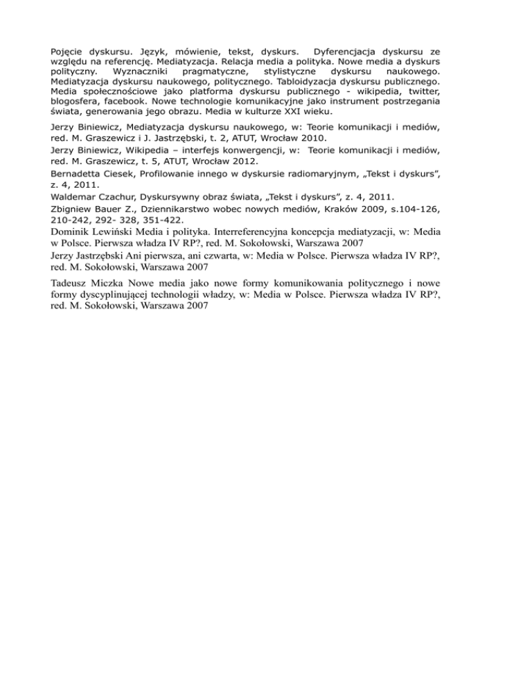 Pojęcie dyskursu. Język, mówienie, tekst, dyskurs. Dyferencjacja dyskursu ze względu na referencję. Mediatyzacja. Relacja media a polityka. Nowe media a dyskurs polityczny. Wyznaczniki pragmatyczne, stylistyczne dyskursu naukowego. Mediatyzacja dyskursu naukowego, politycznego. Tabloidyzacja dyskursu publicznego. Media społecznościowe jako platforma dyskursu publicznego - wikipedia, twitter, blogosfera, facebook. Nowe technologie komunikacyjne jako instrument postrzegania świata, generowania jego obrazu. Media w kulturze XXI wieku. Jerzy Biniewicz, Mediatyzacja dyskursu naukowego, w: Teorie komunikacji i mediów, red. M. Graszewicz i J. Jastrzębski, t. 2, ATUT, Wrocław 2010. Jerzy Biniewicz, Wikipedia – interfejs konwergencji, w: Teorie komunikacji i mediów, red. M. Graszewicz, t. 5, ATUT, Wrocław 2012. Bernadetta Ciesek, Profilowanie innego w dyskursie radiomaryjnym, „Tekst i dyskurs”, z. 4, 2011. Waldemar Czachur, Dyskursywny obraz świata, „Tekst i dyskurs”, z. 4, 2011. Zbigniew Bauer Z., Dziennikarstwo wobec nowych mediów, Kraków 2009, s.104-126, 210-242, 292- 328, 351-422. Dominik Lewiński Media i polityka. Interreferencyjna koncepcja mediatyzacji, w: Media w Polsce. Pierwsza władza IV RP?, red. M. Sokołowski, Warszawa 2007 Jerzy Jastrzębski Ani pierwsza, ani czwarta, w: Media w Polsce. Pierwsza władza IV RP?, red. M. Sokołowski, Warszawa 2007 Tadeusz Miczka Nowe media jako nowe formy komunikowania politycznego i nowe formy dyscyplinującej technologii władzy, w: Media w Polsce. Pierwsza władza IV RP?, red. M. Sokołowski, Warszawa 2007