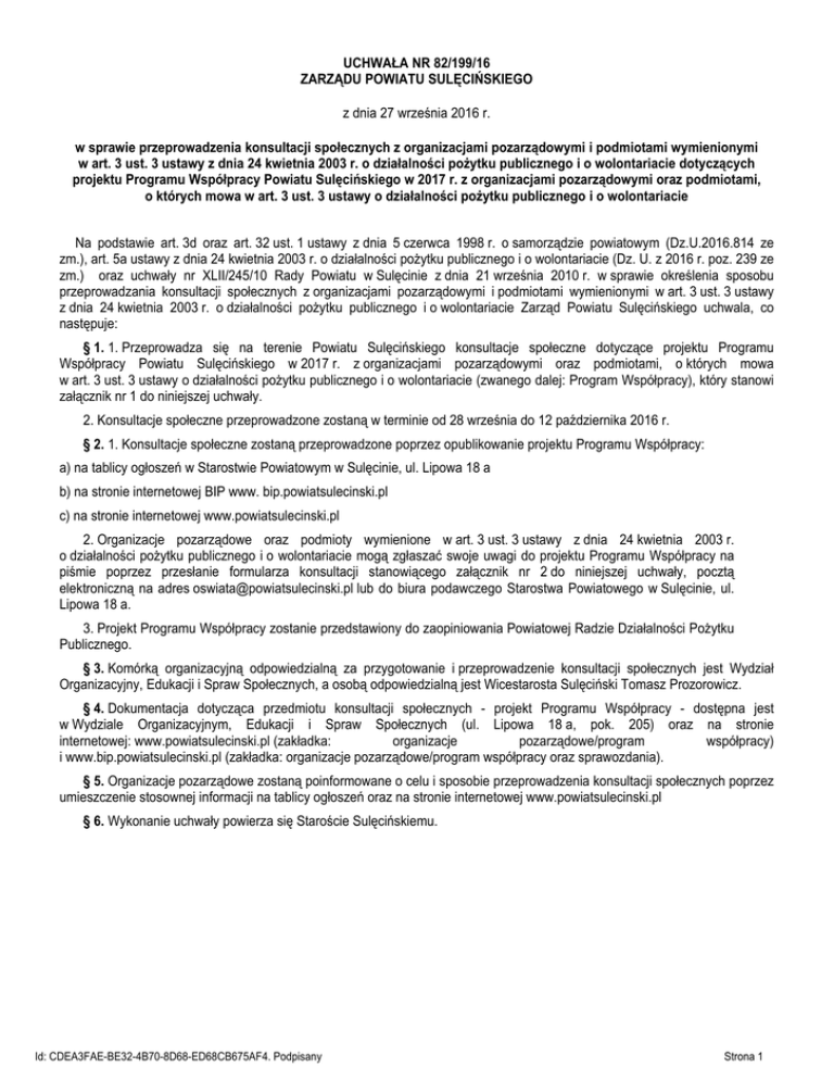 UCHWAŁA NR 82/199/16 ZARZĄDU POWIATU SULĘCIŃSKIEGO z dnia 27 września 2016 r. w sprawie przeprowadzenia konsultacji społecznych z organizacjami pozarządowymi i podmiotami wymienionymi w art. 3 ust. 3 ustawy z dnia 24 kwietnia 2003 r. o działalności pożytku publicznego i o wolontariacie dotyczących projektu Programu Współpracy Powiatu Sulęcińskiego w 2017 r. z organizacjami pozarządowymi oraz podmiotami, o których mowa w art. 3 ust. 3 ustawy o działalności pożytku publicznego i o wolontariacie Na podstawie art. 3d oraz art. 32 ust. 1 ustawy z dnia 5 czerwca 1998 r. o samorządzie powiatowym (Dz.U.2016.814 ze zm.), art. 5a ustawy z dnia 24 kwietnia 2003 r. o działalności pożytku publicznego i o wolontariacie (Dz. U. z 2016 r. poz. 239 ze zm.) oraz uchwały nr XLII/245/10 Rady Powiatu w Sulęcinie z dnia 21 września 2010 r. w sprawie określenia sposobu przeprowadzania konsultacji społecznych z organizacjami pozarządowymi i podmiotami wymienionymi w art. 3 ust. 3 ustawy z dnia 24 kwietnia 2003 r. o działalności pożytku publicznego i o wolontariacie Zarząd Powiatu Sulęcińskiego uchwala, co następuje: § 1. 1. Przeprowadza się na terenie Powiatu Sulęcińskiego konsultacje społeczne dotyczące projektu Programu Współpracy Powiatu Sulęcińskiego w 2017 r. z organizacjami pozarządowymi oraz podmiotami, o których mowa w art. 3 ust. 3 ustawy o działalności pożytku publicznego i o wolontariacie (zwanego dalej: Program Współpracy), który stanowi załącznik nr 1 do niniejszej uchwały. 2. Konsultacje społeczne przeprowadzone zostaną w terminie od 28 września do 12 października 2016 r. § 2. 1. Konsultacje społeczne zostaną przeprowadzone poprzez opublikowanie projektu Programu Współpracy: a) na tablicy ogłoszeń w Starostwie Powiatowym w Sulęcinie, ul. Lipowa 18 a b) na stronie internetowej BIP www. bip.powiatsulecinski.pl c) na stronie internetowej www.powiatsulecinski.pl 2. Organizacje pozarządowe oraz podmioty wymienione w art. 3 ust. 3 ustawy z dnia 24 kwietnia 2003 r. o działalności pożytku publicznego i o wolontariacie mogą zgłaszać swoje uwagi do projektu Programu Współpracy na piśmie poprzez przesłanie formularza konsultacji stanowiącego załącznik nr 2 do niniejszej uchwały, pocztą elektroniczną na adres [email protected] lub do biura podawczego Starostwa Powiatowego w Sulęcinie, ul. Lipowa 18 a. 3. Projekt Programu Współpracy zostanie przedstawiony do zaopiniowania Powiatowej Radzie Działalności Pożytku Publicznego. § 3. Komórką organizacyjną odpowiedzialną za przygotowanie i przeprowadzenie konsultacji społecznych jest Wydział Organizacyjny, Edukacji i Spraw Społecznych, a osobą odpowiedzialną jest Wicestarosta Sulęciński Tomasz Prozorowicz. § 4. Dokumentacja dotycząca przedmiotu konsultacji społecznych - projekt Programu Współpracy - dostępna jest w Wydziale Organizacyjnym, Edukacji i Spraw Społecznych (ul. Lipowa 18 a, pok. 205) oraz na stronie internetowej: www.powiatsulecinski.pl (zakładka: organizacje pozarządowe/program współpracy) i www.bip.powiatsulecinski.pl (zakładka: organizacje pozarządowe/program współpracy oraz sprawozdania). § 5. Organizacje pozarządowe zostaną poinformowane o celu i sposobie przeprowadzenia konsultacji społecznych poprzez umieszczenie stosownej informacji na tablicy ogłoszeń oraz na stronie internetowej www.powiatsulecinski.pl § 6. Wykonanie uchwały powierza się Staroście Sulęcińskiemu. Id: CDEA3FAE-BE32-4B70-8D68-ED68CB675AF4. Podpisany Strona 1 § 7. Uchwała wchodzi w życie z dniem podjęcia. Starosta Sulęciński Adam Basiński Id: CDEA3FAE-BE32-4B70-8D68-ED68CB675AF4. Podpisany Strona 2 Załącznik Nr 1 do Uchwały Nr 82/199/16 Zarządu Powiatu Sulęcińskiego z dnia 27 września 2016 r. Projekt Programu Współpracy w roku 2017 Powiatu Sulęcińskiego z organizacjami pozarządowymi oraz podmiotami, o których mowa w art. 3 ust. 3 ustawy o działalności pożytku publicznego i o wolontariacie § 1. Wstęp 1. Program Współpracy w roku 2017 Powiatu Sulęcińskiego z organizacjami pozarządowymi oraz podmiotami, o których mowa w art. 3 ust. 3 ustawy o działalności pożytku publicznego i o wolontariacie określa ogólne formy, zasady oraz zakres współpracy Powiatu Sulęcińskiego z organizacjami pozarządowymi prowadzącymi na terenie powiatu sulęcińskiego działalność statutową w zakresie odpowiadającym zadaniom ustawowym powiatu. Definiuje on ponadto priorytety zadań, których wykonanie wiąże się z udzieleniem pomocy publicznej realizującym je organizacją. 2. Ilekroć w niniejszym Programie jest mowa o: 1) ustawie – rozumie się przez to ustawę z dnia 24 kwietnia 2003 roku o działalności pożytku publicznego i o wolontariacie (Dz. U. z 2016 r., poz. 239 z późn. zm.), 2) organizacji – rozumie się przez to organizacje pozarządowe i podmioty, o których mowa w art. 3 ust. 3 ustawy o działalności pożytku publicznego i o wolontariacie, 3) programie – rozumie się przez to program współpracy w roku 2017 Powiatu Sulęcińskiego z organizacjami pozarządowymi oraz podmiotami, o których mowa w art. 3 ust. 3 ustawy o działalności pożytku publicznego i o wolontariacie, 4) powiecie – rozumie się przez to Powiat Sulęciński, 5) konkursie - rozumie się przez to otwarty konkurs ofert. § 2. Cele Programu 1. Głównym celem programu jest skuteczne działanie na rzecz poprawy jakości życia mieszkańców poprzez rozwijanie współpracy powiatu z organizacjami. 2. Cele szczegółowe to: 1) wspieranie działań na rzecz umacniania istniejących i pobudzania nowych inicjatyw realizowanych przez organizacje działające w powiecie dla dobra lokalnej społeczności; 2) umacnianie w społecznej świadomości poczucia odpowiedzialności za rozwój lokalnego środowiska; 3) integracja i wspólne działanie organizacji pozarządowych i powiatu dążące do realizacji sfery zadań publicznych wymienionych w art. 4 us