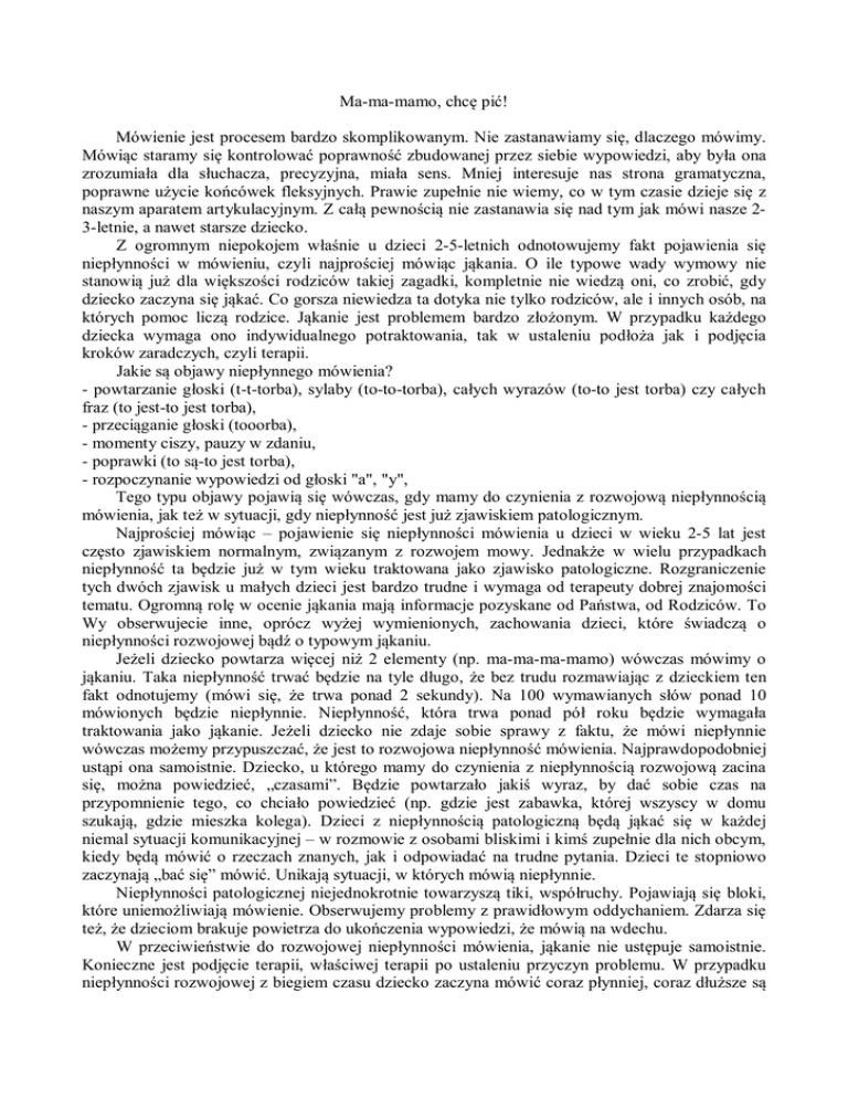 Ma-ma-mamo, chcę pić! Mówienie jest procesem bardzo skomplikowanym. Nie zastanawiamy się, dlaczego mówimy. Mówiąc staramy się kontrolować poprawność zbudowanej przez siebie wypowiedzi, aby była ona zrozumiała dla słuchacza, precyzyjna, miała sens. Mniej interesuje nas strona gramatyczna, poprawne użycie końcówek fleksyjnych. Prawie zupełnie nie wiemy, co w tym czasie dzieje się z naszym aparatem artykulacyjnym. Z całą pewnością nie zastanawia się nad tym jak mówi nasze 23-letnie, a nawet starsze dziecko. Z ogromnym niepokojem właśnie u dzieci 2-5-letnich odnotowujemy fakt pojawienia się niepłynności w mówieniu, czyli najprościej mówiąc jąkania. O ile typowe wady wymowy nie stanowią już dla większości rodziców takiej zagadki, kompletnie nie wiedzą oni, co zrobić, gdy dziecko zaczyna się jąkać. Co gorsza niewiedza ta dotyka nie tylko rodziców, ale i innych osób, na których pomoc liczą rodzice. Jąkanie jest problemem bardzo złożonym. W przypadku każdego dziecka wymaga ono indywidualnego potraktowania, tak w ustaleniu podłoża jak i podjęcia kroków zaradczych, czyli terapii. Jakie są objawy niepłynnego mówienia? - powtarzanie głoski (t-t-torba), sylaby (to-to-torba), całych wyrazów (to-to jest torba) czy całych fraz (to jest-to jest torba), - przeciąganie głoski (tooorba), - momenty ciszy, pauzy w zdaniu, - poprawki (to są-to jest torba), - rozpoczynanie wypowiedzi od głoski "a", "y", Tego typu objawy pojawią się wówczas, gdy mamy do czynienia z rozwojową niepłynnością mówienia, jak też w sytuacji, gdy niepłynność jest już zjawiskiem patologicznym. Najprościej mówiąc – pojawienie się niepłynności mówienia u dzieci w wieku 2-5 lat jest często zjawiskiem normalnym, związanym z rozwojem mowy. Jednakże w wielu przypadkach niepłynność ta będzie już w tym wieku traktowana jako zjawisko patologiczne. Rozgraniczenie tych dwóch zjawisk u małych dzieci jest bardzo trudne i wymaga od terapeuty dobrej znajomości tematu. Ogromną rolę w ocenie jąkania mają informacje pozyskane od Państwa, od Rodziców. To Wy obserwujecie inne, oprócz wyżej wymienionych, zachowania dzieci, które świadczą o niepłynności rozwojowej bądź o typowym jąkaniu. Jeżeli dziecko powtarza więcej niż 2 elementy (np. ma-ma-ma-mamo) wówczas mówimy o jąkaniu. Taka niepłynność trwać będzie na tyle długo, że bez trudu rozmawiając z dzieckiem ten fakt odnotujemy (mówi się, że trwa ponad 2 sekundy). Na 100 wymawianych słów ponad 10 mówionych będzie niepłynnie. Niepłynność, która trwa ponad pół roku będzie wymagała traktowania jako jąkanie. Jeżeli dziecko nie zdaje sobie sprawy z faktu, że mówi niepłynnie wówczas możemy przypuszczać, że jest to rozwojowa niepłynność mówienia. Najprawdopodobniej ustąpi ona samoistnie. Dziecko, u którego mamy do czynienia z niepłynnością rozwojową zacina się, można powiedzieć, „czasami”. Będzie powtarzało jakiś wyraz, by dać sobie czas na przypomnienie tego, co chciało powiedzieć (np. gdzie jest zabawka, której wszyscy w domu szukają, gdzie mieszka kolega). Dzieci z niepłynnością patologiczną będą jąkać się w każdej niemal sytuacji komunikacyjnej – w rozmowie z osobami bliskimi i kimś zupełnie dla nich obcym, kiedy będą mówić o rzeczach znanych, jak i odpowiadać na trudne pytania. Dzieci te stopniowo zaczynają „bać się” mówić. Unikają sytuacji, w których mówią niepłynnie. Niepłynności patologicznej niejednokrotnie towarzyszą tiki, współruchy. Pojawiają się bloki, które uniemożliwiają mówienie. Obserwujemy problemy z prawidłowym oddychaniem. Zdarza się też, że dzieciom brakuje powietrza do ukończenia wypowiedzi, że mówią na wdechu. W przeciwieństwie do rozwojowej niepłynności mówienia, jąkanie nie ustępuje samoistnie. Konieczne jest podjęcie terapii, właściwej terapii po ustaleniu przyczyn problemu. W przypadku niepłynności rozwojowej z biegiem czasu dziecko zaczyna mówić coraz płynniej, coraz dłuższe są okresy poprawy. Czasami jest tak, że rodzice zauważają, kiedy zaczęło się niepłynne mówienie, a nie potrafią powiedzieć, kiedy ustąpiło. Było i po prostu minęło. Bez względu na to, z którym zjawiskiem mamy do czynienia, naszą rolą jako rodziców będzie obserwowanie dziecka. W żadnym wypadku nie wolno nam upominać i poprawiać, wymagać by dziecko mówiło płynnie. „Nie jąkaj się” powinno przestać istnieć w naszych komunikatach do dziecka. Gdyby mogło z całą pewnością by tego nie robiło. Nie wolno nam kończyć za dziecko wypowiedzi, pomagać mu, gdy o coś prosi, coś opowiada. Nie wyręczajmy, nie mówmy za dziecko. Co możemy zrobić? Mówmy wolniej. Dajmy dziecku i sobie czas na rozmowę, niech nie przebiega ona w pośpiechu, w drodze między jednym a drugim zajęciem. Czkajmy aż dziecko skończy mówić to, co zaczęło. Ono musi wiedzieć, że gdy zechce z nami rozmawiać znajdziemy dla niego czas. Kiedy już pojawi się niepłynne mówienie– może zamiast mówić pośpiewajmy swoje prośby. Osoby jąkające się nie mają tego problemu właśnie podczas śpiewania. Niepłynność jest z całą pewnością problemem, z którym należy się zgłosić do specjalisty. Czasami będzie to logopeda specjalizujący się w terapii jąkania (balbutolog), czasami psycholog. Jąkania nie należy leczyć farmakologicznie, ponieważ po zaprzestaniu podawania leków wróci z jeszcze większym nasileniem. Jest to pomoc doraźna, a chodzi przecież o to, by dziecko w przyszłości mogło normalnie funkcjonować. mgr Dorota E. Matejko surdopedagog logopeda - balbutolog