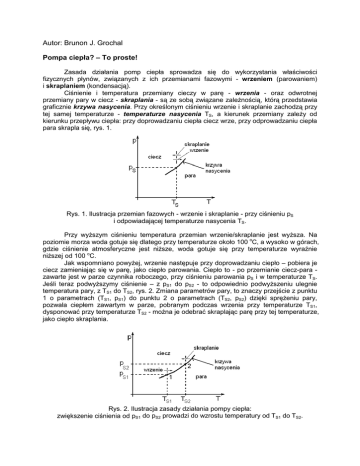Autor: Brunon J. Grochal Pompa ciepła? – To proste! Zasada działania pomp ciepła sprowadza się do wykorzystania właściwości fizycznych płynów, związanych z ich przemianami fazowymi - wrzeniem (parowaniem) i skraplaniem (kondensacją). Ciśnienie i temperatura przemiany cieczy w parę - wrzenia - oraz odwrotnej przemiany pary w ciecz - skraplania - są ze sobą związane zaleŜnością, którą przedstawia graficznie krzywa nasycenia. Przy określonym ciśnieniu wrzenie i skraplanie zachodzą przy tej samej temperaturze - temperaturze nasycenia TS, a kierunek przemiany zaleŜy od kierunku przepływu ciepła: przy doprowadzaniu ciepła ciecz wrze, przy odprowadzaniu ciepła para skrapla się, rys. 1. Rys. 1. Ilustracja przemian fazowych - wrzenie i skraplanie - przy ciśnieniu pS i odpowiadającej temperaturze nasycenia TS. Przy wyŜszym ciśnieniu temperatura przemian wrzenie/skraplanie jest wyŜsza. Na poziomie morza woda gotuje się dlatego przy temperaturze około 100 oC, a wysoko w górach, gdzie ciśnienie atmosferyczne jest niŜsze, woda gotuje się przy temperaturze wyraźnie niŜszej od 100 oC. Jak wspomniano powyŜej, wrzenie następuje przy doprowadzaniu ciepło – pobiera je ciecz zamieniając się w parę, jako ciepło parowania. Ciepło to - po przemianie ciecz-para zawarte jest w parze czynnika roboczego, przy ciśnieniu parowania pS i w temperaturze TS. Jeśli teraz podwyŜszymy ciśnienie – z pS1 do pS2 - to odpowiednio podwyŜszeniu ulegnie temperatura pary, z TS1 do TS2, rys. 2. Zmiana parametrów pary, to znaczy przejście z punktu 1 o parametrach (TS1, pS1) do punktu 2 o parametrach (TS2, pS2) dzięki spręŜeniu pary, pozwala ciepłem zawartym w parze, pobranym podczas wrzenia przy temperaturze TS1, dysponować przy temperaturze TS2 - moŜna je odebrać skraplając parę przy tej temperaturze, jako ciepło skraplania. Rys. 2. Ilustracja zasady działania pompy ciepła: zwiększenie ciśnienia od pS1 do pS2 prowadzi do wzrostu temperatury od TS1 do TS2. I to juŜ wszystko, na tym właśnie zasadza się praca spręŜarkowej parowej pompy ciepła: spręŜarka podwyŜsza ciśnienie pary, naturalnie podwyŜszając przy tym odpowiednio temperaturę nasycenia pary - i tym samym przenosząc w parze ciepło z temperatury niŜszej do wyŜszej. Przy niŜszej temperaturze (TS1) czynnik roboczy pobiera ciepło parowania, przy wyŜszej temperaturze (TS2) oddaje to ciepło jako ciepło skraplania. W rzeczywistości obieg czynnika roboczego jest trochę bardziej skomplikowany, co wynika z dąŜenia do lepszego wykorzystania własności fizycznych oraz pewnych uwarunkowań technicznych, na przykład konieczności uniknięcia przedostawania się cieczy do spręŜarki. Nie zmienia to jednak absolutnie zasady działania, a schemat ideowy układu pompy ciepła moŜna przedstawić jak na rys. 3. Rys. 3. Schemat poglądowy obiegu czynnika roboczego w spręŜarkowej parowej pompie ciepła: pd = pS1, pg = pS2, Qd - ciepło pobierane z dolnego źródła, Le - praca spręŜarki, Qg - ciepło oddawane w górnym źródle. [źródło: A. Syrocka, praca dyplomowa, PG, 2010] Co więc trzeba zrobić, aby wykorzystać opisane zjawiska? Po pierwsze, naleŜy ciśnienie pS1 obniŜyć tak, aby temperatura TS1 była niŜsza od temperatury ośrodka (dolnego źródła ciepła), z którego pobieramy ciepło parowania. ZauwaŜmy od razu, Ŝe moŜemy ciepło Qd pobierać - odpowiednio obniŜając ciśnienie pS1 i tym samym temperaturę wrzenia TS1 - z gruntu, z wody, z powietrza, nawet ze śniegu czy z lodu (śnieg i lód teŜ moŜna schładzać!). Po drugie, naleŜy ciśnienie pS2 osiągnąć takie, aby temperatura pary TS2 była wyŜsza od temperatury ośrodka (górnego źródła ciepła), któremu ma być przekazywane ciepło Qg skraplania pary czynnika roboczego. Według opisanej zasady działają pompy ciepła oraz chłodziarki (lodówki), które róŜnią się jedynie zakresami temperatury, w których pracują, oraz oczywiście celem działania pompy ciepła mają dostarczać ciepło (takŜe przy względnie wysokiej temperaturze), chłodziarki mają usuwać ciepło (nawet przy względnie niskiej temperaturze). Do zakresu temperatury, w którym ma działać pompa ciepła, moŜna dobrać czynnik roboczy najlepiej nadający się do pracy w danym zakresie temperatury. Na rys. 4 pokazane są zaleŜności wiąŜące temperaturę nasycenia TS oraz ciśnienie nasycenia pS - czyli krzywe nasycenia pS(TS) - kilku płynów stosowanych w technice chłodniczej i grzewczej jako czynniki robocze transportujące ciepło. Rys. 4. Krzywe nasycenia wybranych czynników roboczych. (R-744 - ditlenek węgla CO2; R-717 - amoniak NH3; R-290 - propan C3H8) Obecnie wielką uwagę przywiązuje się do zapewnienia bezpieczeństwa ekologicznego środowiska naturalnego, i w związku z tym dąŜy się do wykorzystywania naturalnych czynników roboczych, do których naleŜą m. in. ditlenek węgla CO2, amoniak NH3 czy węglowodory, na przykład propan C3H8. Efektywność pompy ciepła Bilans energetyczny pompy ciepła wynikający z rys. 3 pozwala na określenie współczynnika wydajności cieplnej εP pompy ciepła, definiowanego jako stosunek ilości ciepła do dyspozycji uŜytkownika Qg do energii doprowadzanej jako praca spręŜarki Le , εP = Qg/Le albo, wobec Qg = (Le + Qd), εP = (Le + Qd)/Le = 1 + (Qd/Le) = 1 + εZ gdzie stosunek εZ = (Qd/Le) jest współczynnikiem wydajności chłodniczej, odgrywającym naturalnie pierwszorzędną rolę w chłodnictwie. W polskiej literaturze współczynniki wydajności cieplnej i chłodniczej oznaczane są takŜe, odpowiednio, jako ϕP i ϕZ. Powszechnie obecnie stosowane, takŜe w Polsce, jest oznaczenie współczynnika wydajności cieplnej pompy ciepła jako COP (z ang. - Coefficient Of Performance). Dla całej instalacji ogrzewania, po stronie dostarczania ciepła, bardziej miarodajny pod względem oceny efektywności jest współczynnik SPF = Q/W, rys. 5 (z ang. - Seasonal P