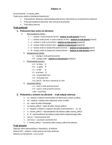 Edytor vi Uruchomienie: vi nazwa_pliku Tryby pracy edytora (działania klawiatury): • Tryb poleceń (klawisze odpowiadają poleceniom; domyślny po uruchomieniu edytora) • Tryb wprowadzania (pisania) (jak maszyna do pisania) • Tryb edycji wiersza Tryb poleceń 1. Polecenia bez echa na ekranie: a. Wprowadzanie tekstu • i – wstaw 1 znak przed kursorem– wejście w tryb pisania (insert) • I – wstaw znaki przed 1-szym znakiem w linii – wejście w tryb pisania (insert) • a – wstaw 1 znak za kursorem– wejście w tryb pisania (append) • A – wstaw znaki na końcu linii – wejście w tryb pisania (append) • o – wstaw znaki w nowej linii pod kursorem – wejście w tryb pisania (open) • O – wstaw znaki w nowej linii nad kursorem – wejście w tryb pisania (open) b. Zastępowanie tekstu • r – zastąp 1 znak pod kursorem • R – zastąp znaki - wejście w tryb pisania (replace) c. Przesuwanie kursora • h – w lewo ← • k – w górę ↑ • j – w dół ↓ • l – w prawo → • 0 – na początek linii • $ – na koniec linii • nr_linii G – do linii o numerze nr_linii d. Usuwanie tekstu • x – usuń 1 znak pod kursorem • X – usuń 1 znak przed kursorem • dd – usuń linię 2. Polecenia z echem na ekranie - tryb edycji wiersza • • • • • • • • • • :q – wyjście z edytora (niemożliwe po dokonaniu zmian w pliku) :q! – wyjście z edytora bez zapisania zmian w pliku :w – zapis do pliku bieżącego :w nazwa_pliku2 – zapis do pliku nazwa_pliku2 :x – wyjście z edytora z zapisem do pliku (równoważne z :w :q) :e nazwa_pliku2 – wprowadzenie do edytora pliku nazwa_pliku2 :e # – wprowadzenie do edytora poprzednio edytowanego pliku :set nu – numerowanie linii :set nonu – usunięcie numerów linii :r nazwa_pliku2 – wczytanie pliku nazwa_pliku2 do edytora Tryb pisania Zapisuje tekst wprowadzany z klawiatury w buforze Klawisz ESC – wyjście z trybu pisania do trybu poleceń; Wejście w tryb pisania: a,A,i,I,o,O,R