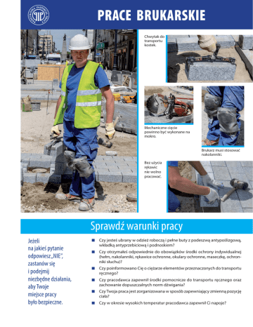 PRACE BRUKARSKIE Chwytak do transportu kostek. Mechaniczne cięcie powinno być wykonane na mokro. Brukarz musi stosować nakolanniki. Bez użycia rękawic nie wolno pracować. Sprawdź warunki pracy Jeżeli na jakieś pytanie odpowiesz „NIE”, zastanów się i podejmij niezbędne działania, aby Twoje miejsce pracy było bezpieczne. Czy jesteś ubrany w odzież roboczą i pełne buty z podeszwą antypoślizgową, wkładką antyprzebiciową i podnoskiem? Czy otrzymałeś odpowiednie do obowiązków środki ochrony indywidualnej (hełm, nakolanniki, rękawice ochronne, okulary ochronne, maseczkę, ochronniki słuchu)? Czy poinformowano Cię o ciężarze elementów przeznaczonych do transportu ręcznego? Czy pracodawca zapewnił środki pomocnicze do transportu ręcznego oraz zachowanie dopuszczalnych norm dźwigania? Czy Twoja praca jest zorganizowana w sposób zapewniający zmienną pozycję ciała? Czy w okresie wysokich temperatur pracodawca zapewnił Ci napoje? Odzież robocza i ochronna Do prac brukarskich może przystąpić pracownik ubrany w odzież roboczą, dostosowaną do pory roku, rękawice robocze oraz pełne buty z podeszwą antypoślizgową, wkładką antyprzebiciową i podnoskiem chroniącym palce. Powinien być również wyposażony w: hełm ochronny z aktualną datą ważności, określoną przez producenta, nakolanniki, okulary ochronne i ochronniki słuchu niezbędne przy mechanicznym cięciu kostki, maseczkę przeciwpyłową przy mechanicznym cięciu kostki na sucho, kamizelkę ochronną. Przed przystąpieniem do pracy brukarz powinien przejść instruktaż stanowiskowy i zostać zapoznany z instrukcjami bezpiecznej obsługi urządzeń wykorzystywanych w pracy. pracować w rękawicach antywibracyjnych i w ochron- nikach słuchu. Osoby przebywające w pobliżu pracującej zagęszczarki powinny także używać ochronników słuchu. Brukarz obsługujący urządzenie do mechanicznego cięcia kostek i krawężników powinien: nosić okulary ochronne, ochronniki słuchu oraz masecz- kę przeciwpyłową (przy cięciu na sucho), mechaniczne cięcie na sucho wykonywać wyłącznie w miejscu, w którym powstający pył nie będzie zagrażał osobom pracującym na innych stanowiskach oraz osobom postronnym, w miarę możliwości mechaniczne cięcie kostek i kra- wężników wykonywać na mokro, aby ograniczyć pylenie, elementy cięte położyć na blatach na wysokości pozwa- lającej wykonywać cięcie w wyprostowanej pozycji. Osoba przygotowująca mieszankę cementową powinna: Organizacja pracy pracować w okularach ochronnych, rękawicach nieprze- Przy wykonywaniu prac brukarskich należy: puszczalnych oraz w maseczce ochronnej, teren wygrodzić, a w obrębie czynnych ulic oznakować przy stosowaniu mechanicznego mieszadła pamiętać go znakami drogowymi, pracowników poinformować o ciężarze poszczególnych elementów przeznaczonych do transportu ręcznego, osoby podające kostki przestrzec, aby zachowały ostrożność i nie narażały na uderzenie pracujących w pozycji klęczącej, końcówki prętów zbrojeniowych, na których zaczepione są sznurki poziomujące, zabezpieczyć gumowymi grzybkami. brukarzom pracującym w pozycji klęczącej zapewnić nakolanniki i nakazać bezwzględne ich stosowanie, co jakiś czas robić przerwy, podczas których pracownicy powinni wykonywać pracę w innej pozycji. Takie postępowanie odciąży układ mięśniowo-szkieletowy. jeśli temperatura powietrza wynosi powyżej 250C, zapewnić napoje pracownikom. Kostki i krawężniki powinno się transportować przy użyciu sprzętu pomocniczego, o tym, aby przewód zasilający miał pełną izolację i był zabezpieczony przed wilgocią oraz uszkodzeniami mechanicznymi. Nie wolno! Przekraczać dopuszczalnych norm dźwigania. Obsługiwać urządzenia z uszkodzoną izolacją przewodów zasilających oraz ze zdemontowanymi lub uszkodzonymi osłonami. Pracować w pozycji klęczącej bez nakolanników. Ciąć elementy mechanicznie na sucho bez stosowania okularów ochronnych i maseczki ochronnej. Szczególne okoliczności Obsługa urządzeń Przy wykonywaniu prac z użyciem elektronarzędzi, za- Brukarz obsługujący zagęszczarkę do gruntu powinien: poznaj się z kartą „Prace elektronarzędziami”. mieć książeczkę operatora zagęszczarek wydaną przez Podczas prac brukarskich wykonywane są prace zwią- Instytut Mechanizacji Budownictwa i Górnictwa Skalnego w Warszawie, zane z ręcznym dźwiganiem. Zapoznaj się z kartą „Ręczne prace transportowe”. © Państwowa Inspekcja Pracy 13021/01/00
