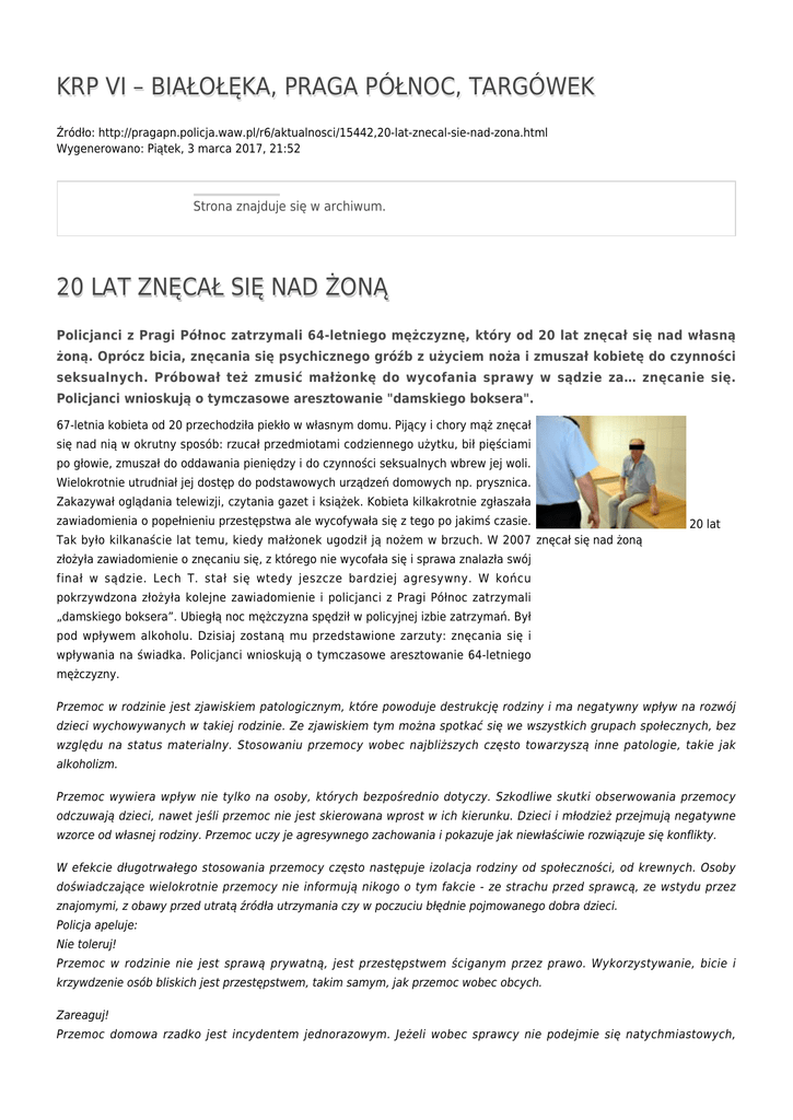 KRP VI – BIAŁOŁĘKA, PRAGA PÓŁNOC, TARGÓWEK Źródło: http://pragapn.policja.waw.pl/r6/aktualnosci/15442,20-lat-znecal-sie-nad-zona.html Wygenerowano: Piątek, 3 marca 2017, 21:52 Strona znajduje się w archiwum. 20 LAT ZNĘCAŁ SIĘ NAD ŻONĄ Policjanci z Pragi Północ zatrzymali 64-letniego mężczyznę, który od 20 lat znęcał się nad własną żoną. Oprócz bicia, znęcania się psychicznego gróźb z użyciem noża i zmuszał kobietę do czynności seksualnych. Próbował też zmusić małżonkę do wycofania sprawy w sądzie za… znęcanie się. Policjanci wnioskują o tymczasowe aresztowanie "damskiego boksera". 67-letnia kobieta od 20 przechodziła piekło w własnym domu. Pijący i chory mąż znęcał się nad nią w okrutny sposób: rzucał przedmiotami codziennego użytku, bił pięściami po głowie, zmuszał do oddawania pieniędzy i do czynności seksualnych wbrew jej woli. Wielokrotnie utrudniał jej dostęp do podstawowych urządzeń domowych np. prysznica. Zakazywał oglądania telewizji, czytania gazet i książek. Kobieta kilkakrotnie zgłaszała zawiadomienia o popełnieniu przestępstwa ale wycofywała się z tego po jakimś czasie. 20 lat Tak było kilkanaście lat temu, kiedy małżonek ugodził ją nożem w brzuch. W 2007 znęcał się nad żoną złożyła zawiadomienie o znęcaniu się, z którego nie wycofała się i sprawa znalazła swój finał w sądzie. Lech T. stał się wtedy jeszcze bardziej agresywny. W końcu pokrzywdzona złożyła kolejne zawiadomienie i policjanci z Pragi Północ zatrzymali „damskiego boksera”. Ubiegłą noc mężczyzna spędził w policyjnej izbie zatrzymań. Był pod wpływem alkoholu. Dzisiaj zostaną mu przedstawione zarzuty: znęcania się i wpływania na świadka. Policjanci wnioskują o tymczasowe aresztowanie 64-letniego mężczyzny. Przemoc w rodzinie jest zjawiskiem patologicznym, które powoduje destrukcję rodziny i ma negatywny wpływ na rozwój dzieci wychowywanych w takiej rodzinie. Ze zjawiskiem tym można spotkać się we wszystkich grupach społecznych, bez względu na status materialny. Stosowaniu przemocy wobec najbliższych często towarzyszą inne patologie, takie jak alkoholizm. Przemoc wywiera wpływ nie tylko na osoby, których bezpośrednio dotyczy. Szkodliwe skutki obserwowania przemocy odczuwają dzieci, nawet jeśli przemoc nie jest skierowana wprost w ich kierunku. Dzieci i młodzież przejmują negatywne wzorce od własnej rodziny. Przemoc uczy je agresywnego zachowania i pokazuje jak niewłaściwie rozwiązuje się konflikty. W efekcie długotrwałego stosowania przemocy często następuje izolacja rodziny od społeczności, od krewnych. Osoby doświadczające wielokrotnie przemocy nie informują nikogo o tym fakcie - ze strachu przed sprawcą, ze wstydu przez znajomymi, z obawy przed utratą źródła utrzymania czy w poczuciu błędnie pojmowanego dobra dzieci. Policja apeluje: Nie toleruj! Przemoc w rodzinie nie jest sprawą prywatną, jest przestępstwem ściganym przez prawo. Wykorzystywanie, bicie i krzywdzenie osób bliskich jest przestępstwem, takim samym, jak przemoc wobec obcych. Zareaguj! Przemoc domowa rzadko jest incydentem jednorazowym. Jeżeli wobec sprawcy nie podejmie się natychmiastowych, stanowczych działań - przemoc się powtórzy. Policja zwykle jest wzywana w ekstremalnych sytuacjach, czasami zbyt późno. Pamiętaj! Masz prawo bronić się przed osobą, która krzywdzi Ciebie i Twoją rodzinę. ah Ocena: 0/5 (0) Tweetnij