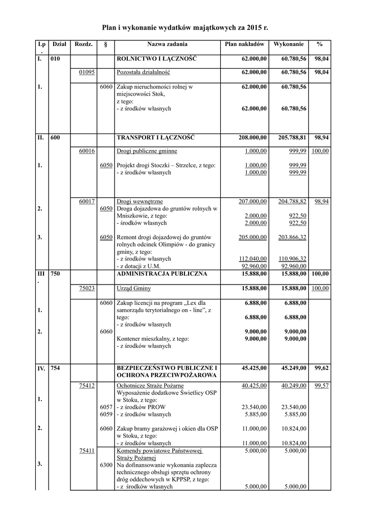 Plan i wykonanie wydatków majątkowych za 2015 r. (kliknij)