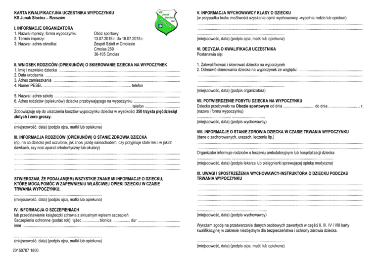 KARTA KWALIFIKACYJNA UCZESTNIKA WYPOCZYNKU KS Junak Słocina – Rzeszów I. INFORMACJE ORGANIZATORA 1. Nazwa imprezy, forma wypoczynku: 2. Termin imprezy: 3. Nazwa i adres ośrodka: Obóz sportowy 13.07.2015 r. do 18.07.2015 r. Zespół Szkół w Cmolasie Cmolas 269 36-105 Cmolas II. WNIOSEK RODZICÓW (OPIEKUNÓW) O SKIEROWANIE DZIECKA NA WYPOCZYNEK 1. Imię i nazwisko dziecka ...................................................................................................................... 2. Data urodzenia ................................................................................................................................... 3. Adres zamieszkania ........................................................................................................................... 4. Numer PESEL ..................................................................................... telefon ............................................................................................................................. .................................... 5. Nazwa i adres szkoły .......................................................................................................................... 6. Adres rodziców (opiekunów) dziecka przebywającego na wypoczynku ............................................. .................................................................................................................. telefon .................................. Zobowiązuję się do uiszczenia kosztów wypoczynku dziecka w wysokości 350 trzysta pięćdziesiąt złotych i zero groszy. ................................. ................................................... (miejscowość, data) (podpis ojca, matki lub opiekuna) III. INFORMACJA RODZICÓW (OPIEKUNÓW) O STANIE ZDROWIA DZIECKA (np. na co dziecko jest uczulone, jak znosi jazdę samochodem, czy przyjmuje stale leki i w jakich dawkach, czy nosi aparat ortodontyczny lub okulary) ................................................................................................................................................................. ................................................................................................................................................................. ................................................................................................................................................................. ................................................................................................................................................................. STWIERDZAM, ŻE PODAŁAM(EM) WSZYSTKIE ZNANE MI INFORMACJE O DZIECKU, KTÓRE MOGĄ POMÓC W ZAPEWNIENIU WŁAŚCIWEJ OPIEKI DZIECKU W CZASIE TRWANIA WYPOCZYNKU. ................................. ................................................... (miejscowość, data) (podpis ojca, matki lub opiekuna) IV. INFORMACJA O SZCZEPIENIACH lub przedstawienie książeczki zdrowia z aktualnym wpisem szczepień: Szczepienia ochronne (podać rok): tężec ..............., błonica ................, dur ......................................... inne ......................................................................................................................................................... ................................. ................................................... (miejscowość, data) (podpis ojca, matki lub opiekuna) 20150707 1800 V. INFORMACJA WYCHOWAWCY KLASY O DZIECKU (w przypadku braku możliwości uzyskania opinii wychowawcy -wypełnia rodzic lub opiekun) ................................................................................................................................................................. ................................................................................................................................................................. ................................. ................................................... (miejscowość, data) (podpis ojca, matki lub opiekuna) VI. DECYZJA O KWALIFIKACJI UCZESTNIKA Postanawia się: 1. Zakwalifikować i skierować dziecko na wypoczynek 2. Odmówić skierowania dziecka na wypoczynek ze względu: .............................................................. ................................................................................................................................................................. ................................................................................................................................................................. ................................. ................................................... (miejscowość, data) (podpis organizatora) VII. POTWIERDZENIE POBYTU DZIECKA NA WYPOCZYNKU Dziecko przebywało na Obozie sportowym od dnia .............................. do dnia .. ......................... .. r. (nazwa i forma wypoczynku) ................................. ................................ (miejscowość, data) (podpis wychowawcy) VIII. INFORMACJE O STANIE ZDROWIA DZIECKA W CZASIE TRWANIA WYPOCZYNKU (dane o zachorowanych, urazach, leczeniu itp.) ................................................................................................................................................................. ................................................................................................................................................................. Organizator informuje rodziców o leczeniu ambulatoryjnym lub hospitalizacji dziecka ................................. .................................................................................................. (miejscowość, data) (podpis lekarza lub pielęgniarki sprawującej opiekę medyczna) IX. UWAGI I SPOSTRZEŻENIA WYCHOWAWCY-INSTRUKTORA O DZIECKU PODCZAS TRWANIA WYPOCZYNKU ........................................................................................................