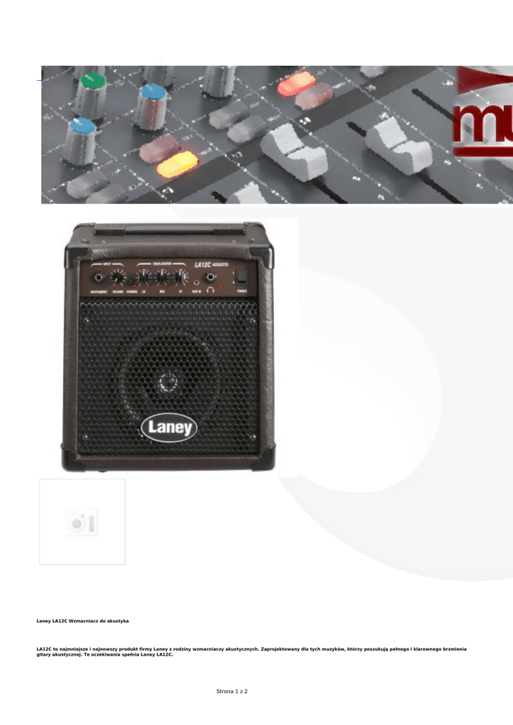 Laney LA12C Wzmacniacz do akustyka LA12C to najmniejsze i najnowszy produkt firmy Laney z rodziny wzmacniaczy akustycznych. Zaprojektowany dla tych muzyków, którzy poszukują pełnego i klarownego brzmienia gitary akustycznej. Te oczekiwania spełnia Laney LA12C. Strona 1 z 2 MOC: RMS 12 Watts GNIAZDA WEJŚCIA: 1x Jack KANAŁY: 1 KOREKCJA BARWY TONU: Bass, Mid & Hi LINE In Aux In GŁOŚNIK: 1 x 6.5" Custom Co-Axial OBUDOWA: metalowe narożniki i metalowy grill EFEKTY: Chorus GNIAZDO SŁUCHAWKOWE WAGA: 6.5kg WYMIARY:310 x 281x215 (HxWxD) mm Prezentacja na YouTube: http://www.youtube.com/watch?v=9P7ndTOnatg Strona 2 z 2