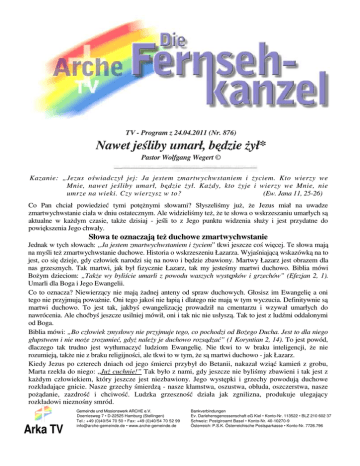 TV - Program z 24.04.2011 (Nr. 876) Nawet jeśliby umarł, będzie żył* Pastor Wolfgang Wegert © Kazanie: „Jezus oświadczył jej: Ja jestem zmartwychwstaniem i życiem. Kto wierzy we Mnie, nawet jeśliby umarł, będzie żył. Każdy, kto żyje i wierzy we Mnie, nie umrze na wieki. Czy wierzysz w to? (Ew. Jana 11, 25-26) Co Pan chciał powiedzieć tymi potężnymi słowami? Słyszeliśmy już, że Jezus miał na uwadze zmartwychwstanie ciała w dniu ostatecznym. Ale widzieliśmy też, że te słowa o wskrzeszaniu umarłych są aktualne w każdym czasie, także dzisiaj - jeśli to z Jego punktu widzenia służy i jest przydatne do powiększenia Jego chwały. Słowa te oznaczają też duchowe zmartwychwstanie Jednak w tych słowach: „Ja jestem zmartwychwstaniem i życiem” tkwi jeszcze coś więcej. Te słowa mają na myśli też zmartwychwstanie duchowe. Historia o wskrzeszeniu Łazarza. Wyjaśniającą wskazówką na to jest, co się dzieje, gdy człowiek narodzi się na nowo i będzie zbawiony. Martwy Łazarz jest obrazem dla nas grzesznych. Tak martwi, jak był fizycznie Łazarz, tak my jesteśmy martwi duchowo. Biblia mówi Bożym dzieciom: „Także wy byliście umarli z powodu waszych występków i grzechów” (Efezjan 2, 1). Umarli dla Boga i Jego Ewangelii. Co to oznacza? Niewierzący nie mają żadnej anteny od spraw duchowych. Głosisz im Ewangelię a oni tego nie przyjmują poważnie. Oni tego jakoś nie łapią i dlatego nie mają w tym wyczucia. Definitywnie są martwi duchowo. To jest tak, jakbyś ewangelizację prowadził na cmentarzu i wzywał umarłych do nawrócenia. Ale choćbyś jeszcze usilniej mówił, oni i tak nic nie usłyszą. Tak to jest z ludźmi oddalonymi od Boga. Biblia mówi: „Bo człowiek zmysłowy nie przyjmuje tego, co pochodzi od Bożego Ducha. Jest to dla niego głupstwem i nie może zrozumieć, gdyż należy je duchowo rozsądzać” (1 Koryntian 2, 14). To jest powód, dlaczego tak trudno jest wytłumaczyć ludziom Ewangelię. Nie tkwi to w braku inteligencji, że nie rozumieją, także nie z braku religijności, ale tkwi to w tym, że są martwi duchowo - jak Łazarz. Kiedy Jezus po czterech dniach od jego śmierci przybył do Betanii, nakazał wziąć kamień z grobu, Marta rzekła do niego: „Już cuchnie!” Tak było z nami, gdy jeszcze nie byliśmy zbawieni i tak jest z każdym człowiekiem, który jeszcze jest niezbawiony. Jego występki i grzechy powodują duchowe rozkładające gnicie. Nasze grzechy śmierdzą - nasze kłamstwa, oszustwa, obłuda, oszczerstwa, nasze pożądanie, zazdrość i chciwość. Ludzka grzeszność działa jak zgnilizna, produkuje ulegający rozkładowi nieznośny smród. Arka TV Gemeinde und Missionswerk ARCHE e.V. Doerriesweg 7 • D-22525 Hamburg (Stellingen) Tel.: +49 (0)40/54 70 50 • Fax: +49 (0)40/54 70 52 99 [email protected] • www.arche-gemeinde.de Bankverbindungen Ev. Darlehensgenossenschaft eG Kiel • Konto-Nr. 113522 • BLZ 210 602 37 Schweiz: Postgiroamt Basel • Konto-Nr. 40-10270-9 Österreich: P.S.K. Österreichische Postsparkasse • Konto-Nr. 7726.796 Strona 2 - TV-Program 876 / „Choćby i umarły, żyć będzie“ Dlaczego sytuacja w naszym społeczeństwie jest taka jak wygląda? Przeczytaj gazetę, obejrzyj wiadomości. Każdego dnia rozlew krwi, bójka na noże, przemoc w rodzinie, wykorzystywanie dzieci, przestępstwa przeciwko środowisku, zatrucia pokarmowe, terror, wojny, wyzysk i lichwiarstwo, perwersja, niewierność, cudzołóstwa, nękanie, mobbing, przekupstwo i korupcja. A o Chrystusie ci ludzie nie chcą słyszeć! Dlaczego tak jest? Oni leżą w grobie i gniją i nie mogą spostrzec tego co Boskie. List do Rzymian opisuje duchową sytuację ludzi bez Chrystusa w bezwzględny sposób. Czytamy: „nie ma sprawiedliwego, ani jednego, nie ma rozumnego, nie ma takiego, który by szukał Boga. Wszyscy zbłądzili, wszyscy okazali się przewrotni, nie ma takiego, kto postępowałby godziwie, nie ma ani jednego. Gardło ich jest grobem otwartym. Swoim językiem dopuszczają się oszustw. Na ich wargach jad żmijowy. Usta ich pełne są przekleństwa i zgorzknienia. Nogi ich są skore do rozlewu krwi, spustoszenie i nędza na ich drogach” (Rzymian 3, 10-16). Jest to opis martwego Łazarza. Taka jest nasza sytuacja. „Wszyscy zepsuci” mówi List do Rzymian. Tak więc Biblia używa greckiego słowa, że jesteśmy podobni do zepsutego jedzenia. Nie nadający się do spożycia, tylko do wyrzucenia. I czasami ludzie mówią już o sobie samych, że ich przypadek, dokładnie jak Łazarza, jest beznadziejny. Ale co musiało się stać z Łazarzem, aby zaistniała tu jeszcze nadzieja? Czy musi się pozbierać i ze wszystkich sił próbować, stać się lepszym człowiekiem? Czy musi zrobić więcej dobrych uczynków? Ale jak on to ma zrobić? Przecież jest martwy! On musi się nawrócić i pokutować? Tak, to byłoby dobre, ale jak to zrobić? Przecież nie żyje! Już cuchnie! To oznacza, że nie ma nikogo, kto mógłby sam z siebie nawrócić się do Boga, z własnej inicjatywy dążyć do zbawienia, kto właściwie z własnej woli mógłby nawrócić się do Chrystusa. To nie idzie, ponieważ duchowo nic nie słyszy i jest martwy w dziedzinie spraw Bożych. Jest tylko jedna nadzieja, a ona oznacza wskrzeszenie z zewnątrz. Jeśli masz jeszcze nadzieję, to nie leży w tobie, ale w samym Synu Bożym. Twoje zbawienie od A do Z pochodzi lub nie od Jezusa. Czytamy w naszej historii, że podszedł do grobu Łazarza i zawołał donośnym głosem: „Łazarzu, wyjdź! I wyszedł umarły” (werset 42-44). Tak musi też stać się z tobą. Ja wierzę, że Jezus faktycznie przez to kazanie wkracza do twojego grobu i ciebie właśnie teraz woła: „Łazarzu, wyjdź!” I z tego wezwania przychodzi życie do ciebie, i dopiero wtedy jesteś w stanie zostawić swoje stare życie i rozpocząć nowe. Czego się z tego uczymy? My wszyscy potrzebujemy wskrzeszenia. Dlatego powiedział o