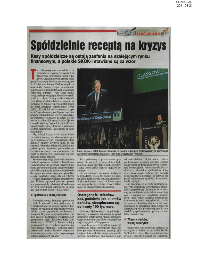 PRZEGL¡D 2011-08-21 I o spółdzielczości - Spółdzielnie receptą na kryzys Kasy spółdzielcze są ostoją zaufania na szalejącym rynku finansowym, a polskie SKOK-i stawiane są za wzór o, co działo się w ostatnich dniach i ty godniach na światowych rynkach fi nansowych, przyprawiło wielu o ból głowy. Obniżenie przez agencję ratin gowa Standard & Poor's oceny wiarygodno ści kredytowej Stanów Zjednoczonych za owocowało dramatycznym załamaniem kursów akcji spółek giełdowych w Ameryce Północnej, Europie i Azji. Cena franka szwajcarskiego osiągnęła niezwykle wysoki poziom, co było fatalną wiadomością dla tych, którzy wzięli kredyty w tej walucie. In formacja, że Bank of America został pozwa ny przez American International Group (AIG) o 10 mld dol. odszkodowania za „po tężne" oszustwo na rynku hipotecznym, na brała w tym kontekście wręcz symboliczne go znaczenia. A wszystko to działo się, mi mo że po roku 2008 rządy Stanów Zjedno czonych, Wielkiej Brytanii, Irlandii i Francji wpompowały biliony dolarów w ratowanie sektora finansowego. Rzecz jasna, na koszt podatników. T MCmadl of Grdit Uniom .rfCrtdi'11"'0"' My, których kryzys w tak ostrej formie szczęśliwie ominął, nie zdajemy sobie spra tfi V wy ze skali nieszczęść i rozczarowań, które dotknęły miliony zwykłych ludzi po obu stronach Atlantyku. Wiele osób, oprócz ma jątków i pracy, utraciło też poczucie bezpie czeństwa socjalnego i zaczęło rozumieć, że Prezes Krajowej SKOK, Grzegorz Bierecki, na zjeździe w Glasgow został wybrany na pierwszego świat, w którym żyją, podzielony jest bar wiceprzewodniczącego Światowej Rady Unii Kredytowych (WOCCU). dziej, niż im się zdawało. Zerwane więzi międzyludzkie i osłabione Świat podzielony na pracodawców i pra odpowiedzialności. Spółdzielnie, zwłasz zaufanie społeczne musiały w konsekwen cobiorców, na tych, co mają dużo i tych, cza finansowe, wykazały przy tym większą cji doprowadzić do zachowań skrajnych. Pół którzy nie mają nic, stał się niebezpieczny. efektywność od firm działających w syste biedy, gdy przybierają one pokojowe formy I coraz więcej osób z różnych krajów to do mie komercyjnym. Amerykańskie, brytyj skie czy irlandzkie spółdzielcze kasy jak w Hiszpanii, gdzie tysiące młodych osób, strzega. domagając się zmian, okupowały place Bar Nie ma idealnych rozwiązań. Zwłaszcza oszczędnościowo-kredytowe nie musiały celony i Madrytu. Gorzej, gdy jak w Grecji w gospodarce. To, co dziś wydaje się słusz prosić rządów o pieniądze, by ratować się i Wielkiej Brytanii górę bierze agresja i prze ne, jutro może stać się przyczyną kłopotów. przed ogłoszeniem upadłości. Przeciwnie, moc. Kolejne tygodnie i miesiące z pewno Stąd poszukiwania rozwiązań, które zapew miały nadwyżki. ścią przyniosą falę publikacji, których auto nią większe bezpieczeństwo. Czymś takim Nic dziwnego, że wzrosło zainteresowa rzy będą poszukiwali odpowiedzi na pyta może się okazać system spółdzielczy. nie tymi sposobami prowadzenia działal nia: „Jak do tego doszło?" i „Co robić?". ności gospodarczej. Zwłaszcza że w dłuż szej perspektywie spółdzielnie umacniają coś, co nazywa się „kapitałem społecz Oszczędności członków • Spółdzielnie budzą zaufanie Taki wzrost zaufania społecznego kas, podobnie jak klientów nym". i umocnienie więzi międzyludzkich, które Z drugiej strony, działacze spółdzielczy są przecież fundamentami ruchu spół z wielu krajów od dawna przekonują, że banków, ubezpieczone sq dzielczego, w przyszłości mogą okazać się w zglobalizowanym świecie wielkich kor do kwoty 100 tys. euro. alternatywą dla przeżywającego kryzys poracji, ze względu na brak zróżnicowania, rośnie ryzyko pojawienia się kolejnych W Stanach Zjednoczonych i innych krajach modelu gospodarowania, opartego na bru kryzysów. O tym m.in. dyskutowali uczest dotkniętych kryzysem zauważono, że przed talnej konkurencji. nicy lipcowej konferencji w Glasgow, zor siębiorstwa oparte na tym modelu gospodaro ganizowanej przez Światową Radę Unii wania przetrwały trudny okres w znacznie lep • Więcej członków, Kredytowych (WOCCU). Po raz kolejny szej kondycji niż spółki prywatne. więcej depozytów przypomnieli oni, że jedynie poprzez upo Ujawniły się przy tym walory społeczne wszechnienie własności i wspólną przed spółdzielni. Mniej osób straciło pracę, nie Przykładem tego, co można osiągnąć, są siębiorczość można łagodzić negatywne było potrzeby drastycznej redukcji płac działające w Polsce od początku lat 90. konsekwencje zmian, które przyniosło po i najważniejsze - kadra zarządzająca miała Spółdzielcze Kasy Oszczędnościowo-Kre wstanie globalnych rynków. większą świadomość spoczywającej nań dytowe. Rok 2010 okazał się kolejnym, PRZEGL¡D 2011-08-21 "U To spółdzielczości i' w którym SKOK-i odnotowały dynamiczny rozwój. Wzrosła liczba członków Kas oraz wartość powierzonych im depozytów i ak tywów, którymi dysponują. Kasy zrzeszają ponad 2,2 mln Polaków, którzy powierzyli im 13,5 mld depozytów. O tym sukcesie zdecydowała powszechność i dostępność usług. To także dowód zaufania, jakim Po lacy obdarzyli kasy. Zwłaszcza że dziś ofe rują one swoim członkom atrakcyjniejsze oprocentowanie depozytów od propono wanego przez większość banków komer cyjnych. Ze statystyk przedsiębiorstw działających na Pomorzu wynika, że kryzys lat 2008-2009 nie powstrzymał rozwoju SKOK-ów. Kasa Stefczyka jest dziś czwartym największym pracodawcą w regionie pomorskim. Za trudnia ponad 2 tys. osób. W ubiegłym ro ku wypracowała jeden z najwyższych zy sków brutto - 183 mln zł. W 2011 r. popra wiła go w ciągu pięciu miesięcy, zyskując 440 mln zł brutto. Wśród największych po morskich pracodawców było też Towarzy stwo Finansowe SKOK Z kolei Tow