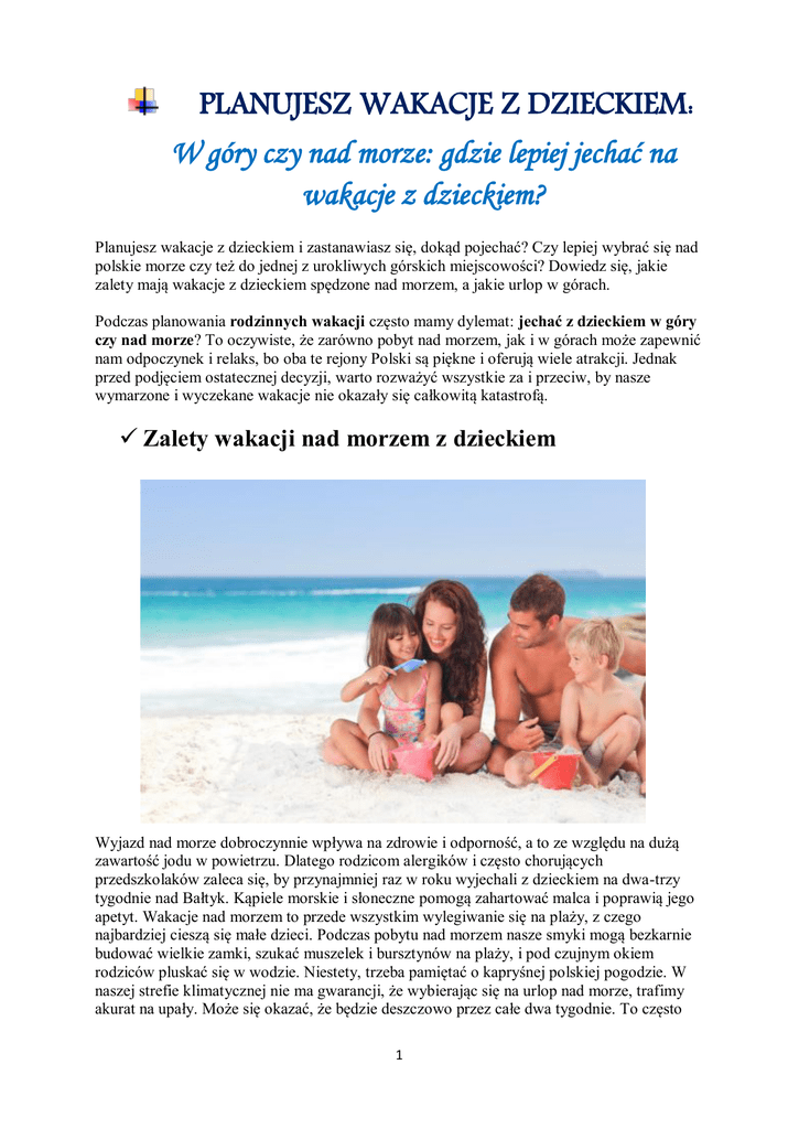 PLANUJESZ WAKACJE Z DZIECKIEM: W góry czy nad morze: gdzie lepiej jechać na wakacje z dzieckiem? Planujesz wakacje z dzieckiem i zastanawiasz się, dokąd pojechać? Czy lepiej wybrać się nad polskie morze czy też do jednej z urokliwych górskich miejscowości? Dowiedz się, jakie zalety mają wakacje z dzieckiem spędzone nad morzem, a jakie urlop w górach. Podczas planowania rodzinnych wakacji często mamy dylemat: jechać z dzieckiem w góry czy nad morze? To oczywiste, że zarówno pobyt nad morzem, jak i w górach może zapewnić nam odpoczynek i relaks, bo oba te rejony Polski są piękne i oferują wiele atrakcji. Jednak przed podjęciem ostatecznej decyzji, warto rozważyć wszystkie za i przeciw, by nasze wymarzone i wyczekane wakacje nie okazały się całkowitą katastrofą. Zalety wakacji nad morzem z dzieckiem Wyjazd nad morze dobroczynnie wpływa na zdrowie i odporność, a to ze względu na dużą zawartość jodu w powietrzu. Dlatego rodzicom alergików i często chorujących przedszkolaków zaleca się, by przynajmniej raz w roku wyjechali z dzieckiem na dwa-trzy tygodnie nad Bałtyk. Kąpiele morskie i słoneczne pomogą zahartować malca i poprawią jego apetyt. Wakacje nad morzem to przede wszystkim wylegiwanie się na plaży, z czego najbardziej cieszą się małe dzieci. Podczas pobytu nad morzem nasze smyki mogą bezkarnie budować wielkie zamki, szukać muszelek i bursztynów na plaży, i pod czujnym okiem rodziców pluskać się w wodzie. Niestety, trzeba pamiętać o kapryśnej polskiej pogodzie. W naszej strefie klimatycznej nie ma gwarancji, że wybierając się na urlop nad morze, trafimy akurat na upały. Może się okazać, że będzie deszczowo przez całe dwa tygodnie. To często 1 zniechęca przed wakacjami nad Bałtykiem. By uniknąć rozczarowań i mimo wszystko skorzystać z pobytu nad morzem, warto przygotować plan awaryjny na wypadek brzydkiej pogody. Sprawdźmy wcześniej, gdzie można się wybrać na rowerowe czy piesze wycieczki – niektóre nadmorskie miejscowości są bardzo urokliwe i pełne ciekawych miejsc oraz zabytków, które warto zobaczyć. Sprawdźmy, czy w wybranej miejscowości są miejsca specjalnie przeznaczone dla dzieci – bajlandie, parki rozrywki czy basen. Weźmy też ze sobą ulubione zabawki i książeczki dziecka, a dla całej rodziny gry planszowe – wówczas nawet brzydka pogoda nad morzem nie zepsuje nam humoru. Zalety wakacji w górach z dzieckiem W góry najlepiej wybrać się ze starszymi dziećmi, choć prawdziwi wielbiciele górskich szlaków i rodzice, którzy lubią aktywny wypoczynek, niechętnie rezygnują z pobytu w górach i nawet z małymi szkrabami jadą na wakacje w Beskidy czy Tatry. Warto wiedzieć, że surowy klimat górski również dobroczynnie wpływa na odporność – górskie powietrze jest wskazane dla dzieci ze skłonnościami do infekcji dróg oddechowych i astmy. Pogoda w górach jest bardzo zmienna – zdarza się, że rano mamy przenikliwy chłód, a po południu upał i spiekotę. Jednak malownicze górskie krajobrazy rekompensują nam te niedogodności. Wakacje w górach to przede wszystkim piesze wycieczki po często trudnych i wymagających szlakach, to dlatego zdecydowanie lepiej na taki urlop wybrać się ze starszymi dziećmi, które łatwiej zniosą trudy kilkugodzinnych marszów. Jeśli chcemy w góry pojechać z małym dzieckiem, lepiej wybierzmy niższe Beskidy lub Bieszczady, albo tak zaplanujmy pobyt w górach, by nie był uciążliwy dla malca i dla nas. Najlepiej, jeśli wybierzemy się do miejscowości, która oferuje wiele atrakcji dla rodzin z dziećmi lub gospodarstwa agroturystycznego. 2
